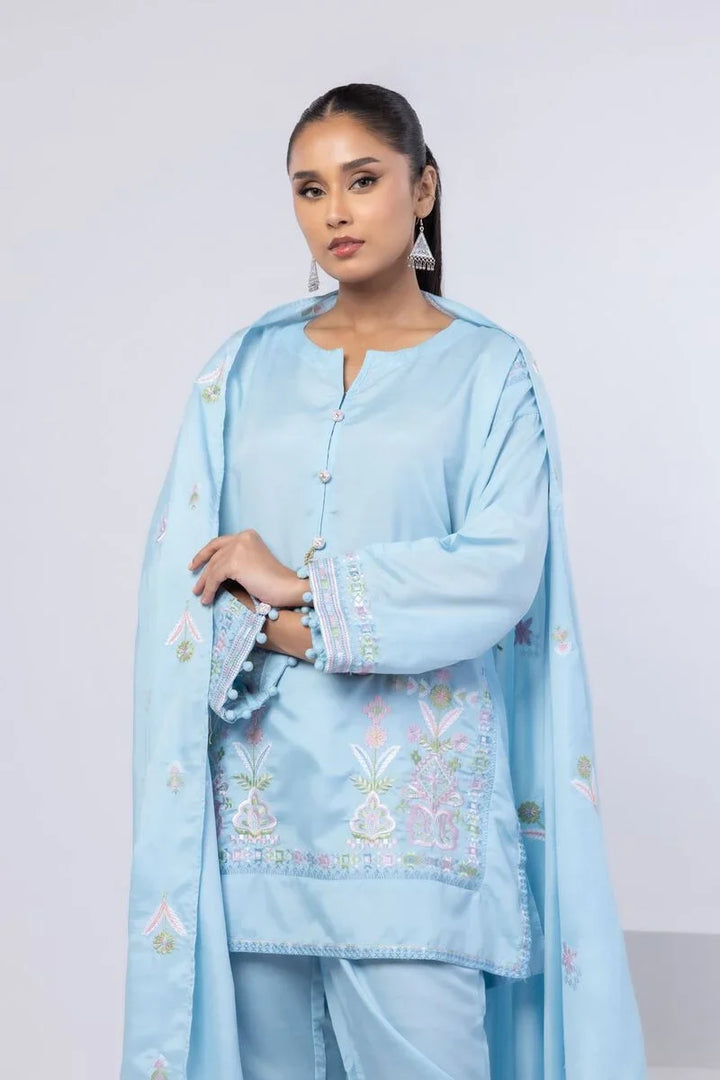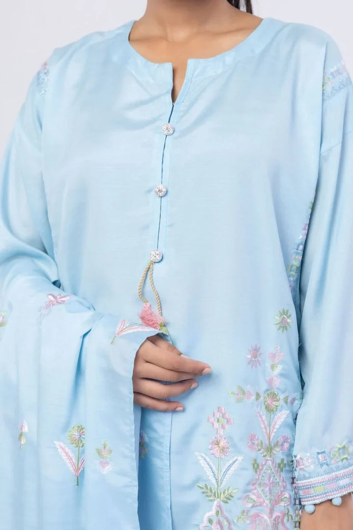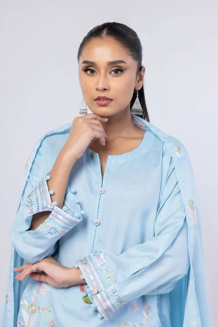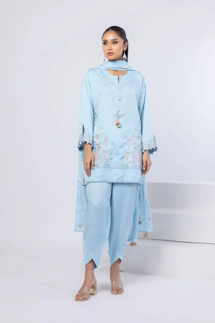 - Description: 3-piece outfit featuring a short embroidered kurta with full sleeves and a round neckline with a V-cut adorned with tassels on the front, paired with a solid shalwar and a matching embroidered dupatta with tassel finishings.