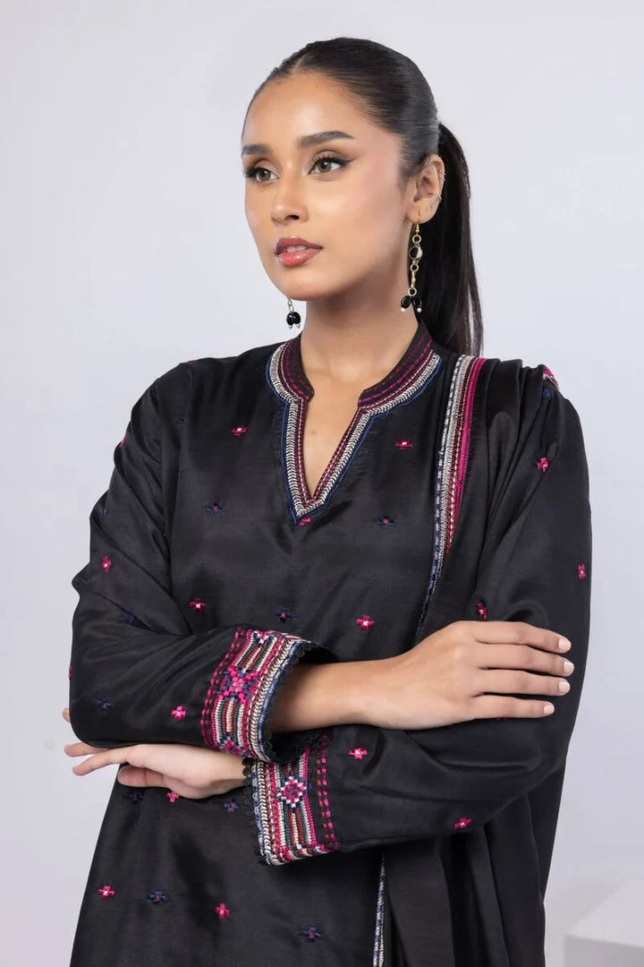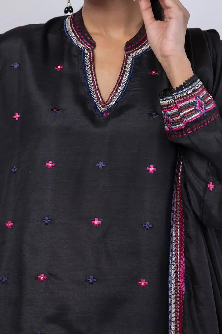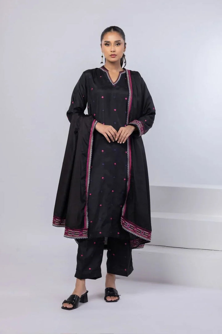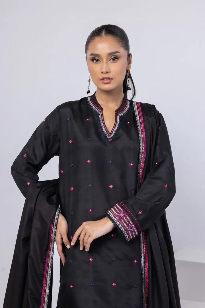 - Description: 3-piece outfit featuring a long embroidered kurta with full sleeves and a band collar with a V-cut, paired with embroidered pants and a matching embroidered dupatta.