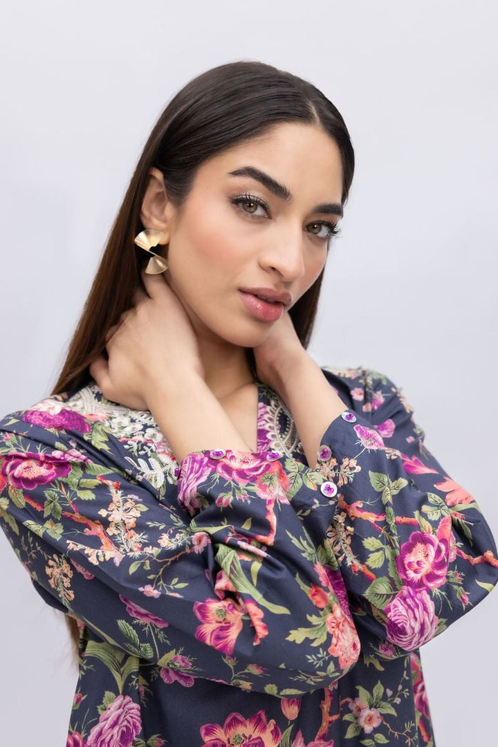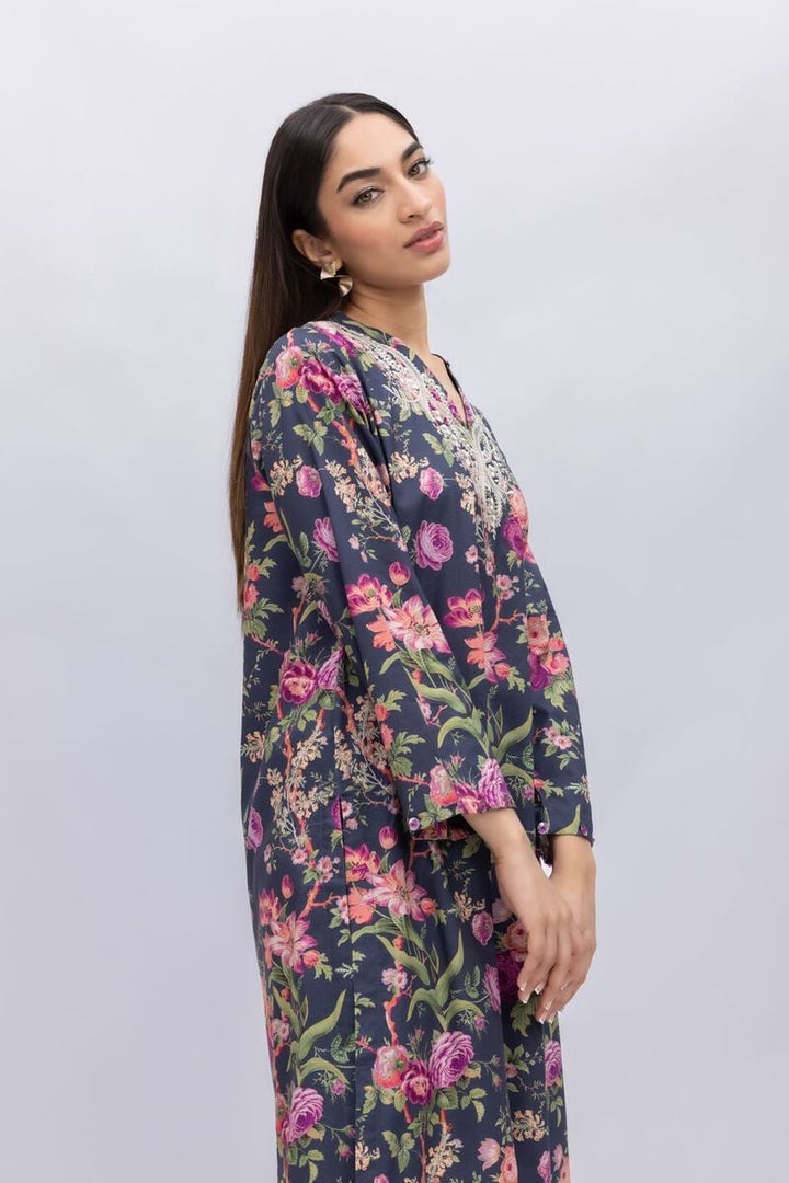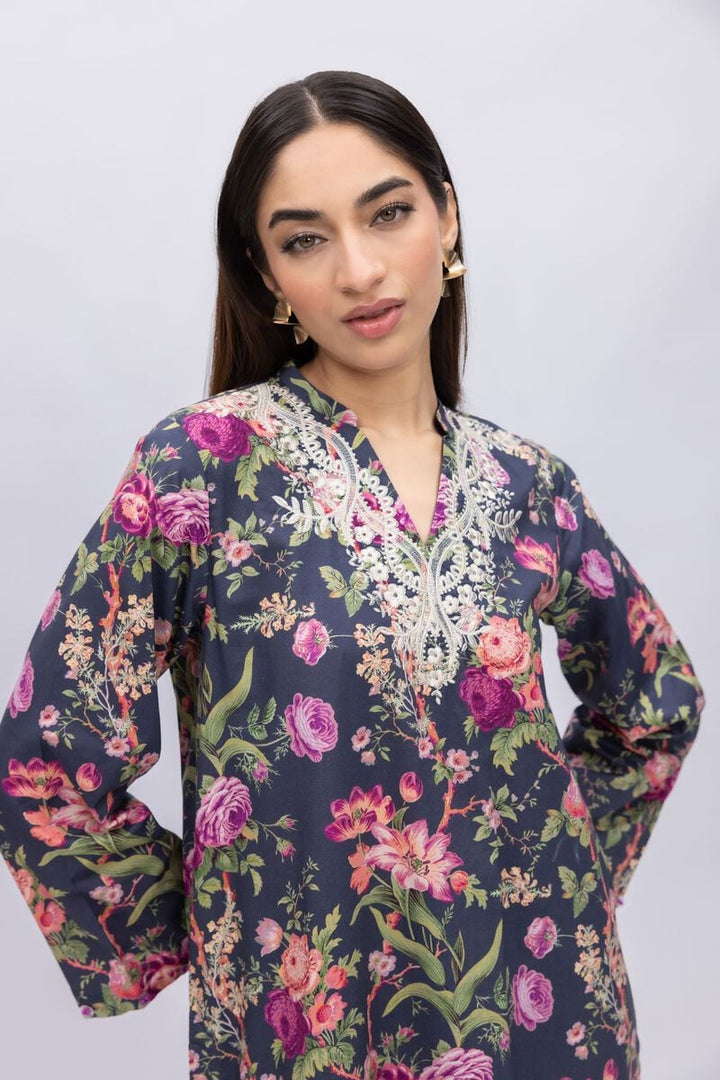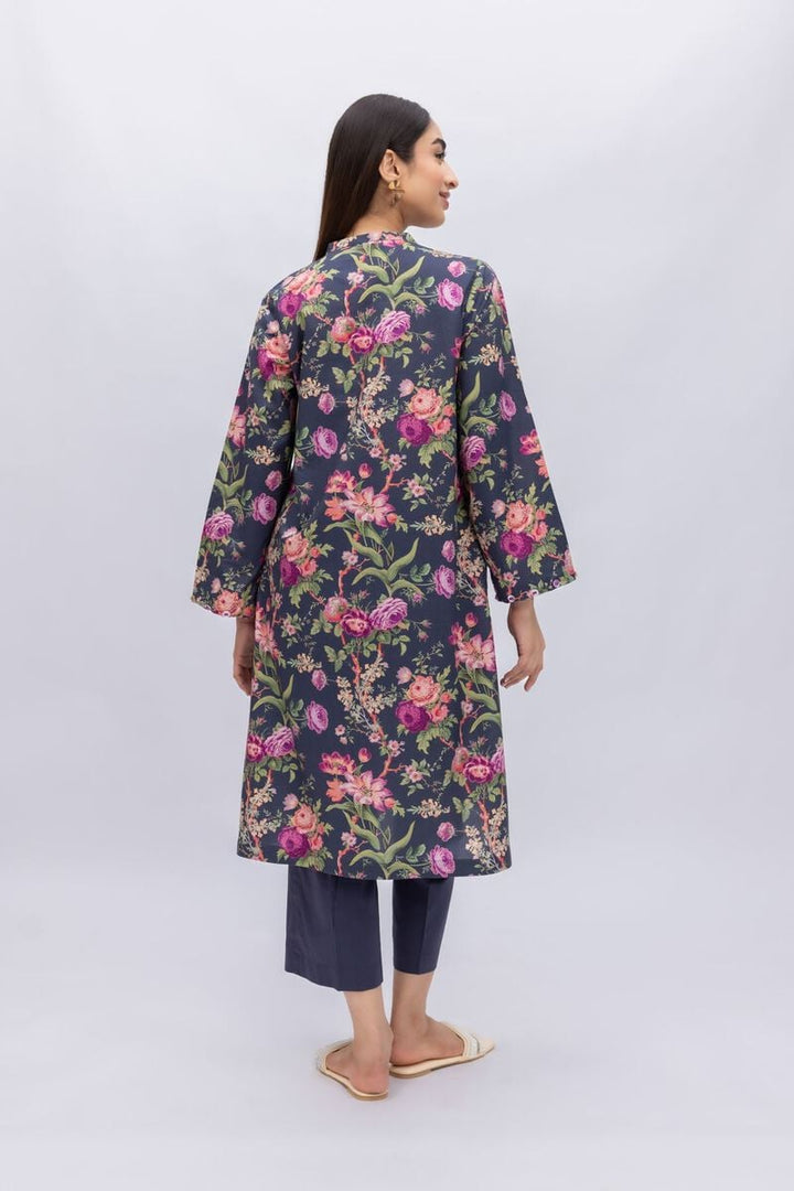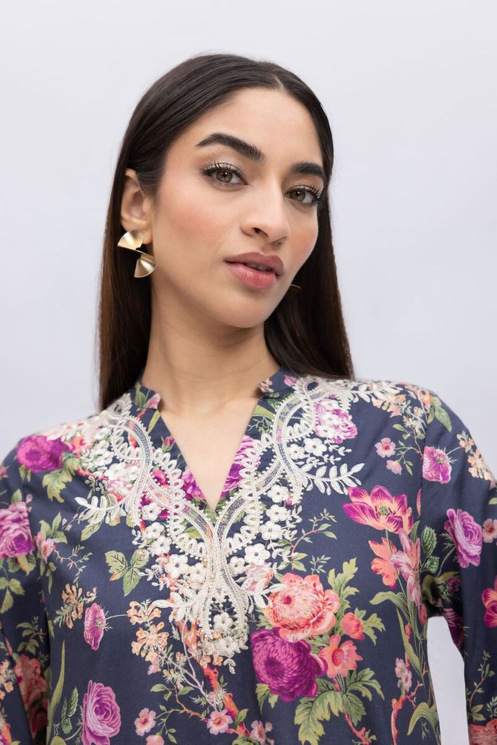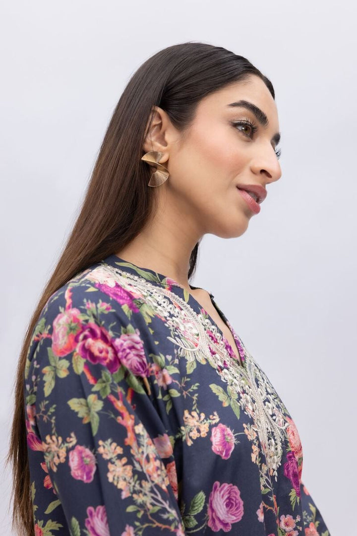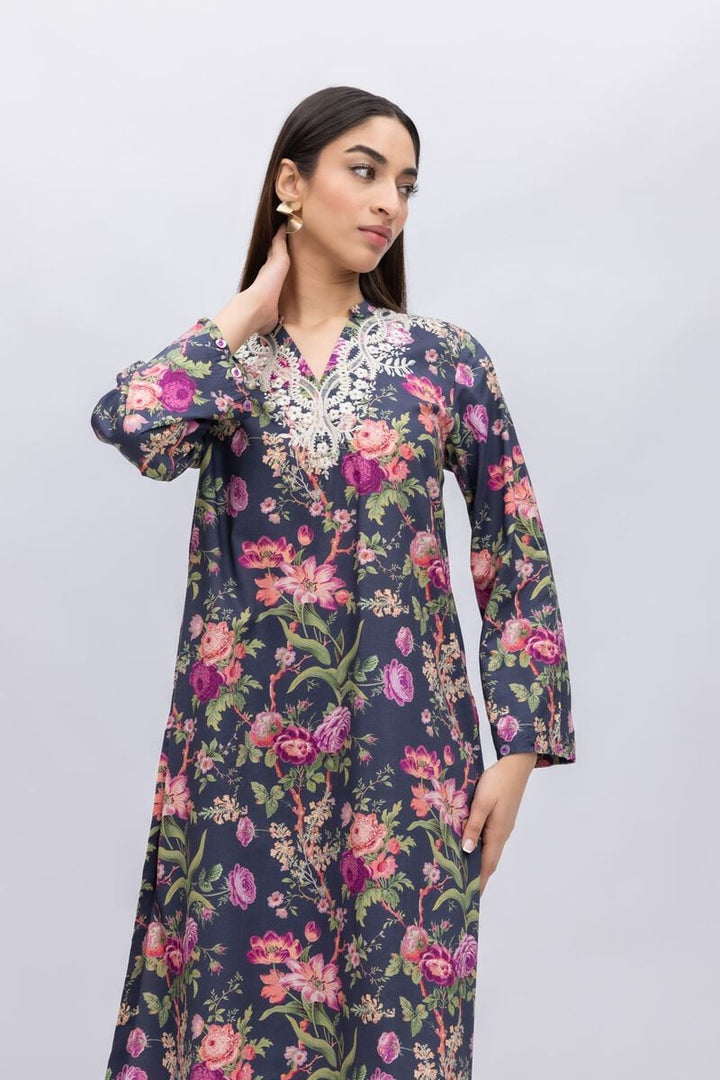 - Description: A short floral print embroidered kurta featuring three-quarter sleeves and a band collar with a V-cut.