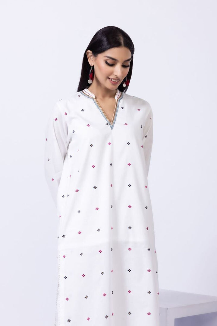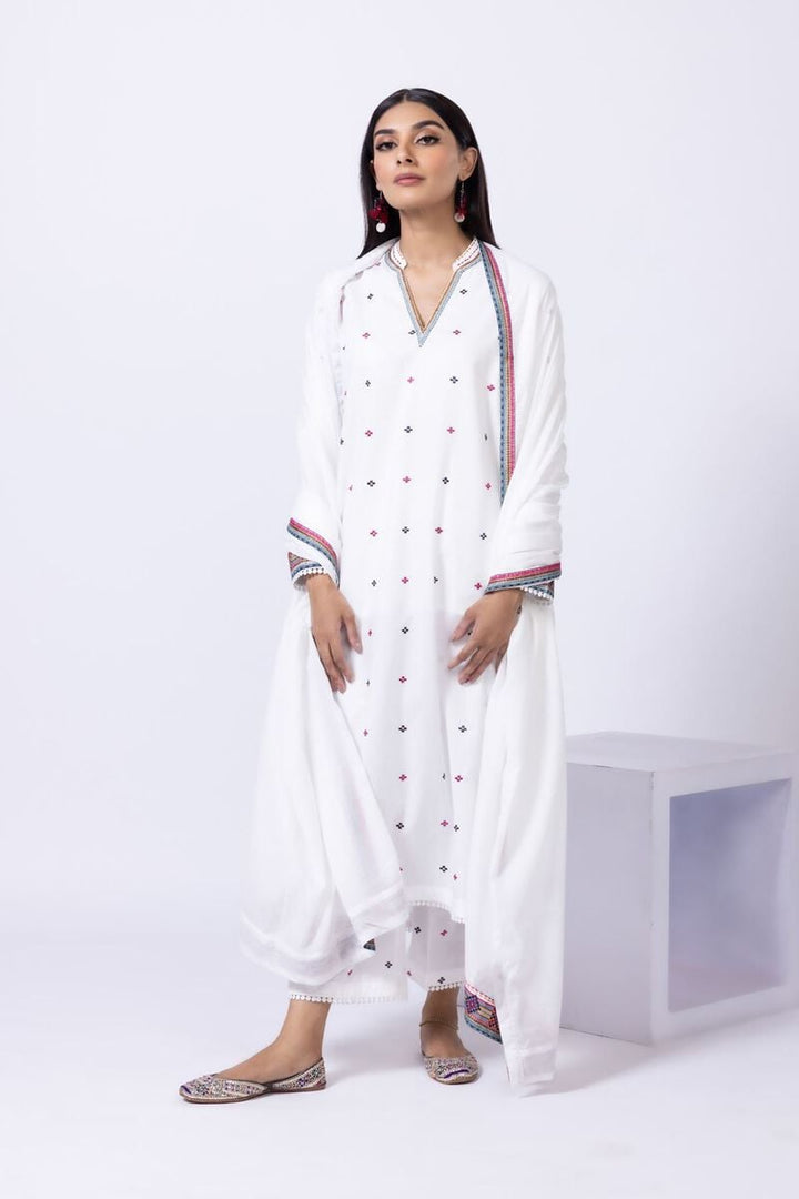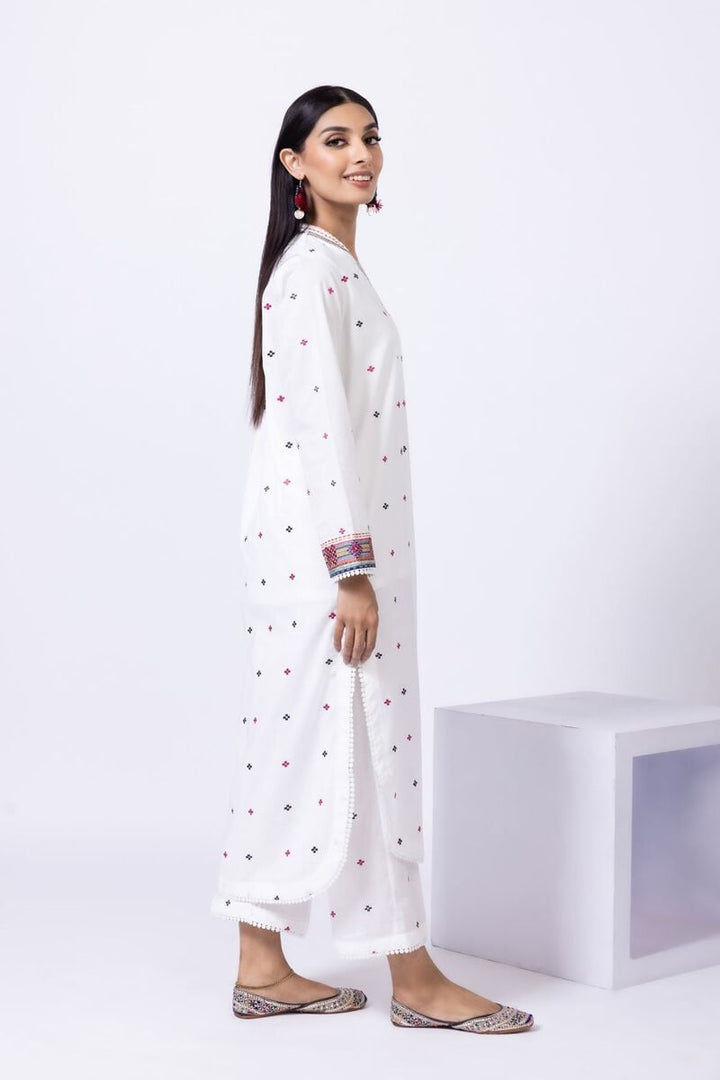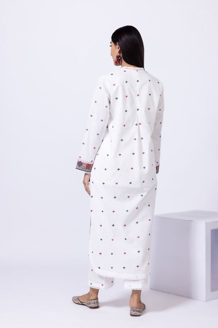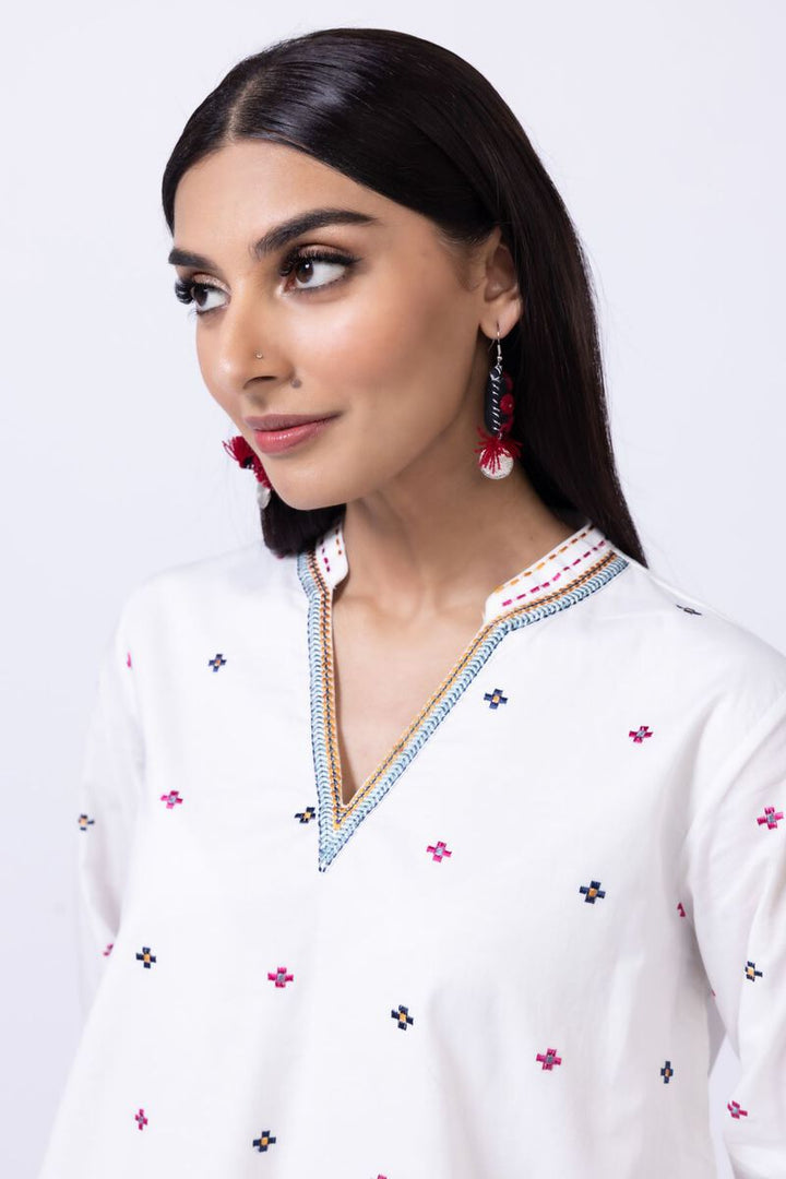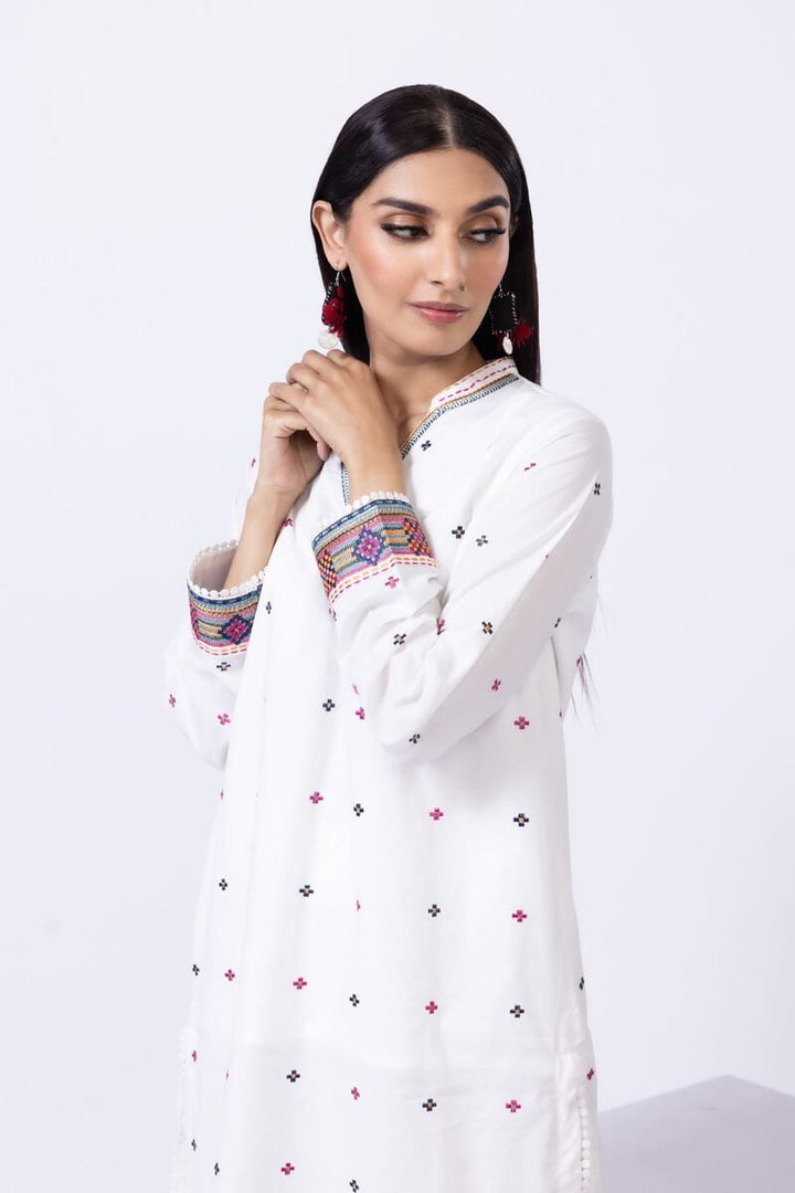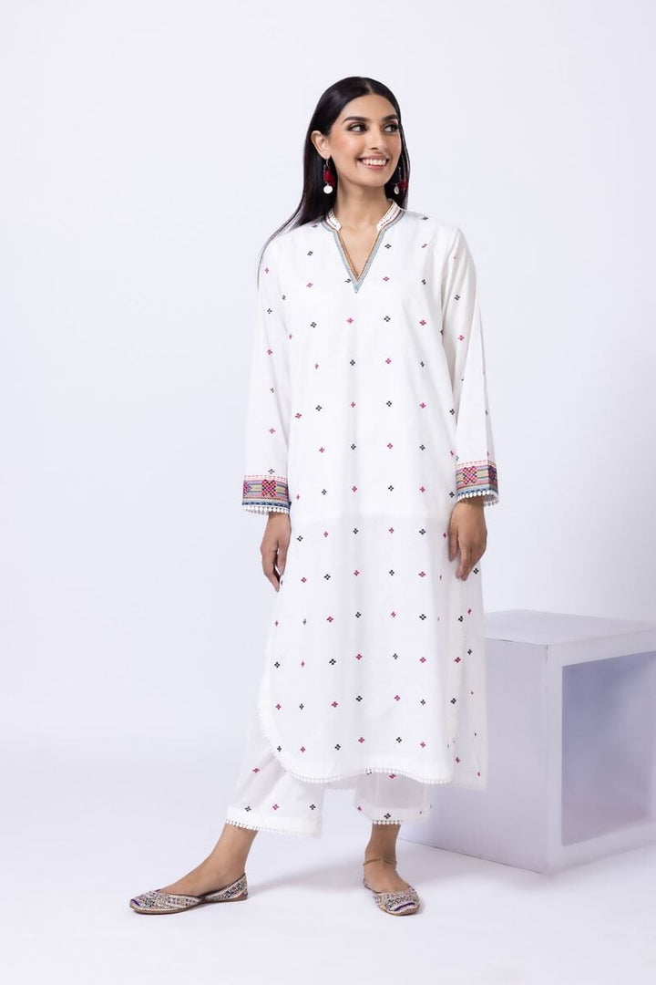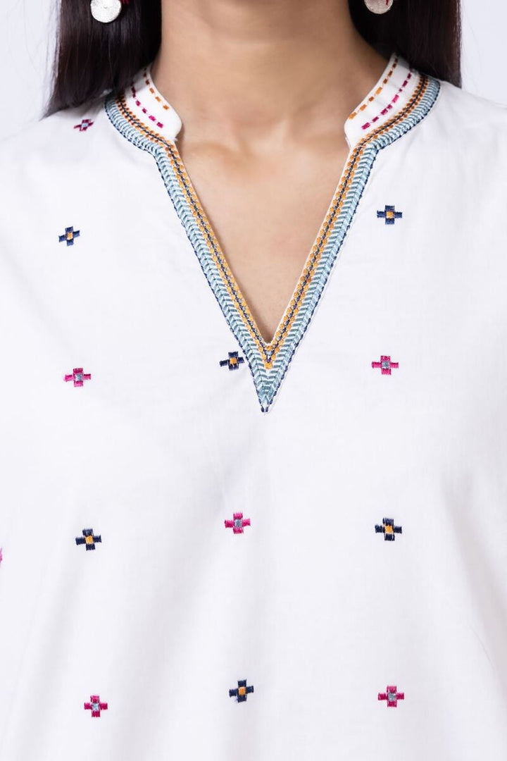 A long embroidered kurta featuring full embroidered sleeves and a band collar with a V-cut.