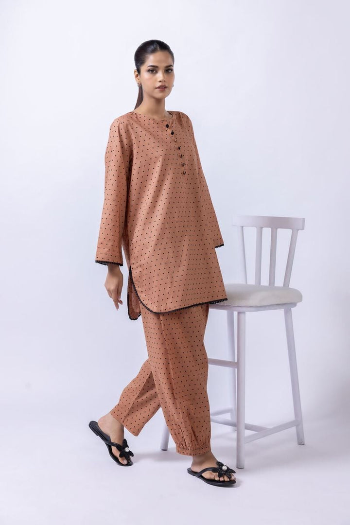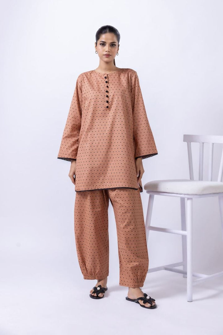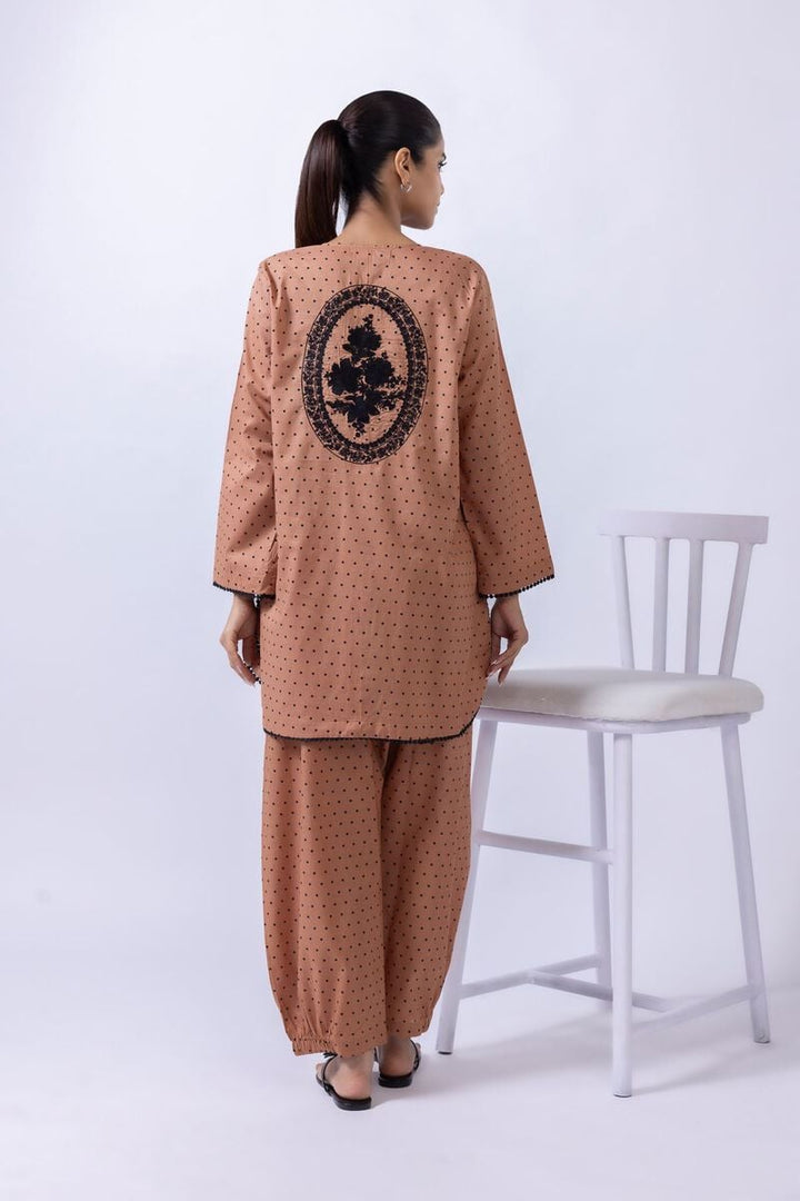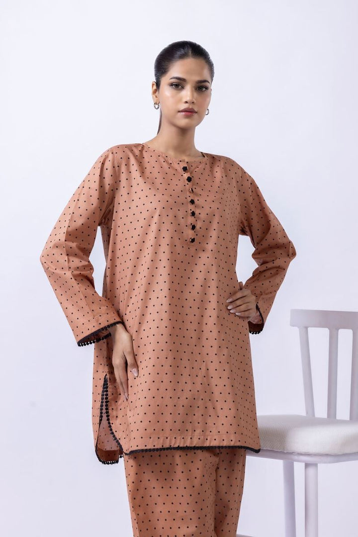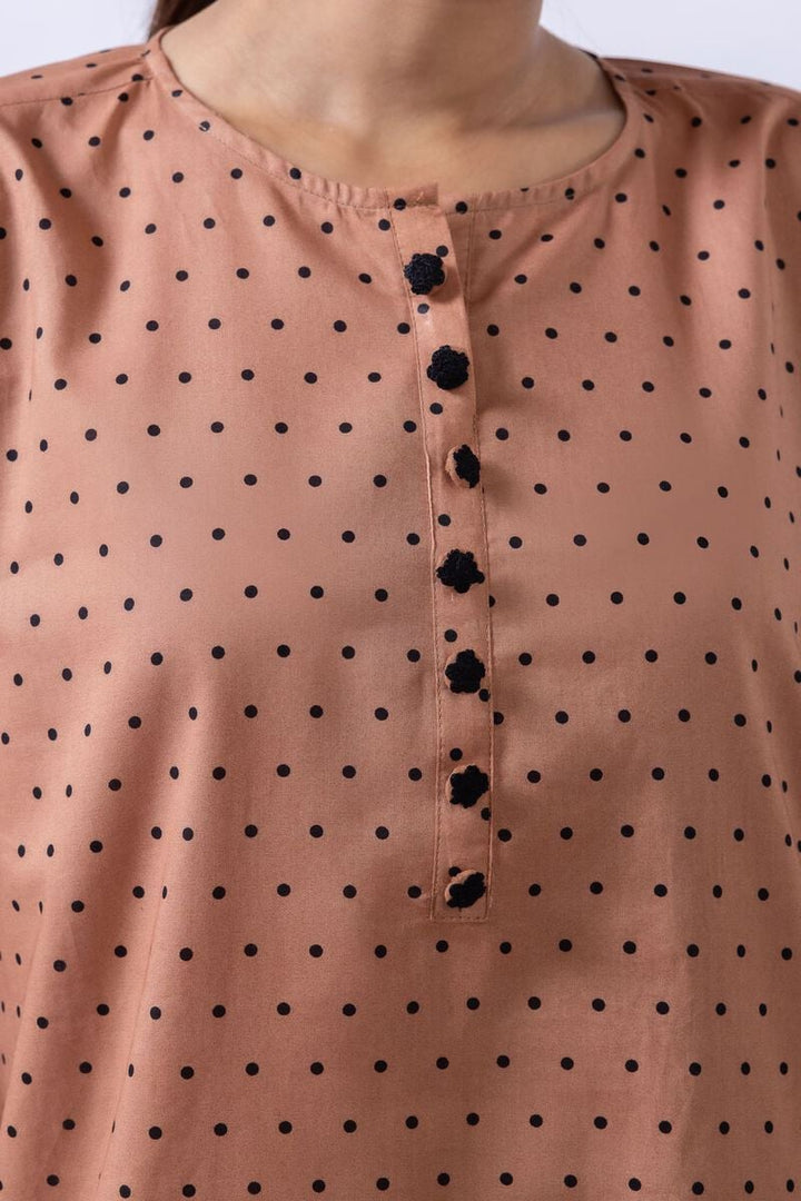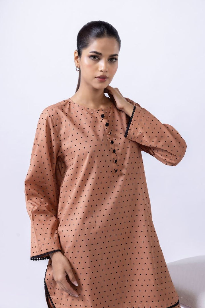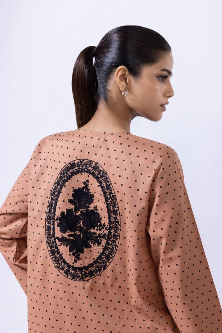 A printed kurta with rounded hems, featuring full sleeves, a round neckline and embroidery on the back.