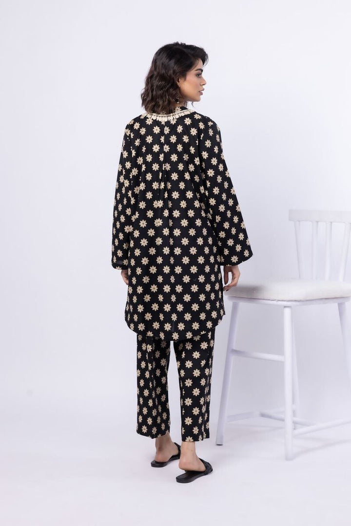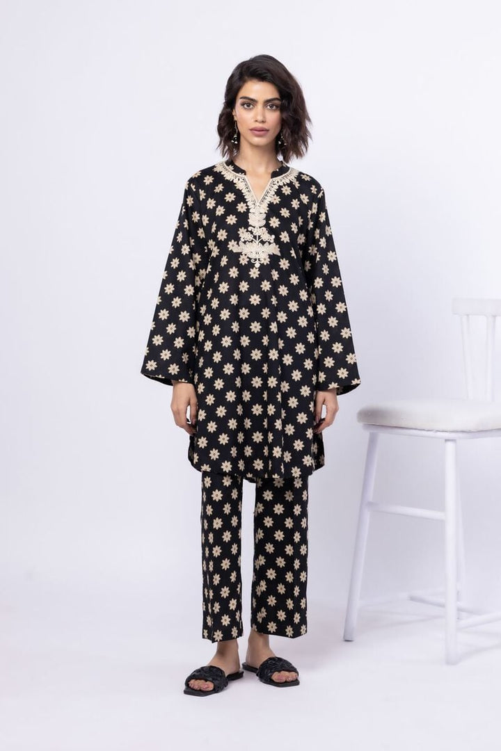 A short floral printed kurta featuring three-quarter sleeves and a band collar with embroidery.