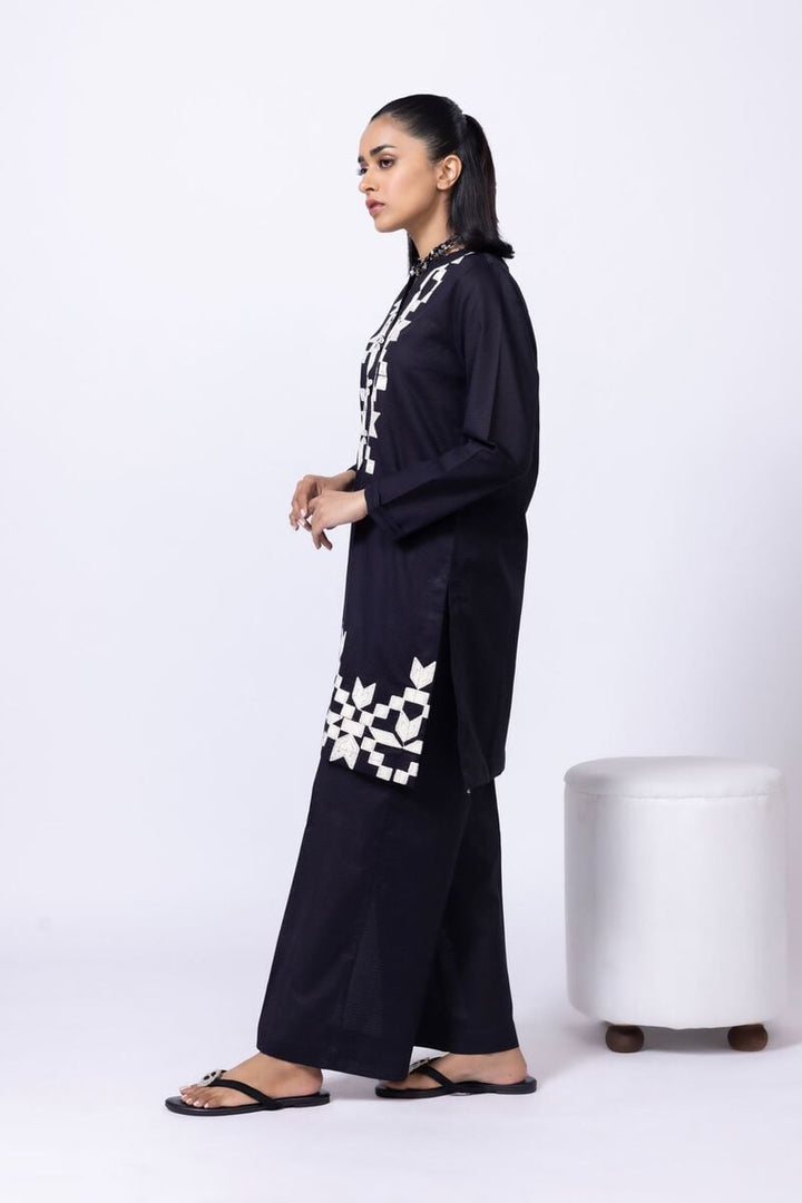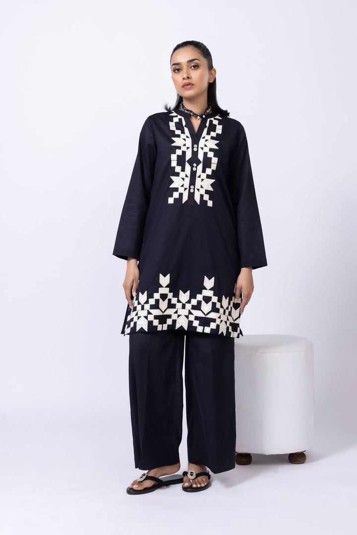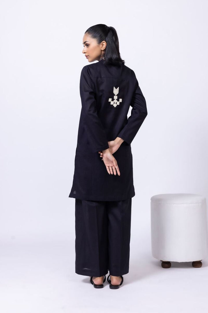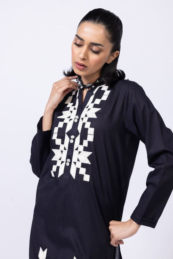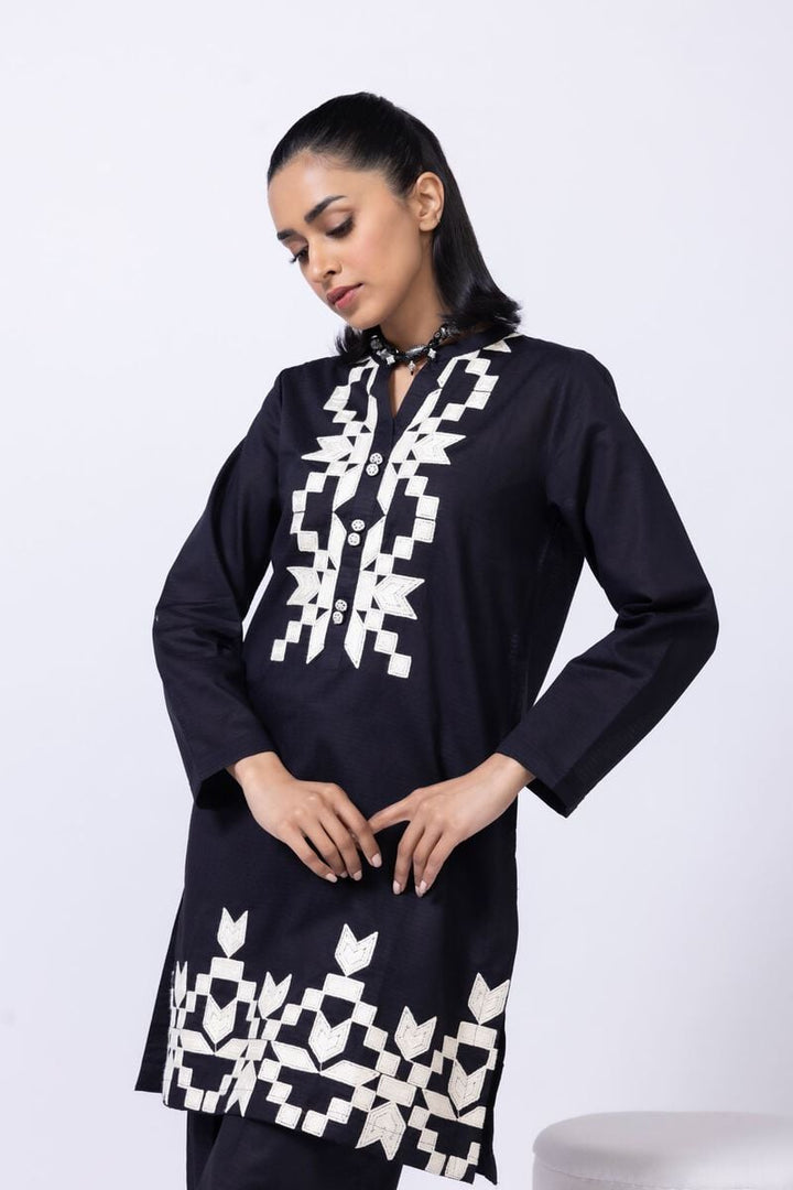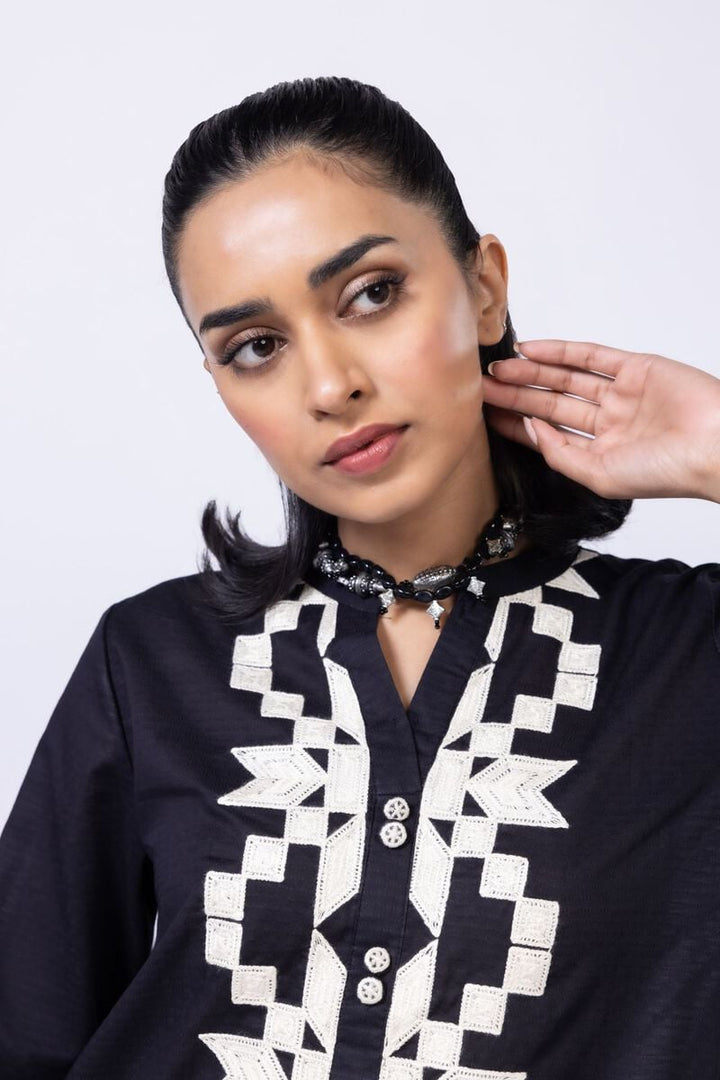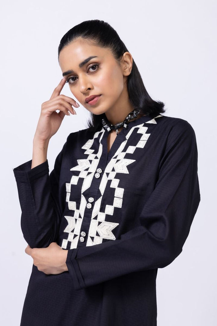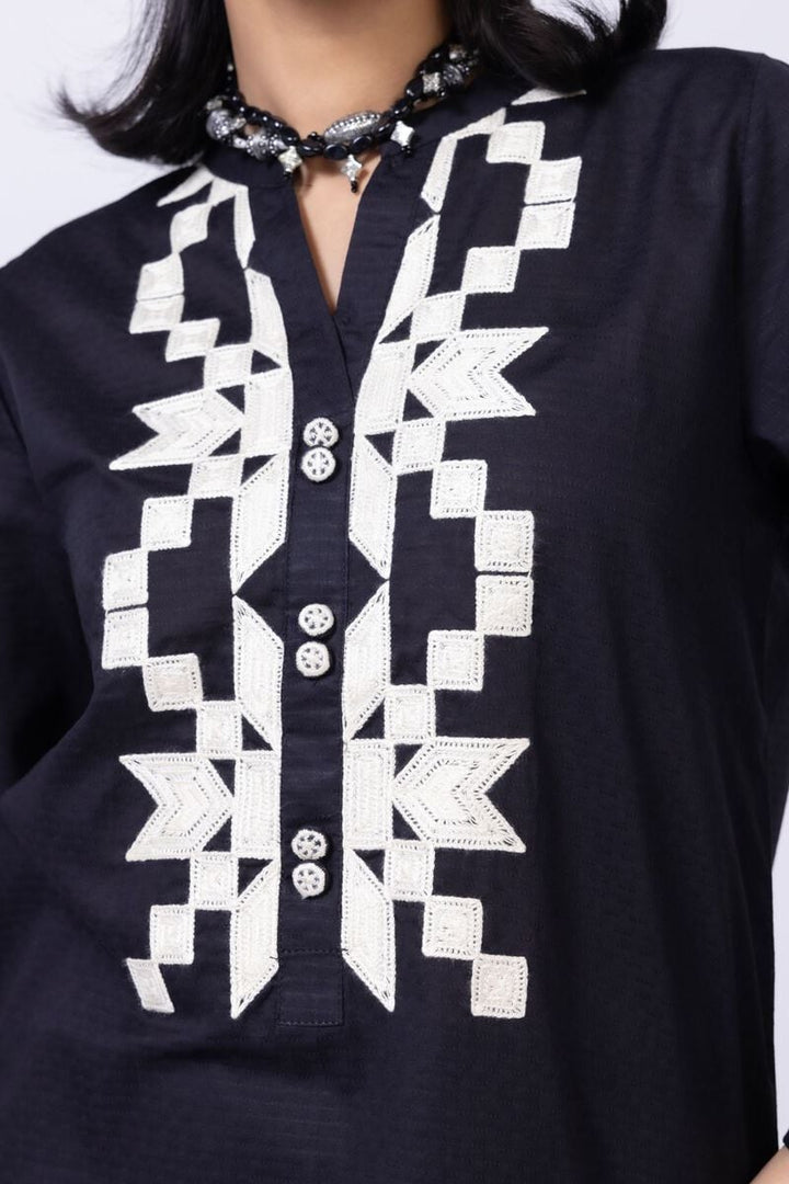 - Description: A short floral embroidered kurta featuring full sleeves and a band collar.