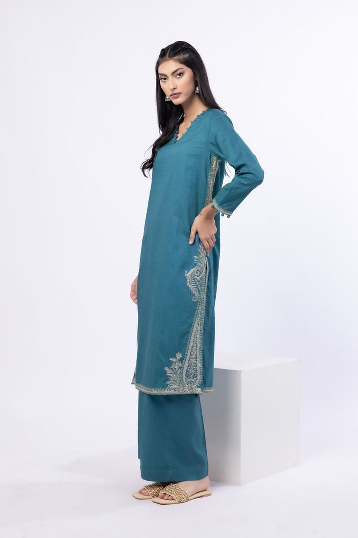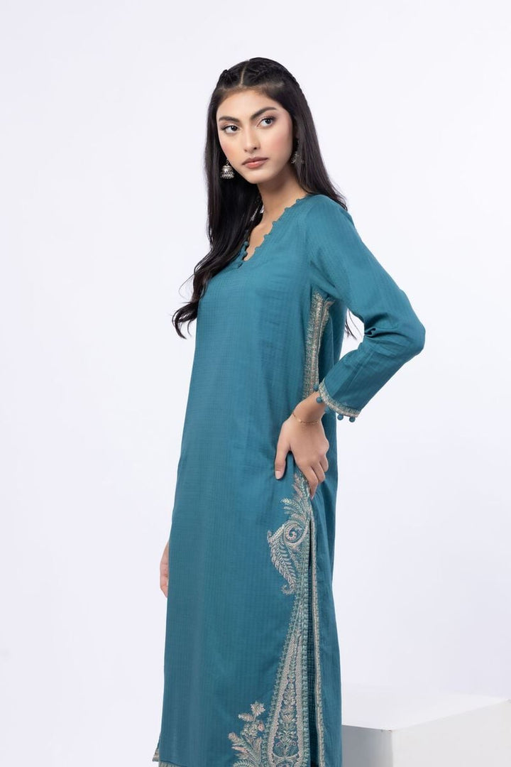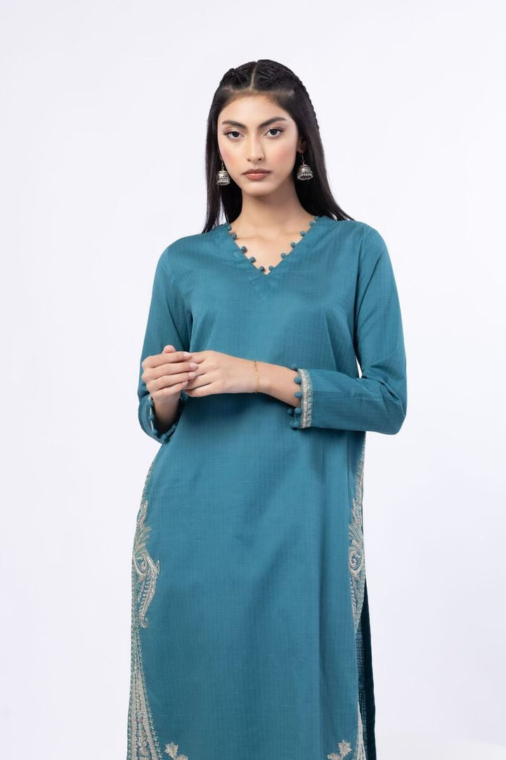- Description: A long floral embroidered kurta featuring full sleeves and a neckline with a V-cut.