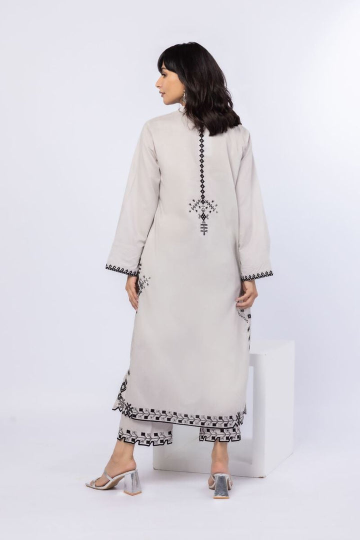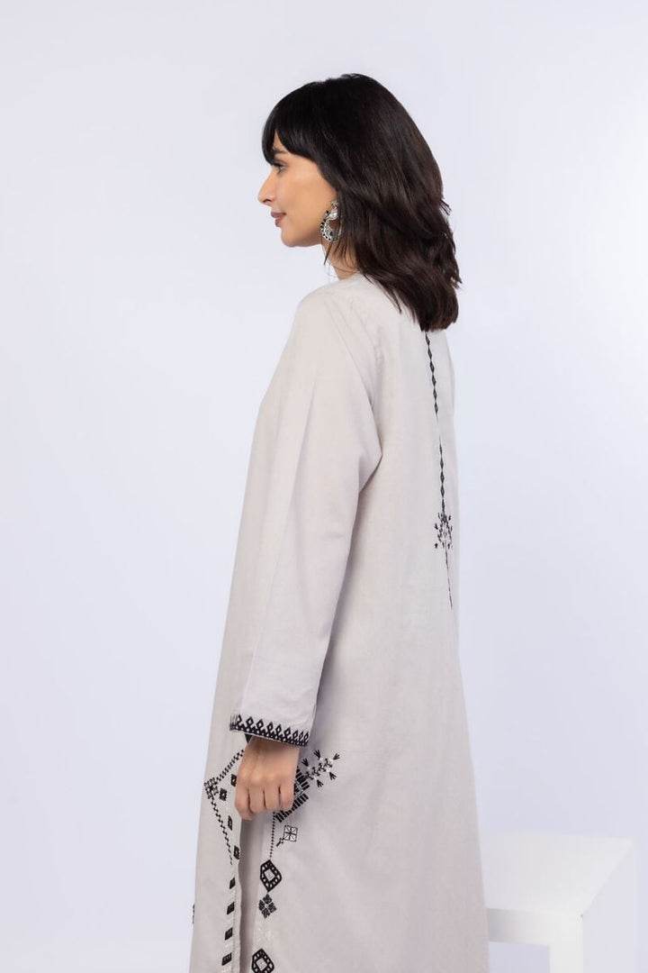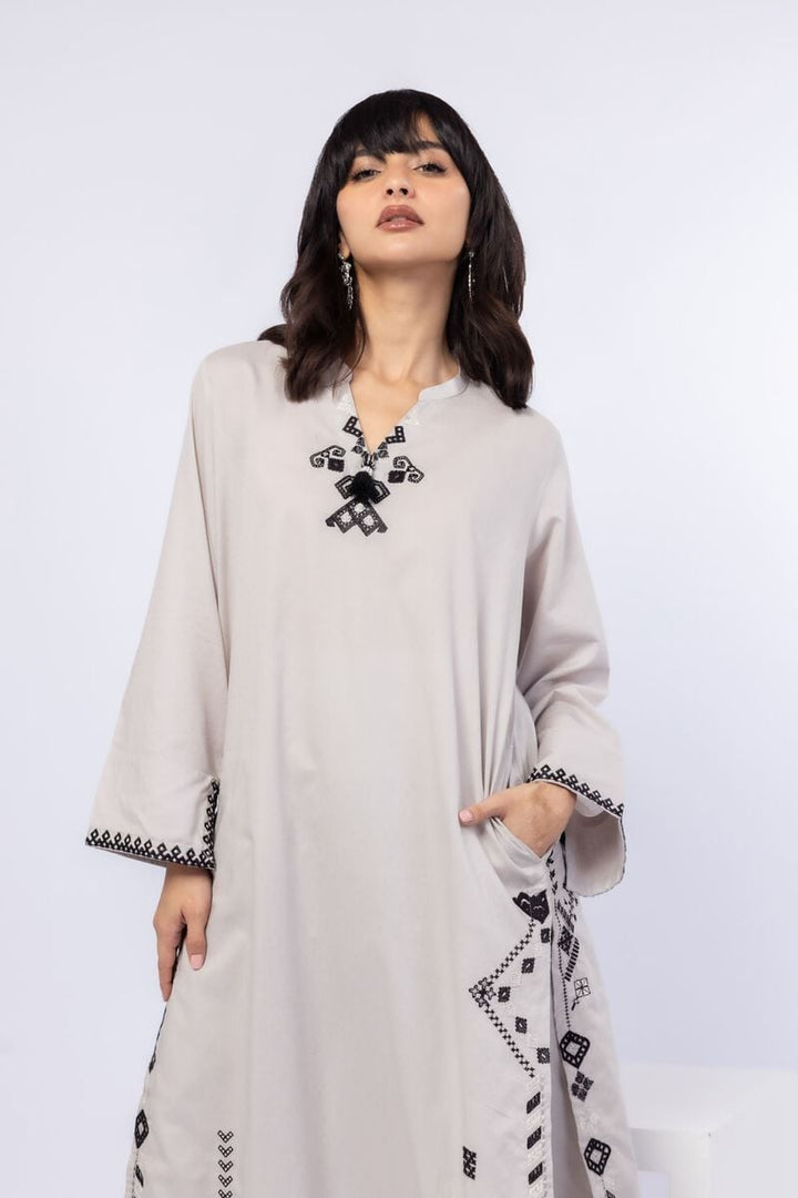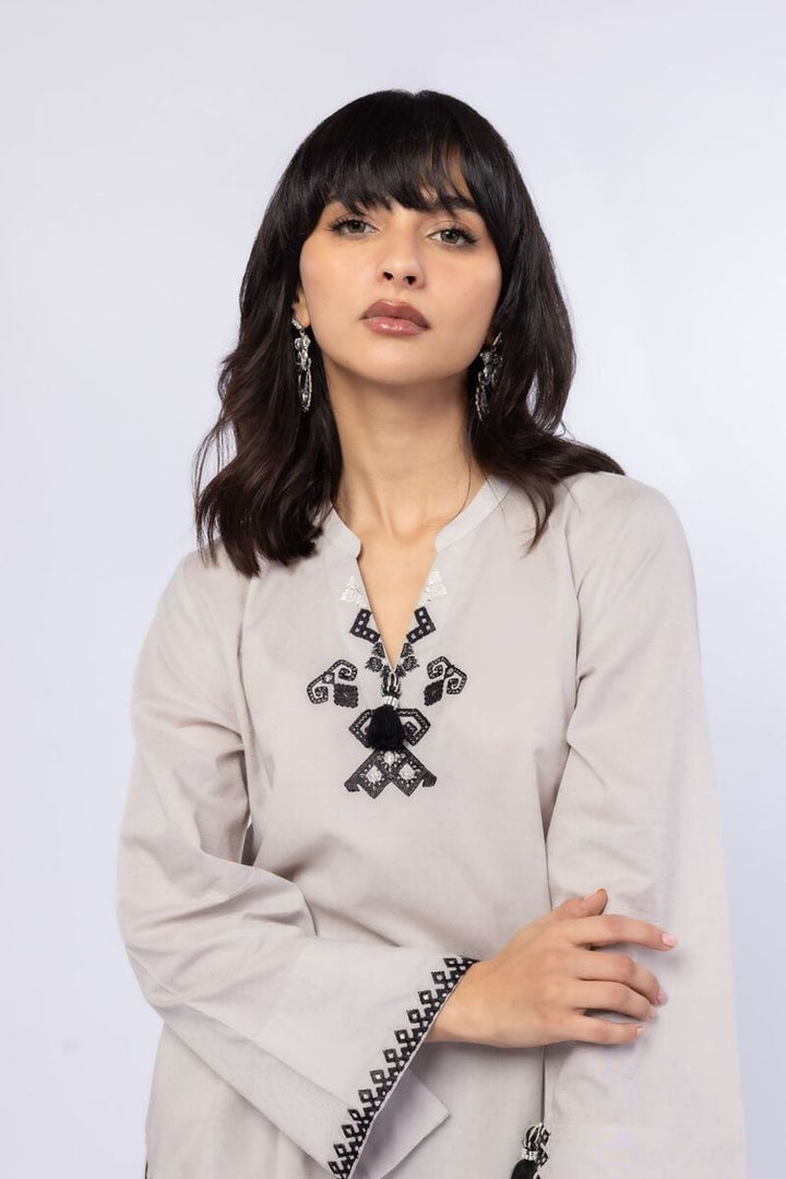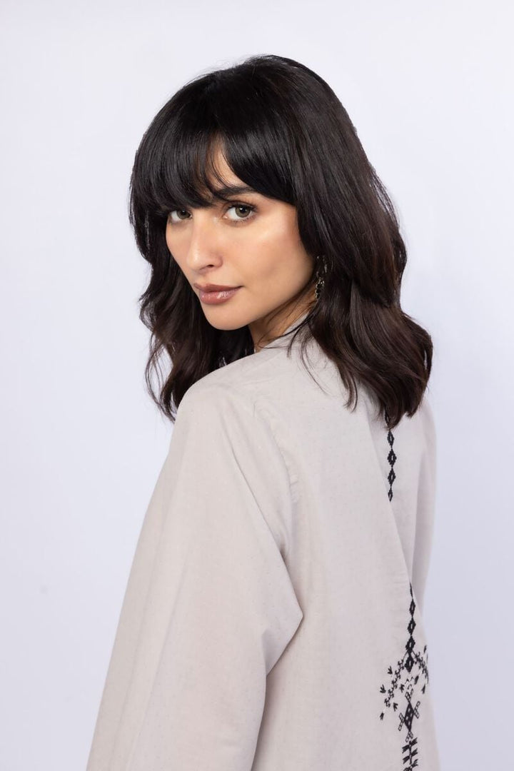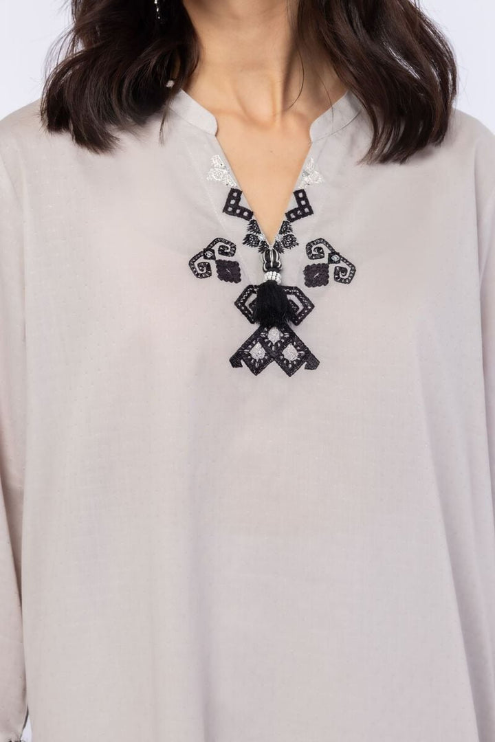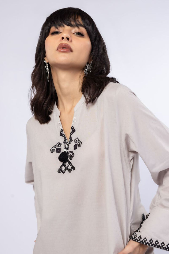 A long embroidered kurta featuring full sleeves, a band collar with a V-cut, tassel detailing and embroidery on the back.