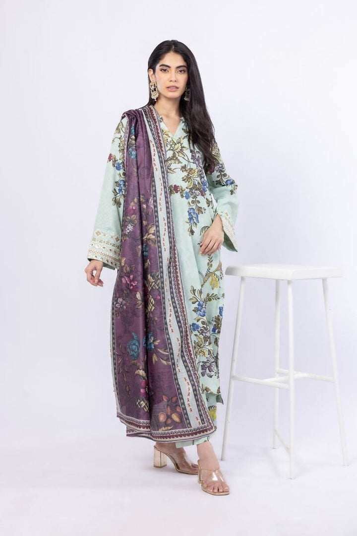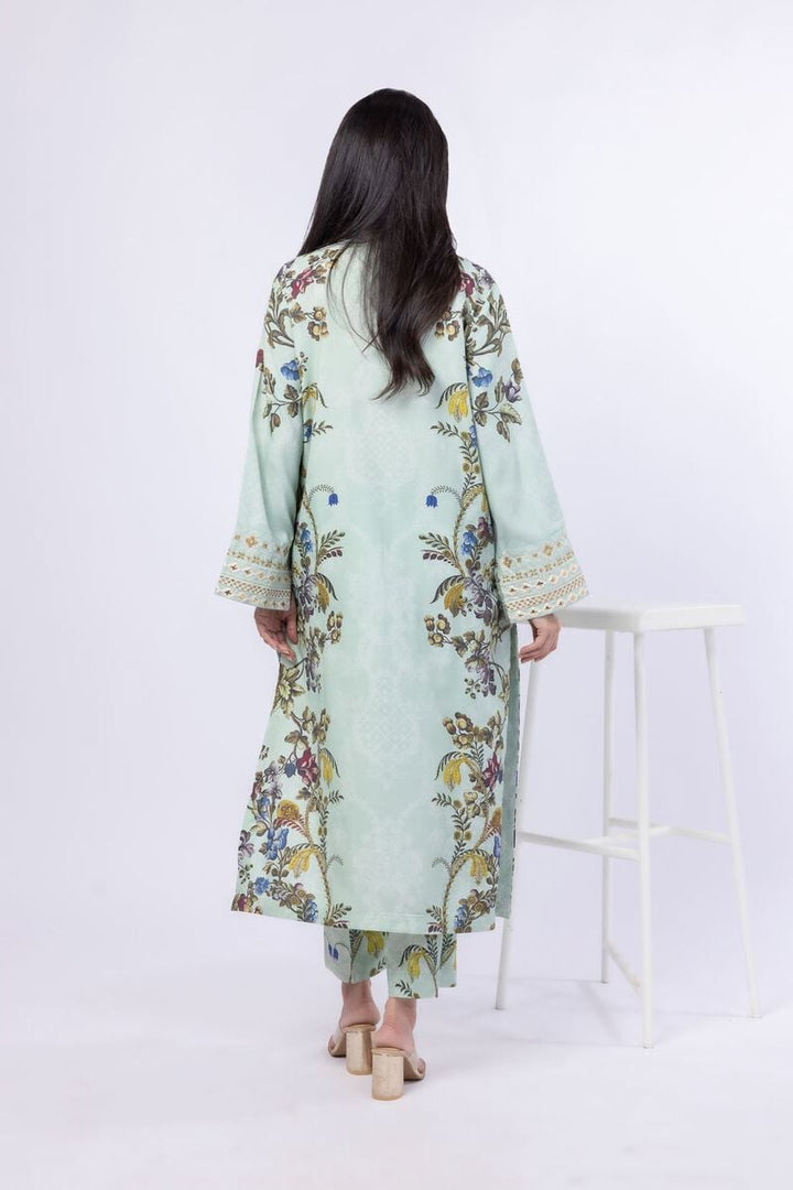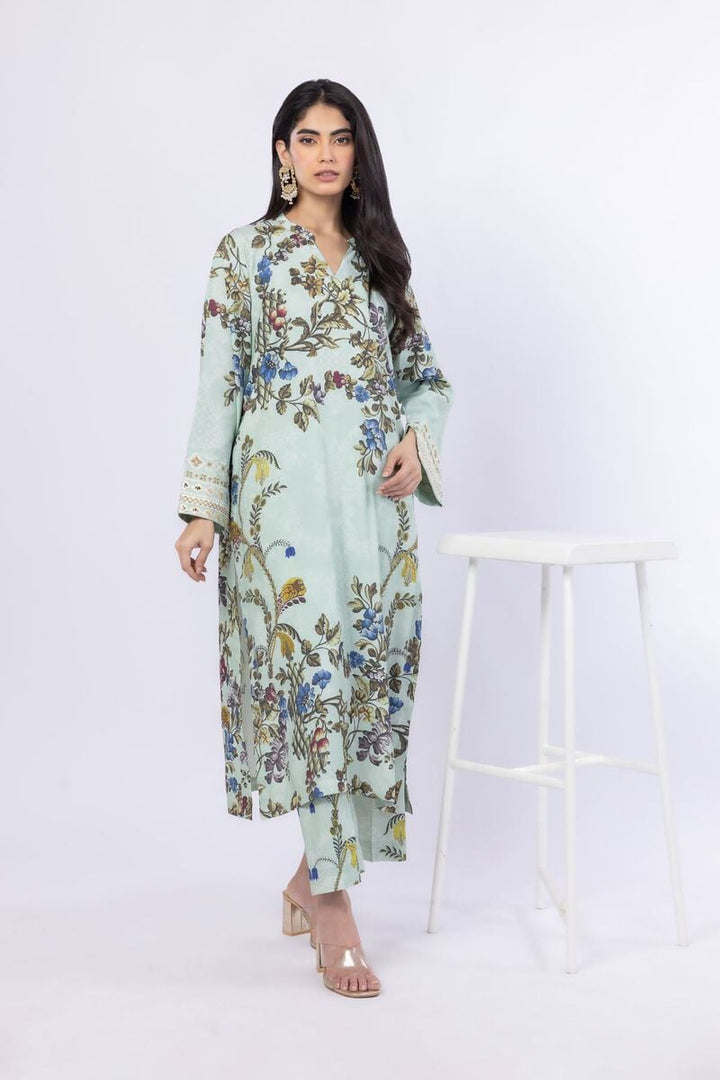 - Description: A long floral printed kurta featuring full embroidered sleeves and a band collar with a V-cut.