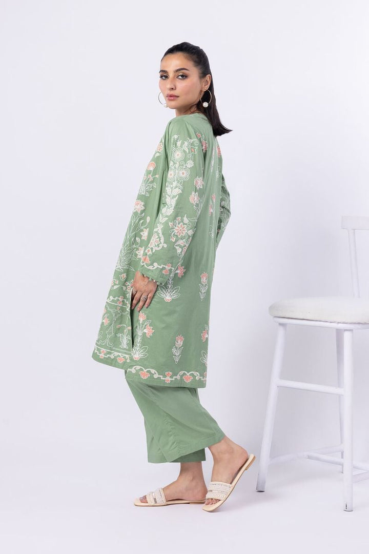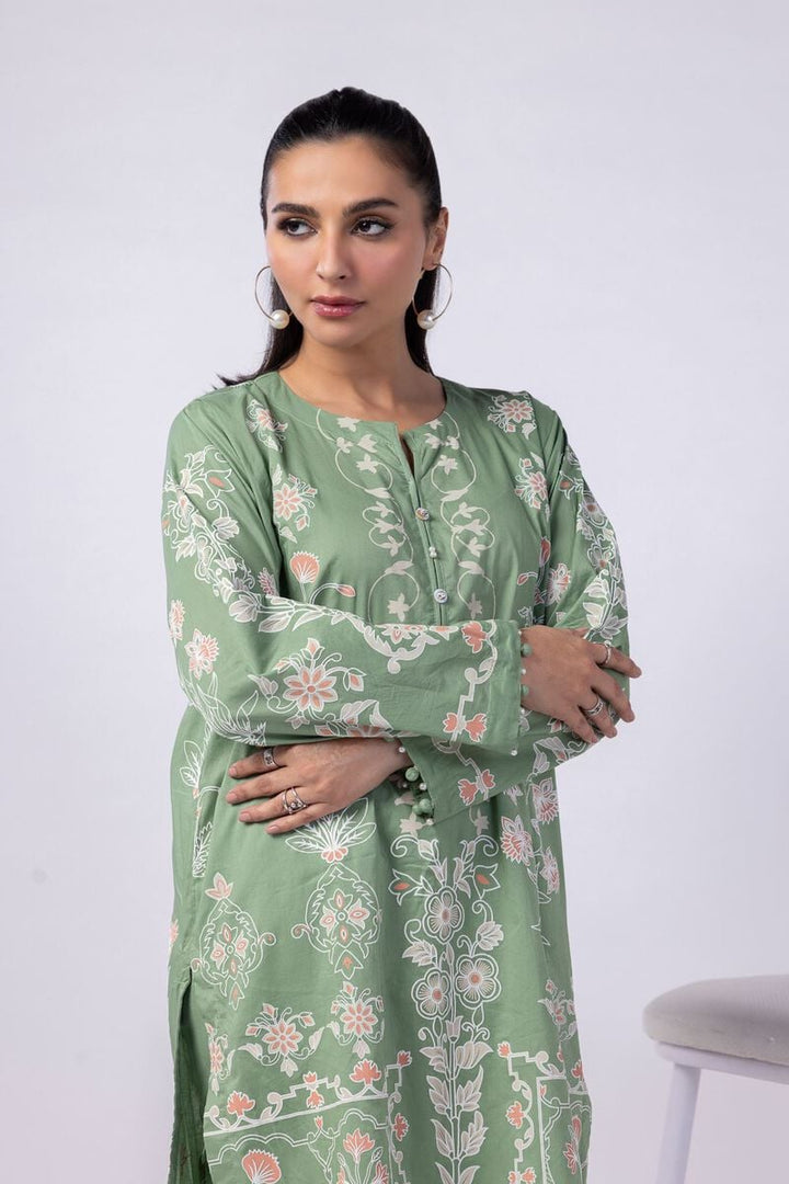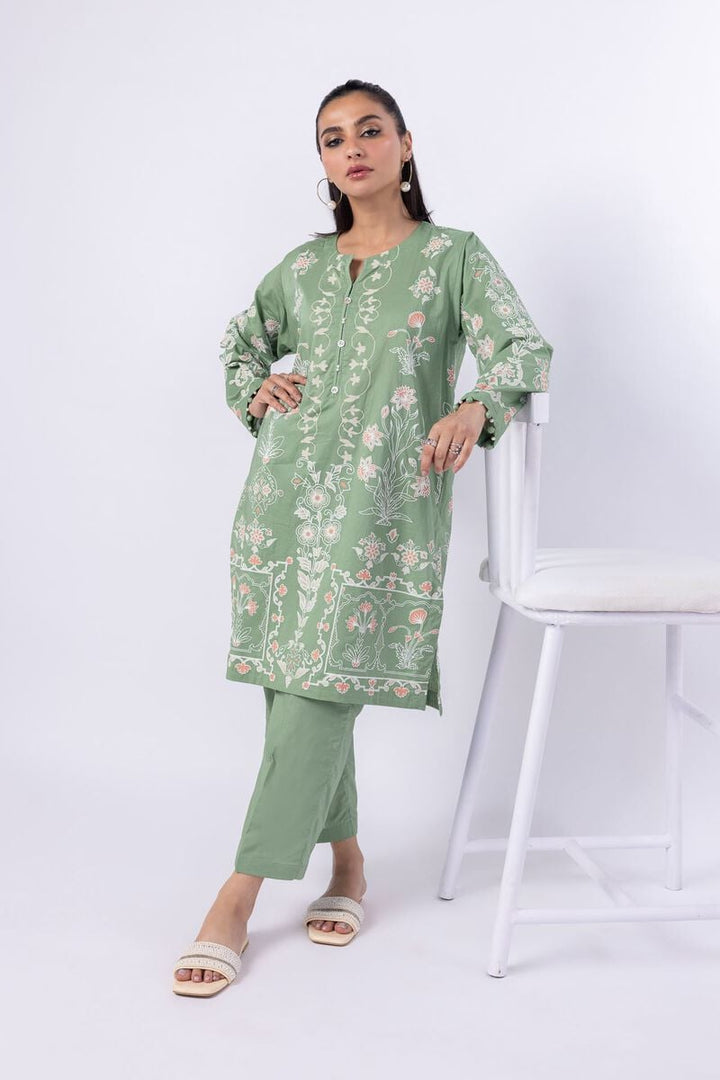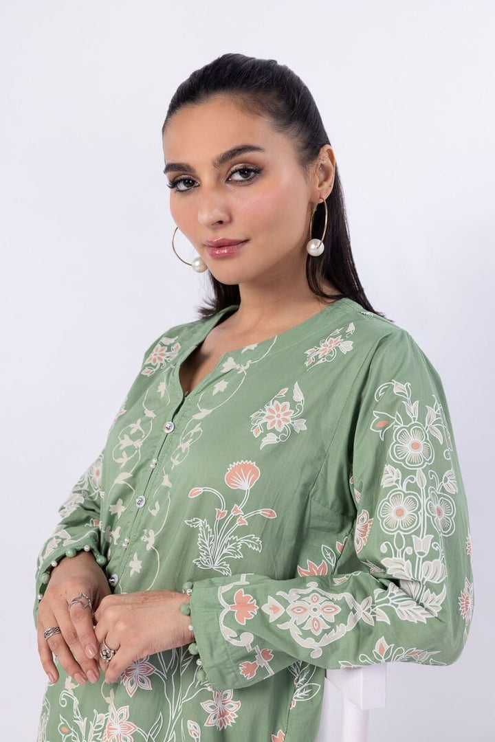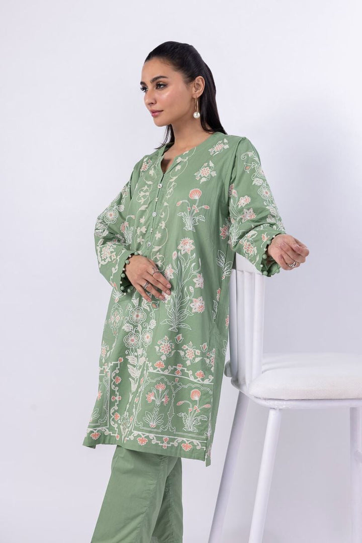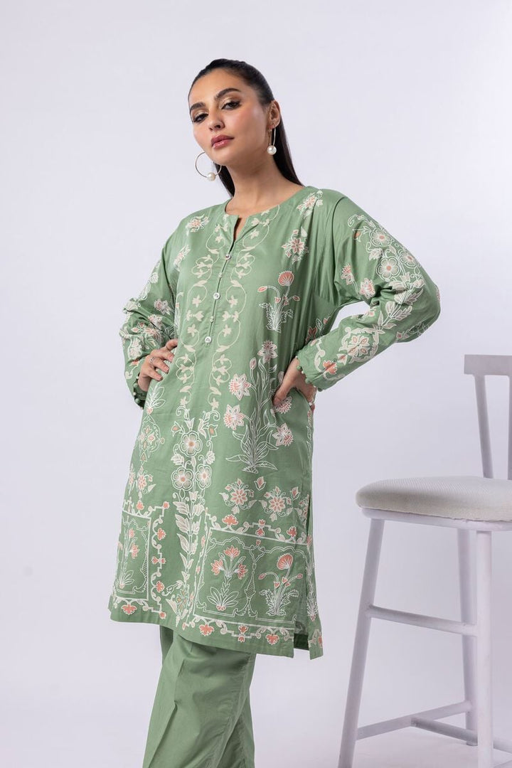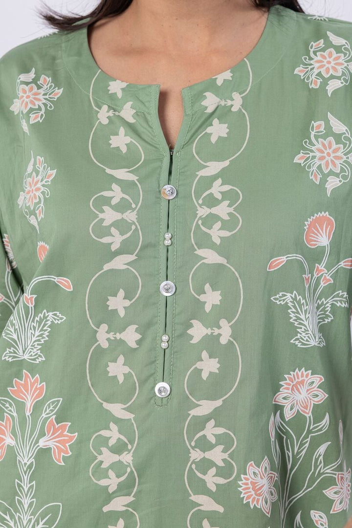 - Description: A short printed kurta featuring full sleeves and a round neckline with a V-cut.