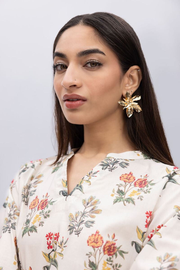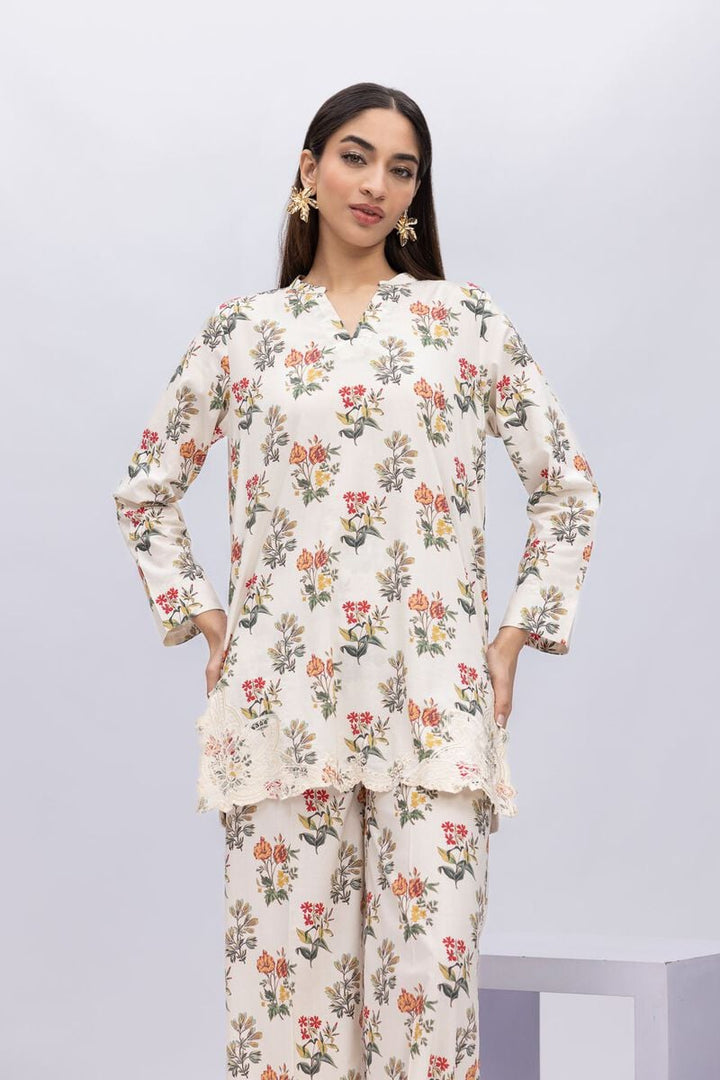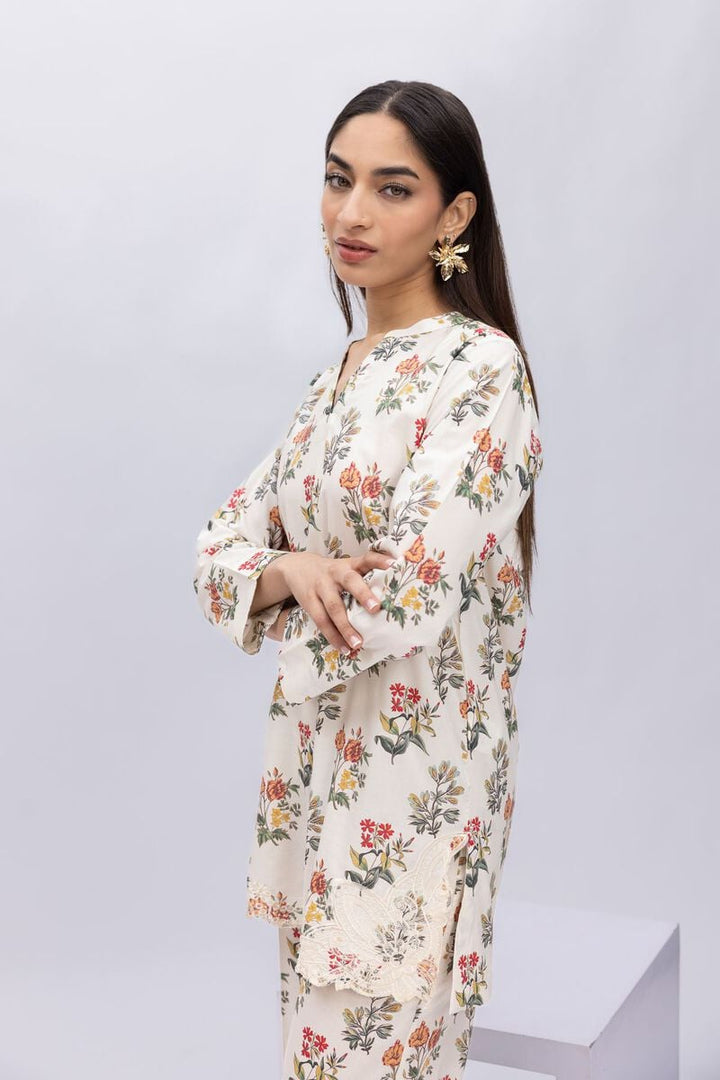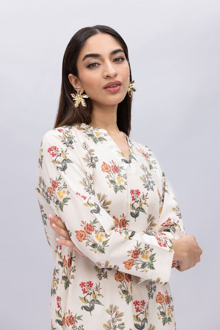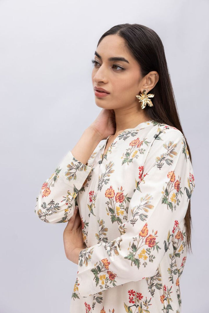 - Description: A short printed kurta featuring full sleeves and a round collar.