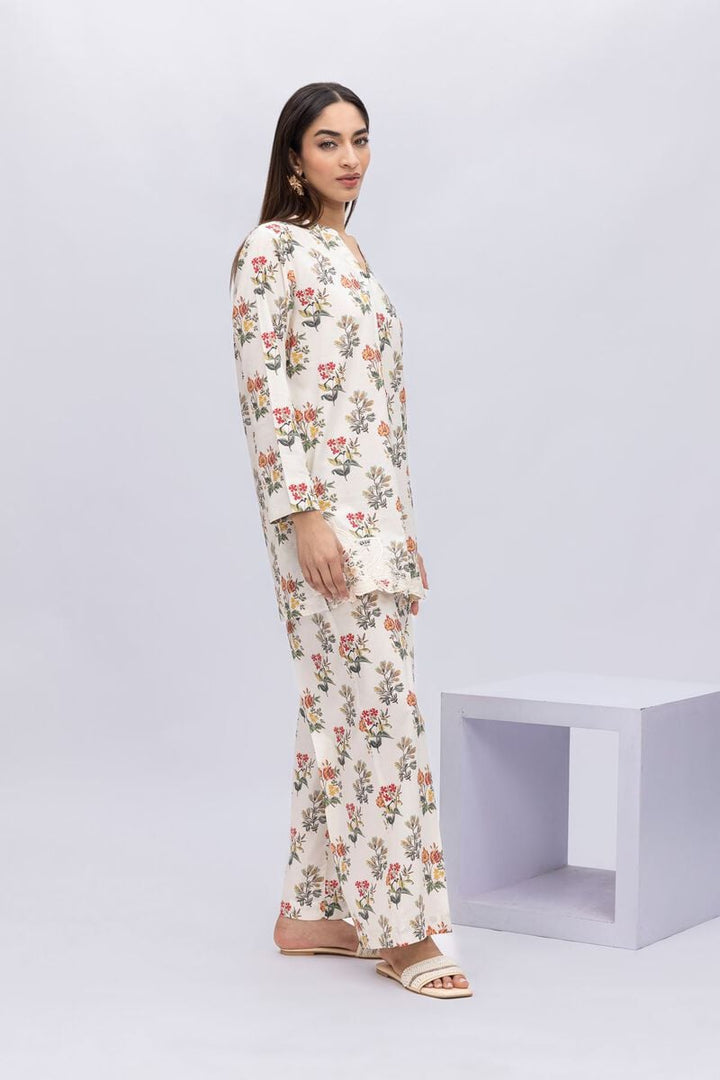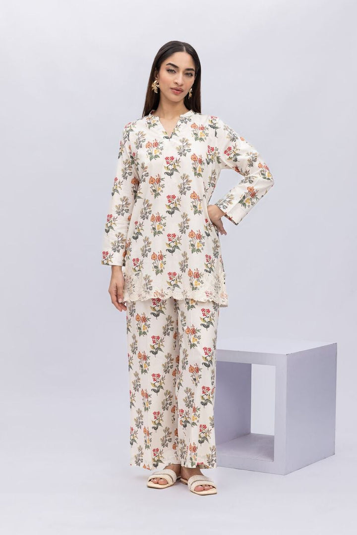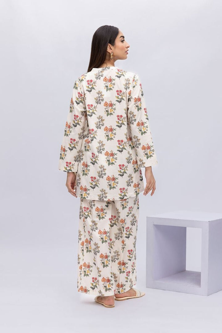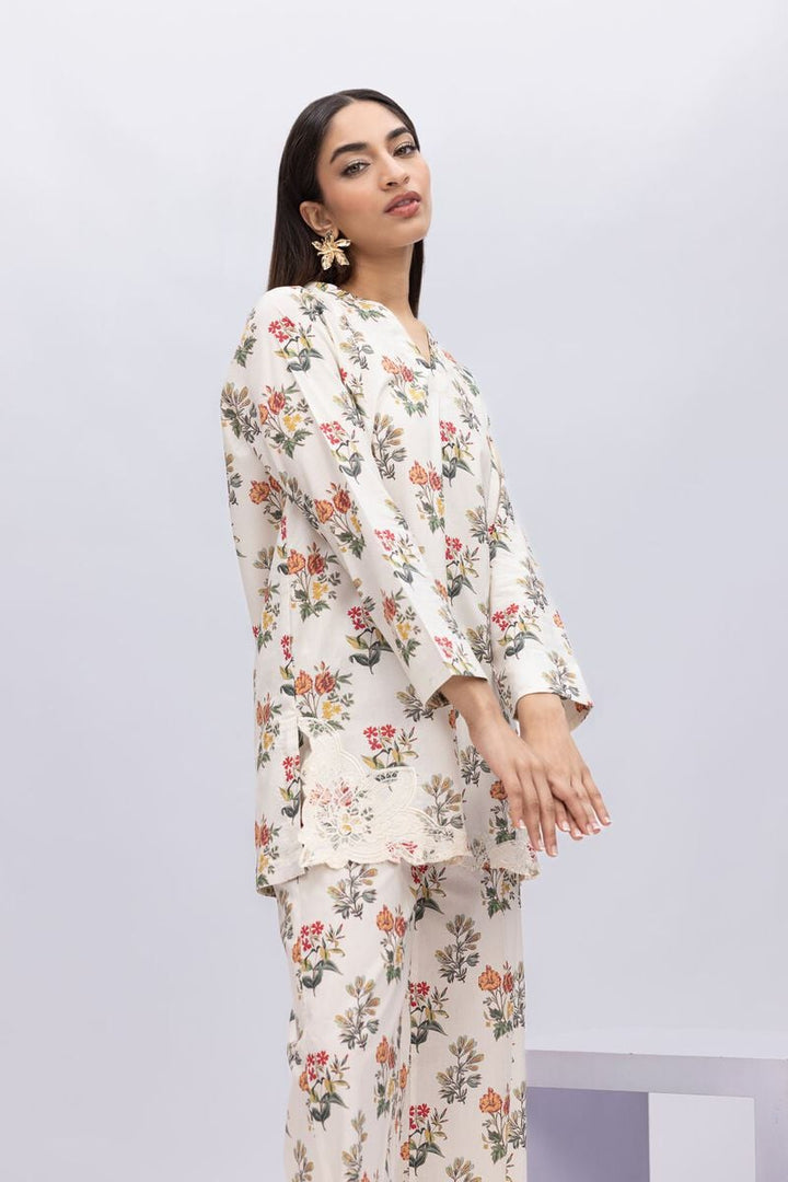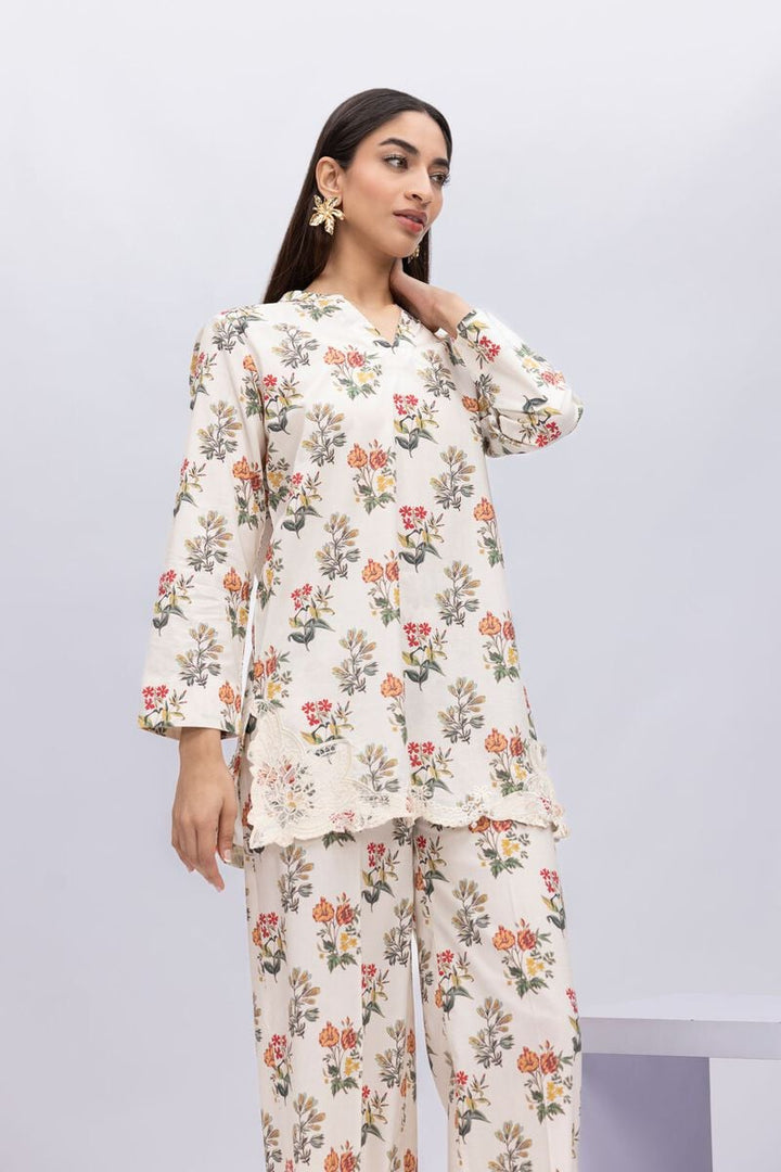 - Description: A short printed kurta featuring full sleeves and a round collar.