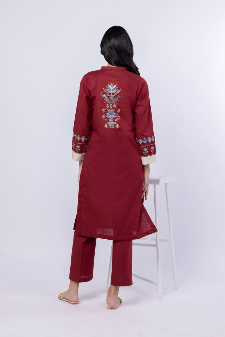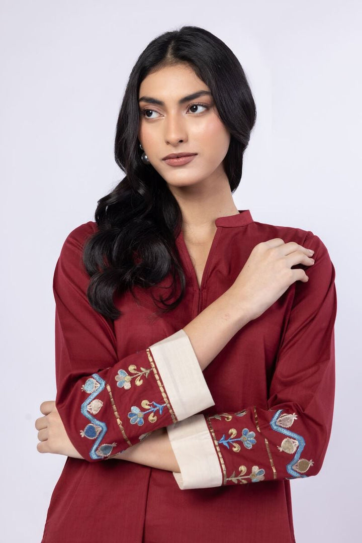 - Description: A long solid kurta featuring full embroidered sleeves and a band collar with a V-cut.
