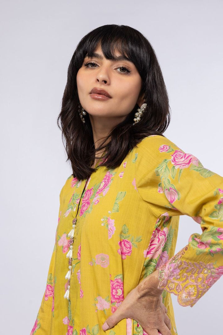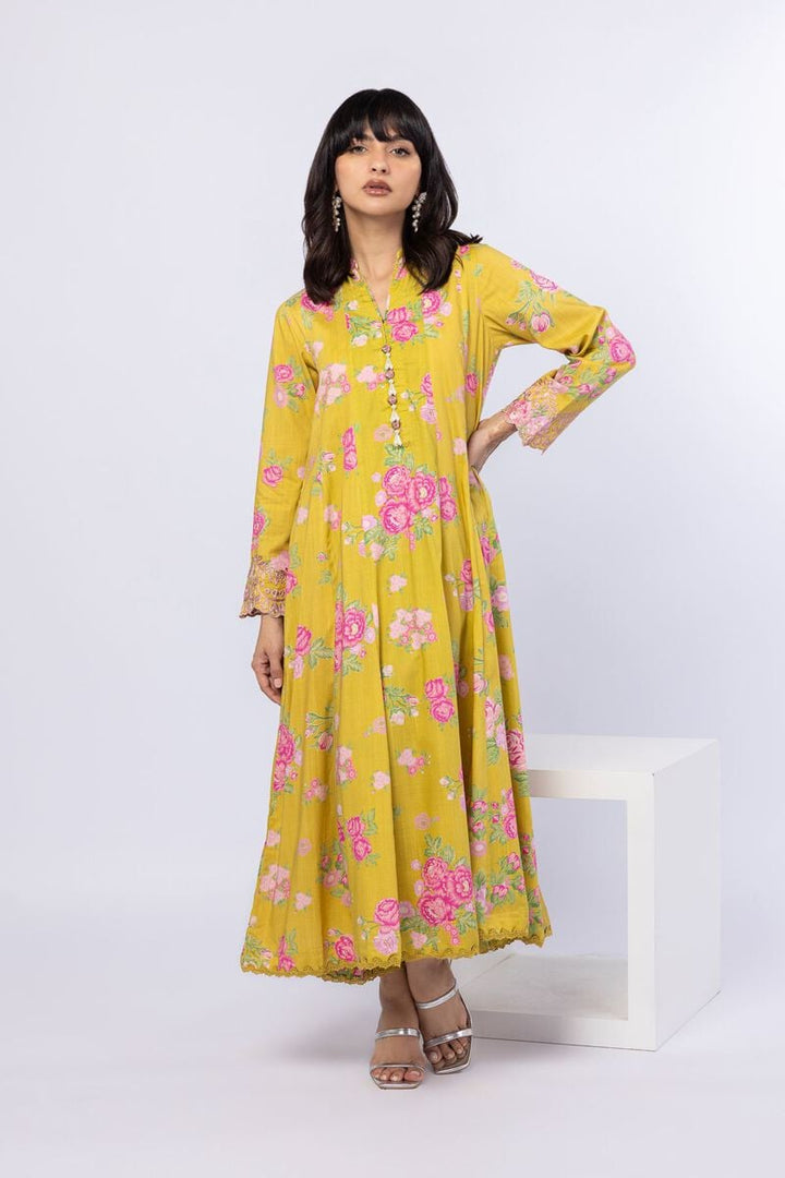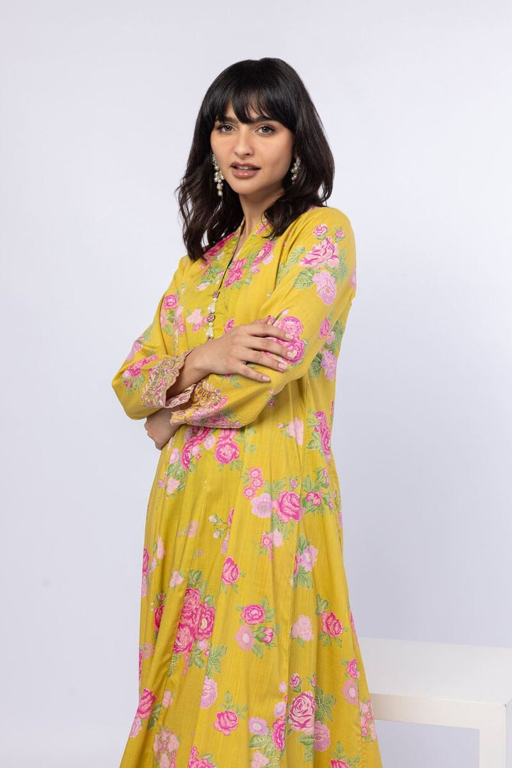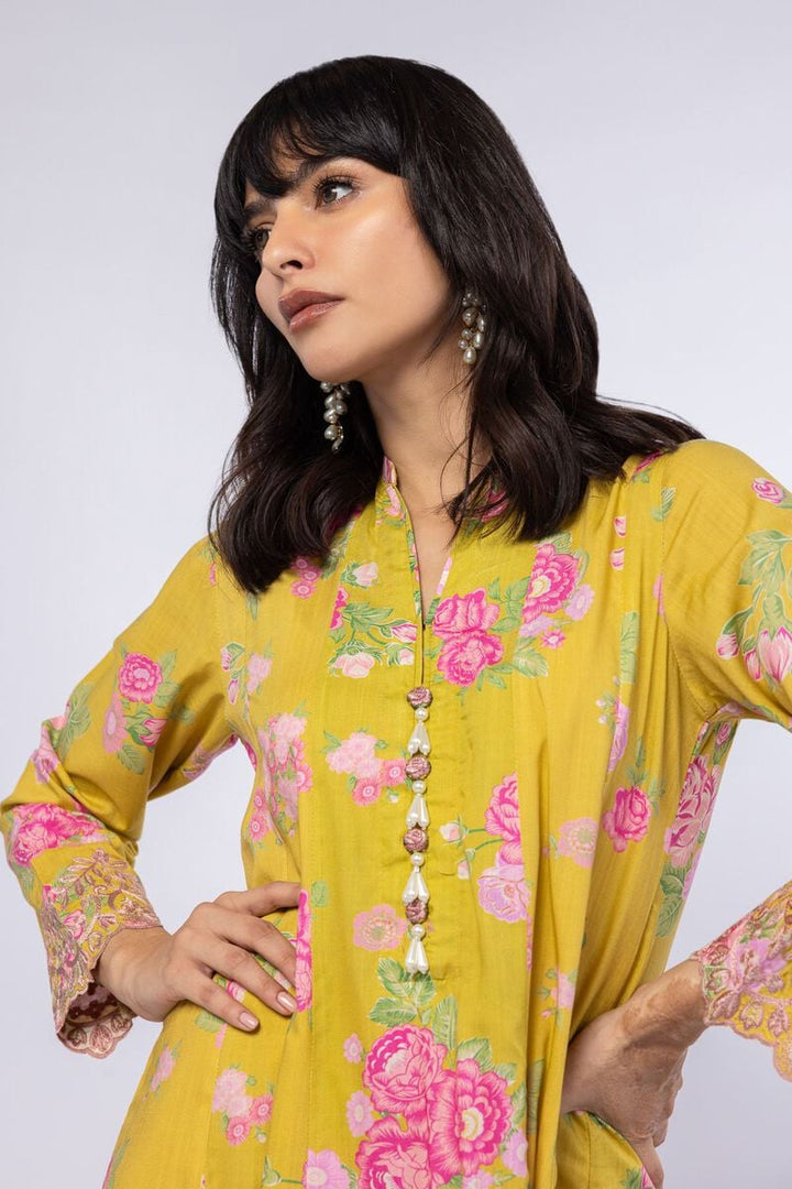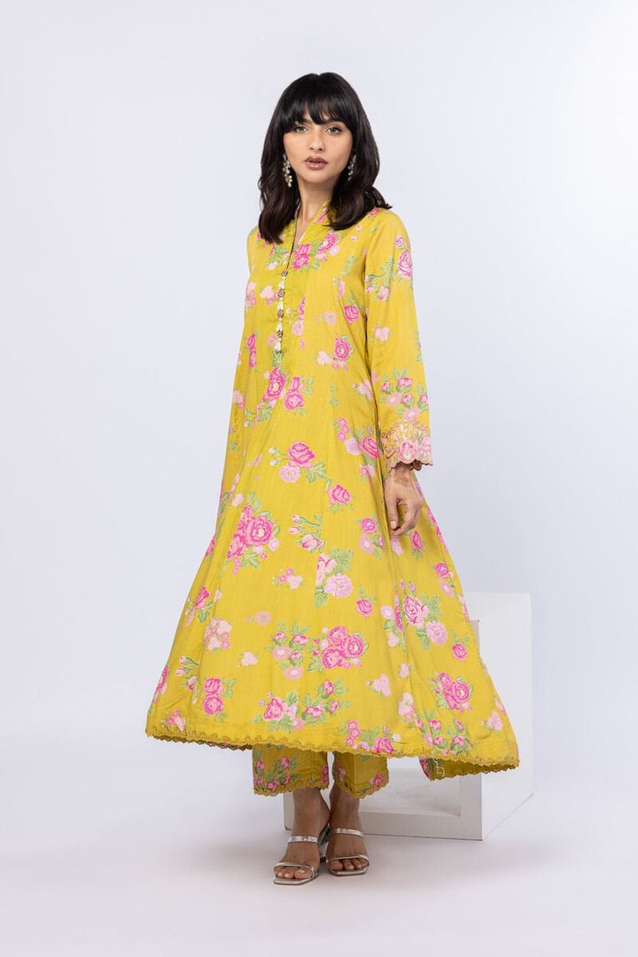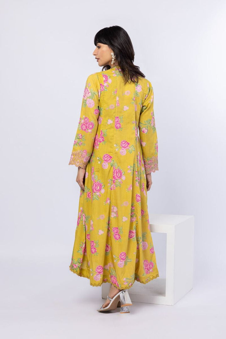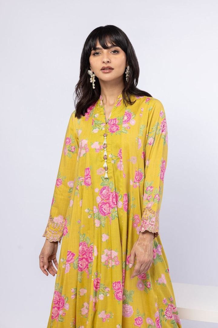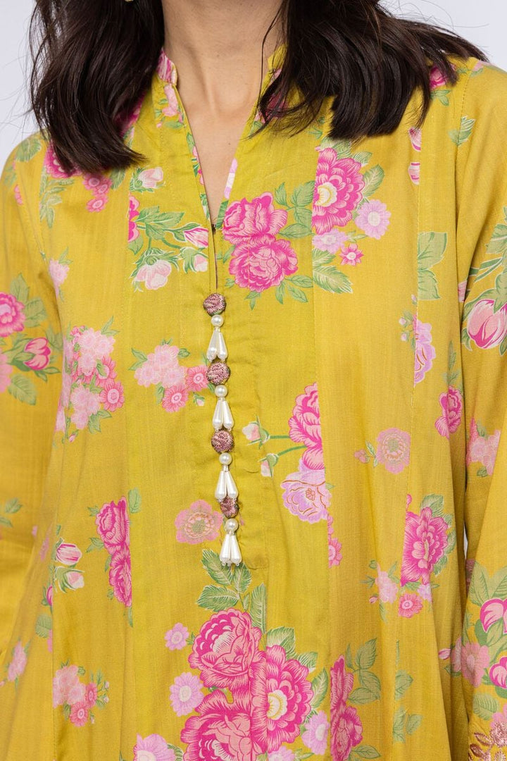 - Description: A long floral printed kurta featuring full sleeves with lace inserts, a band collar with a V-cut adorned with tassels, and embroidered detailing on the hem.