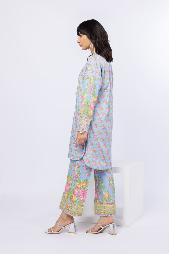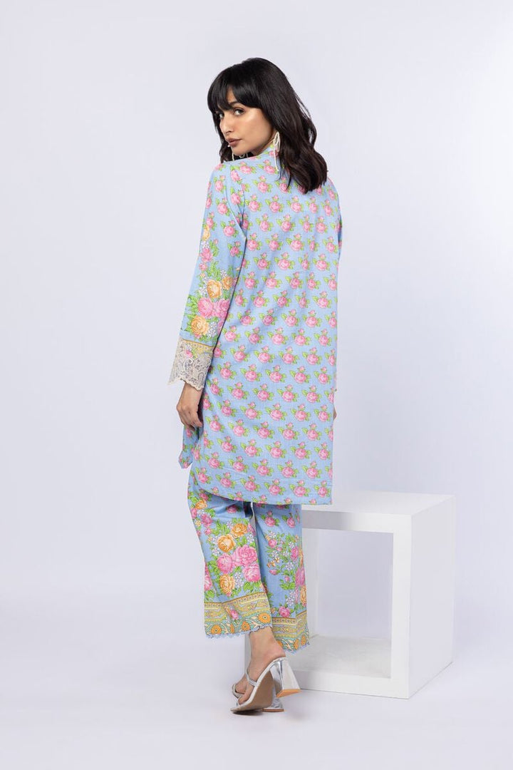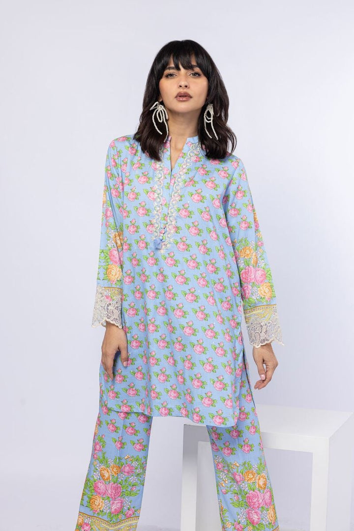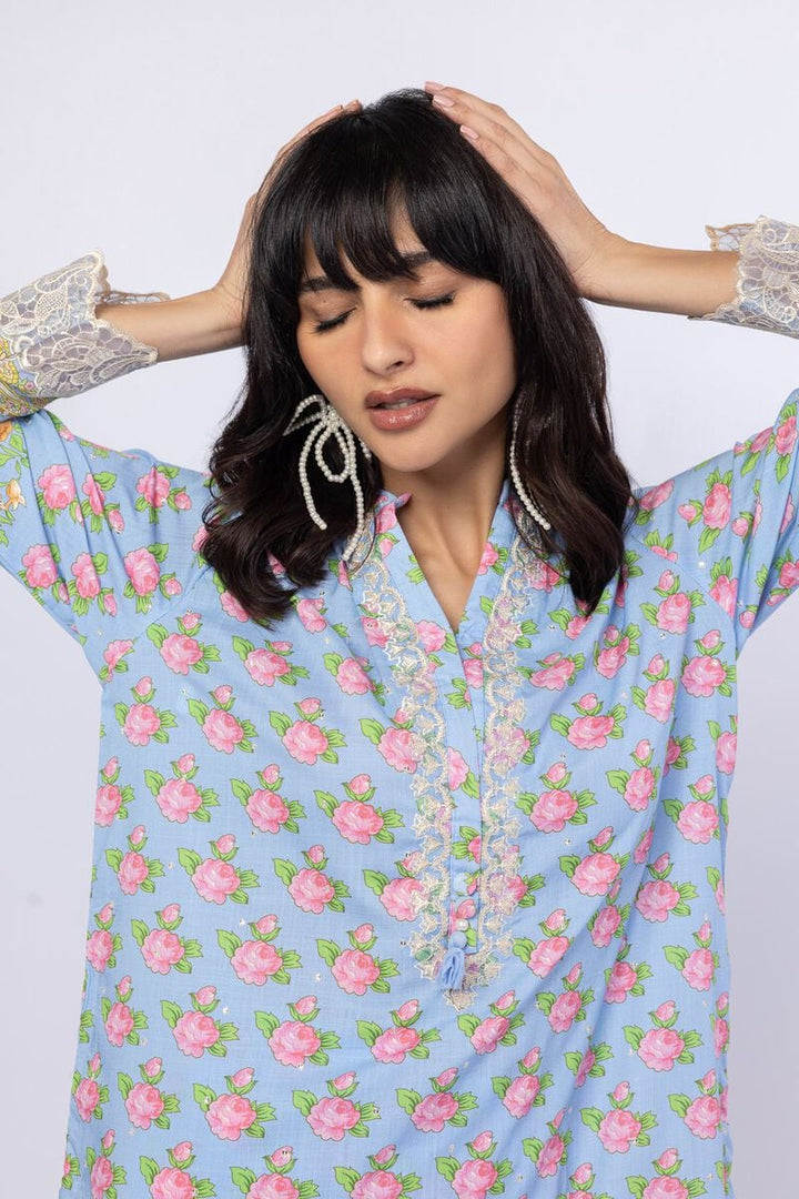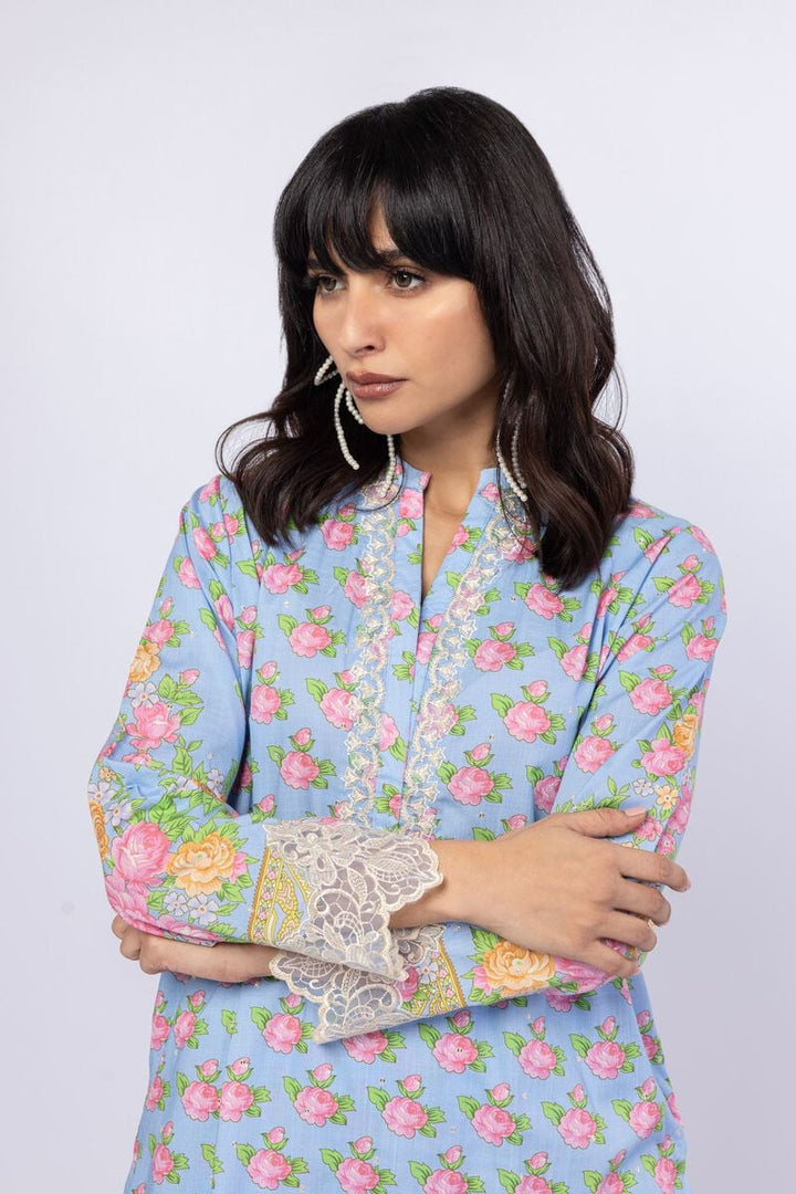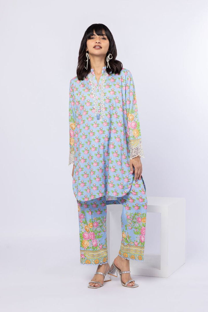 Description:A long floral print embroidered kurta featuring full sleeves with cut-work, a band collar with a V-cut and embellishments on the neckline and a rounded hem.