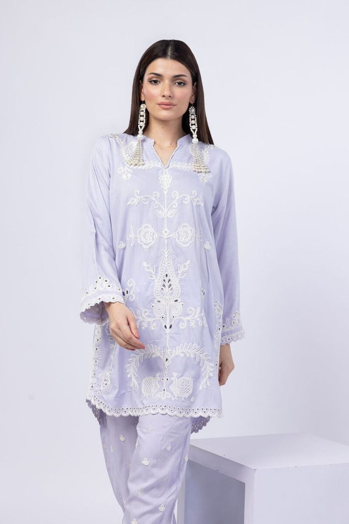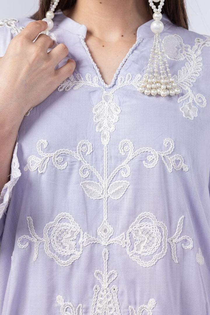 A short floral embroidered kurta featuring full sleeves and a band collar with a V-cut.