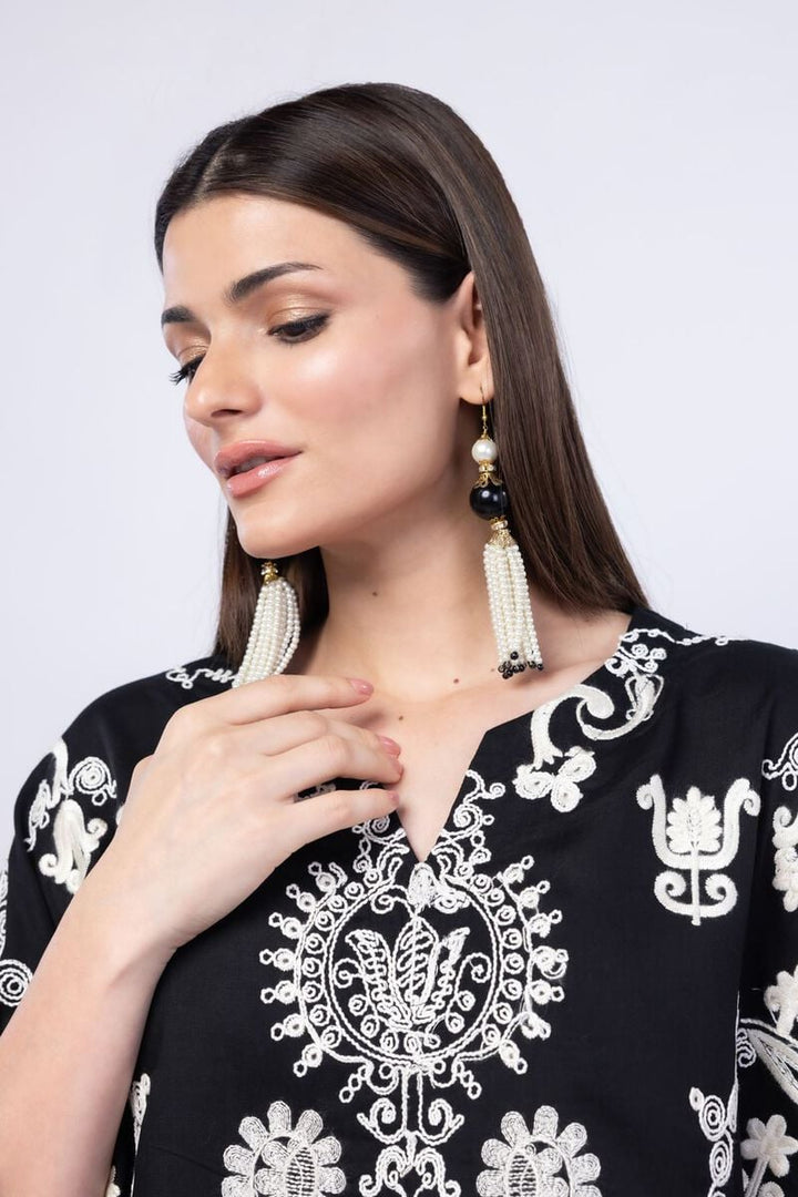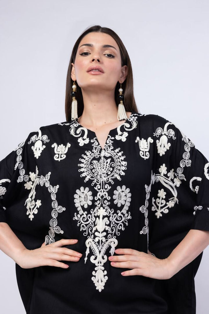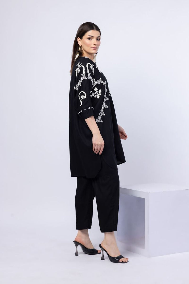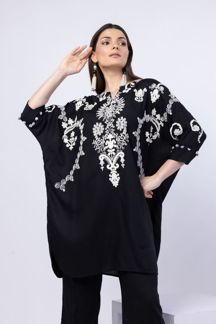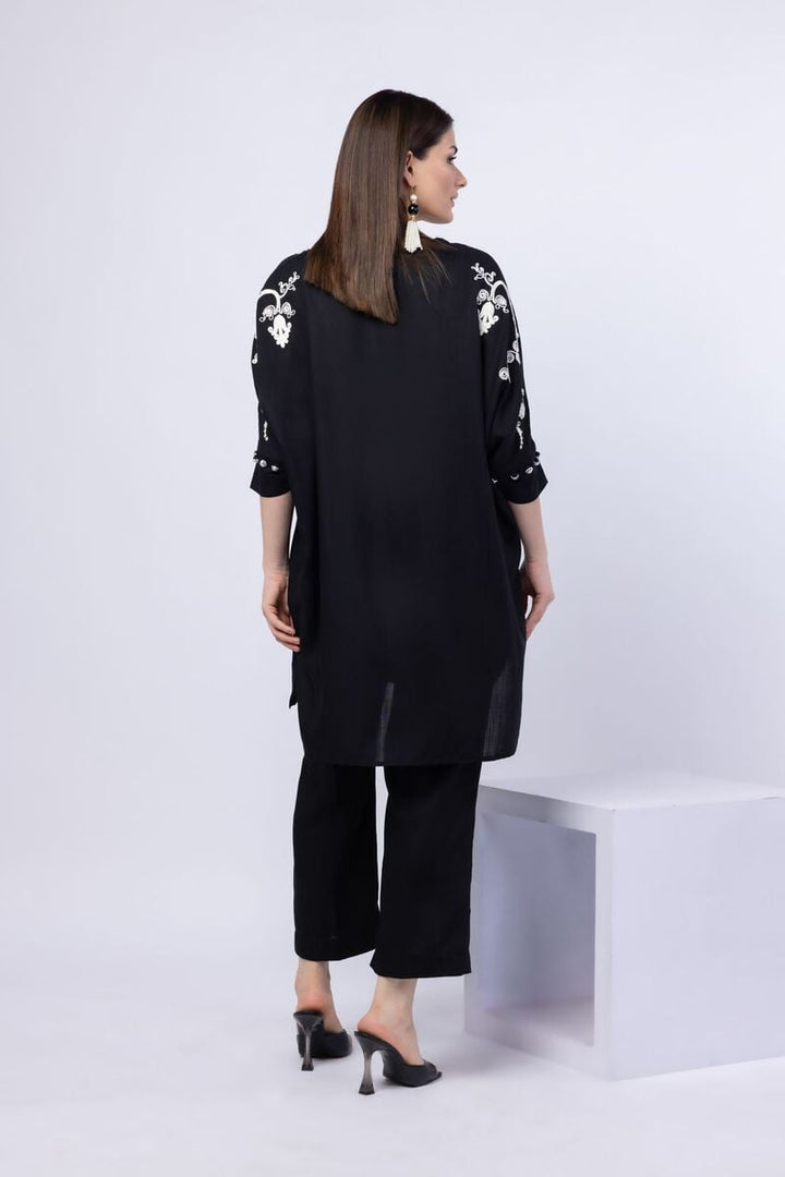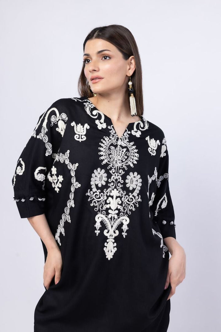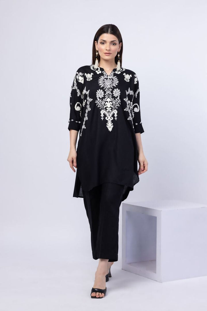 - Description: A floral embroidered kurta featuring short sleeves and a round neckline with a V-cut.