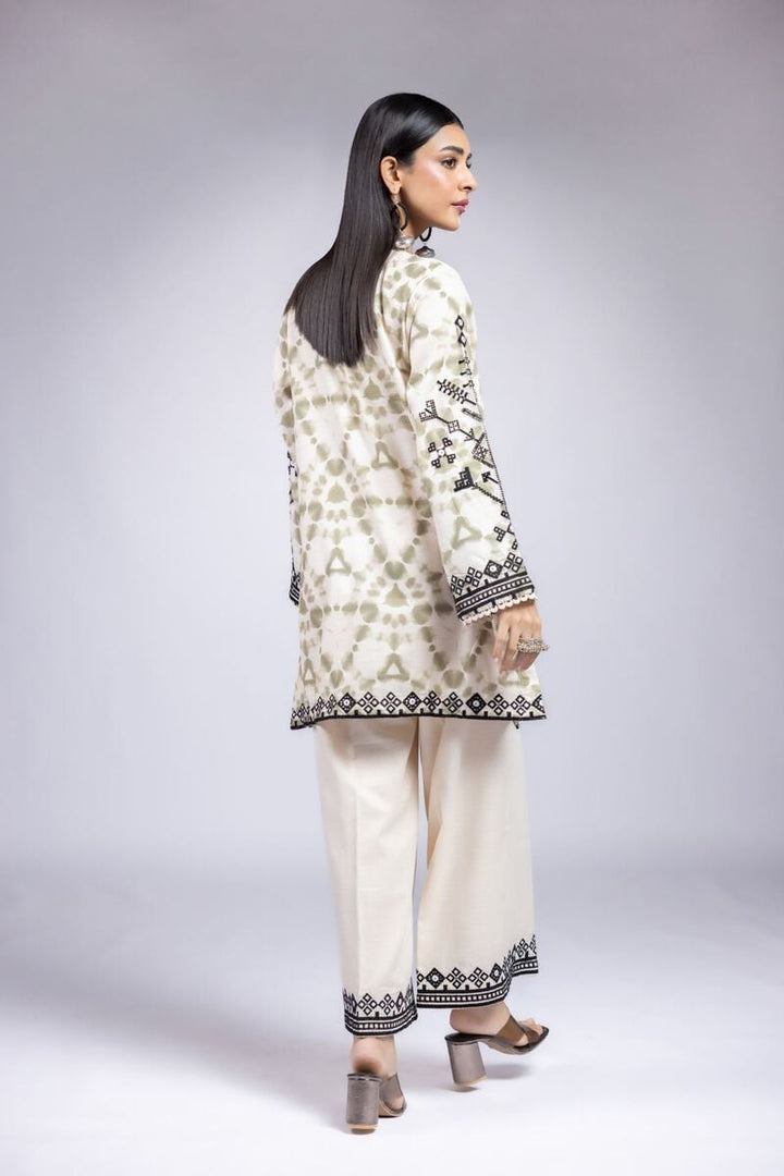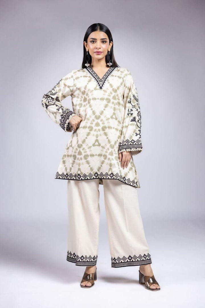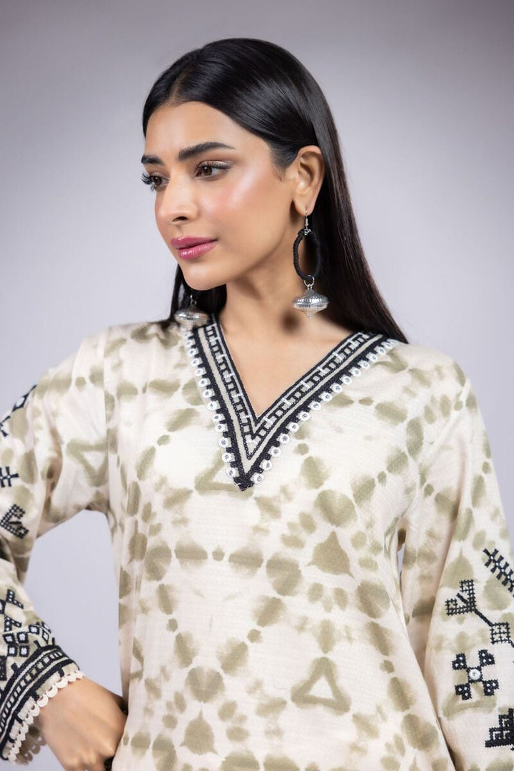 Description: A short printed embroidered kurta featuring full sleeves and a neckline with a V-cut.
