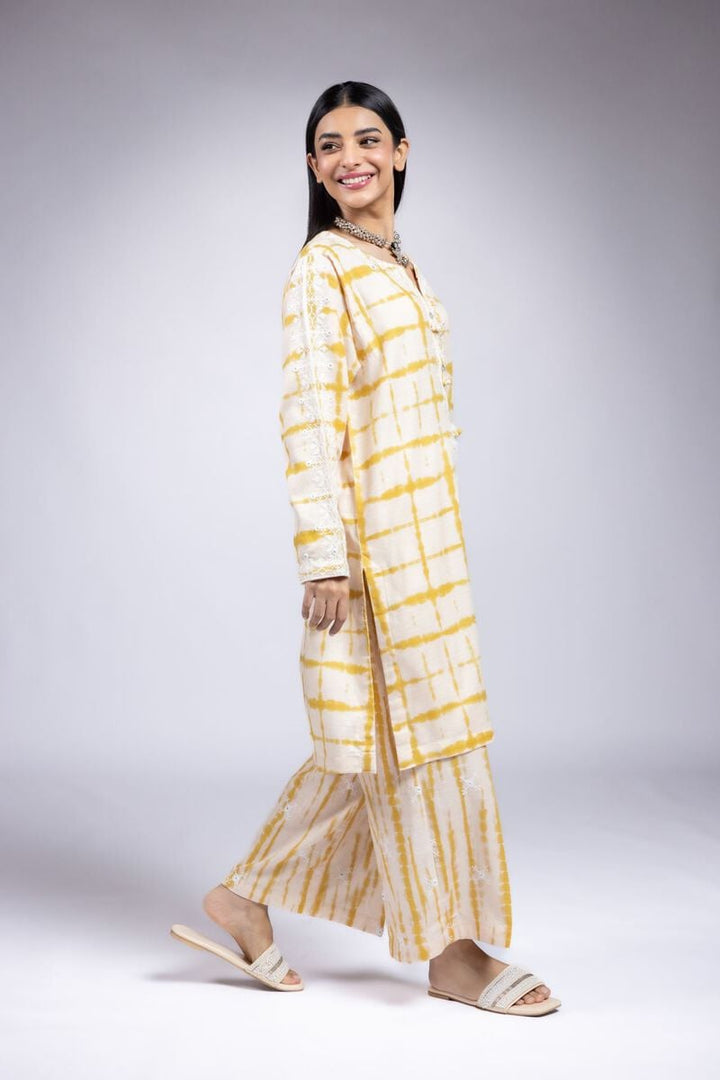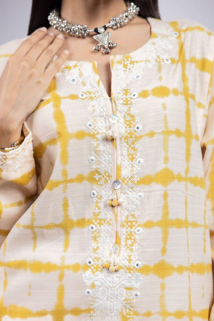 - Description: A printed embroidered kurta featuring full sleeves and a round neckline with a V-cut.