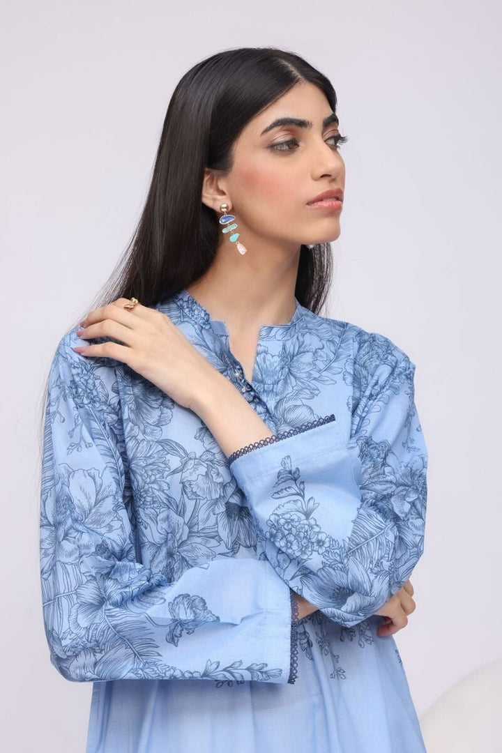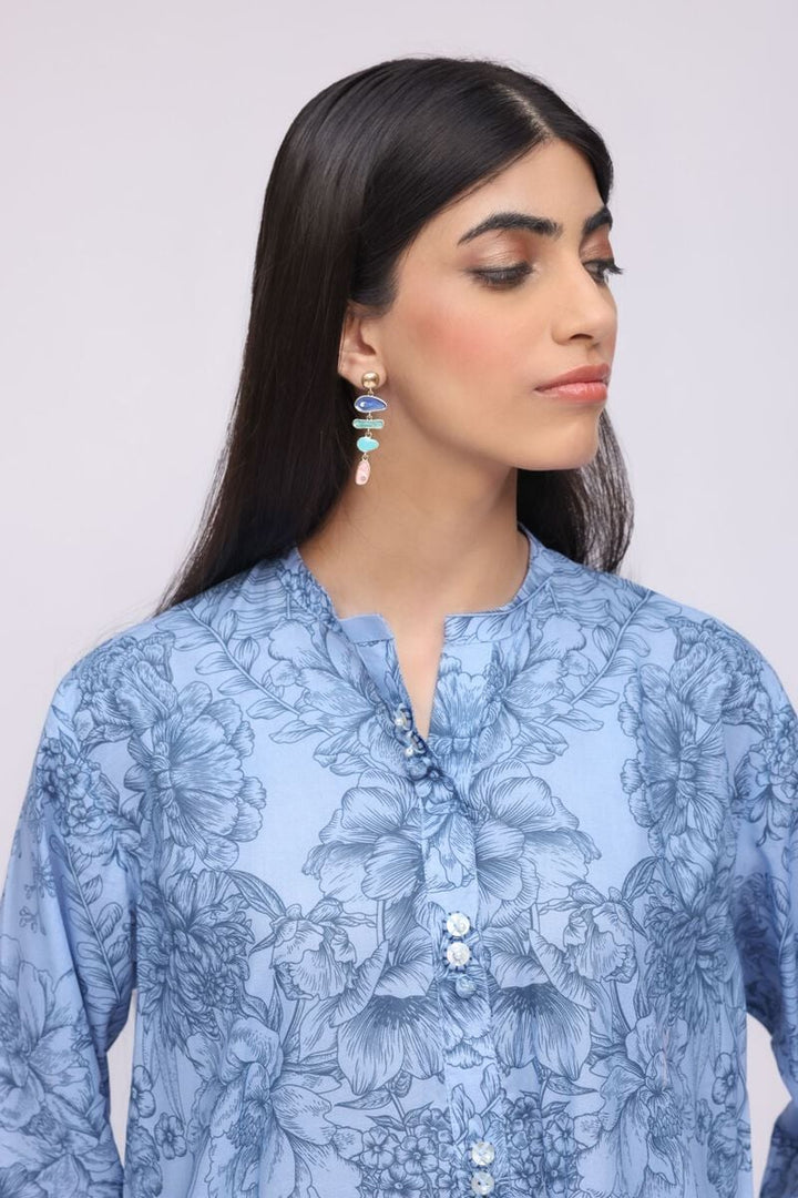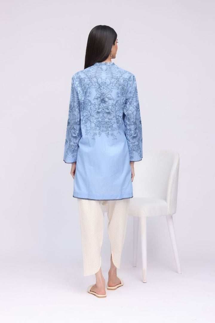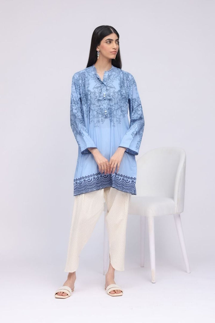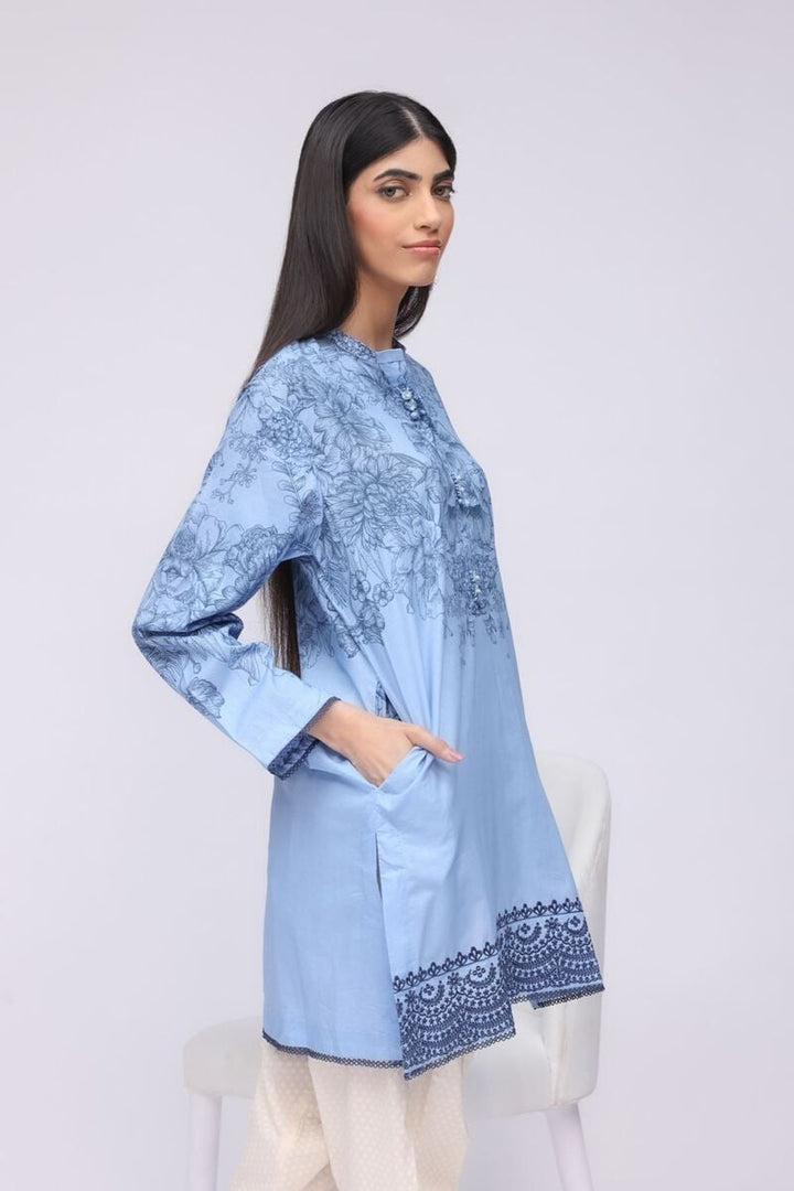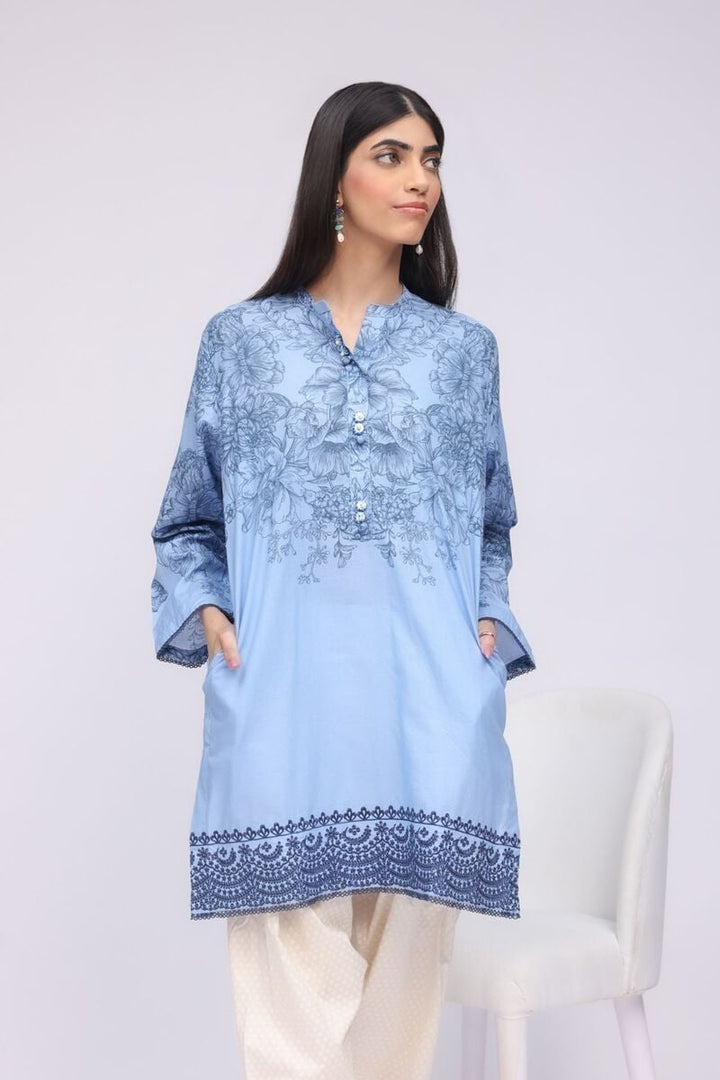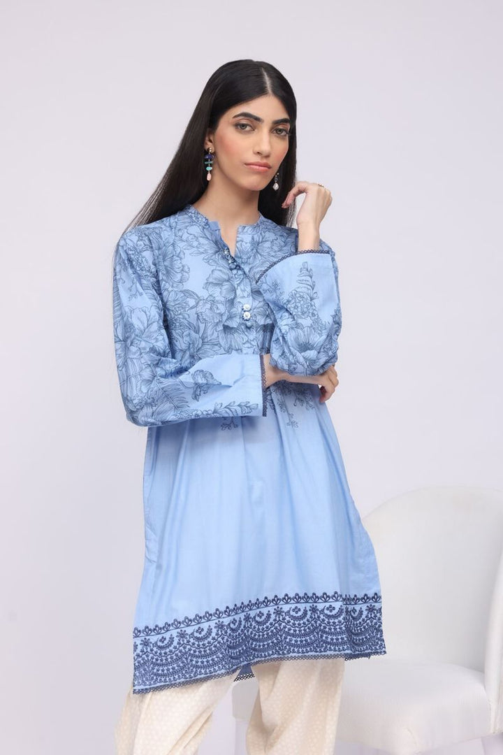 A short floral print embroidered kurta featuring three-quarter sleeves and a round neckline with buttons.