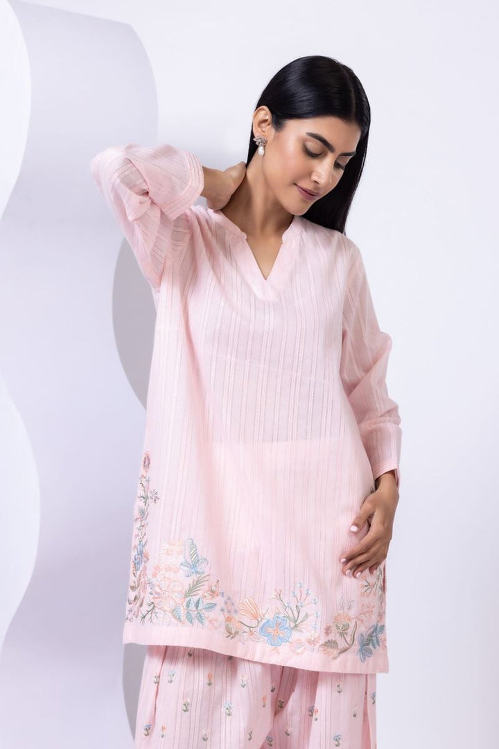 A short floral embroidered kurta featuring full sleeves and a band collar with a V-cut.