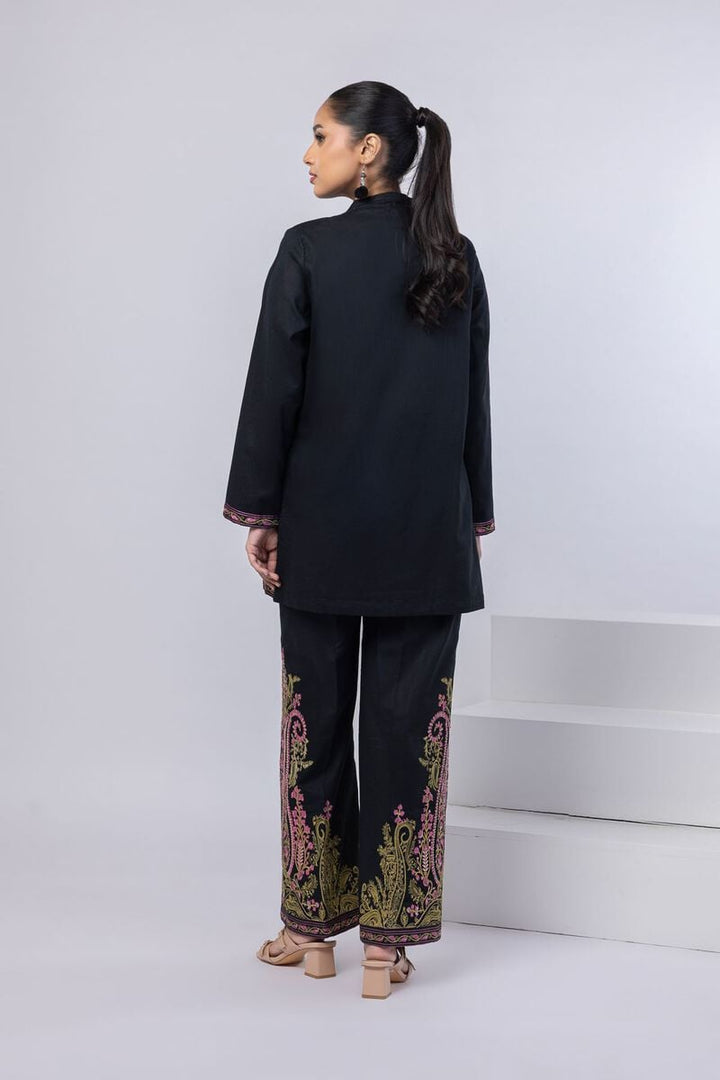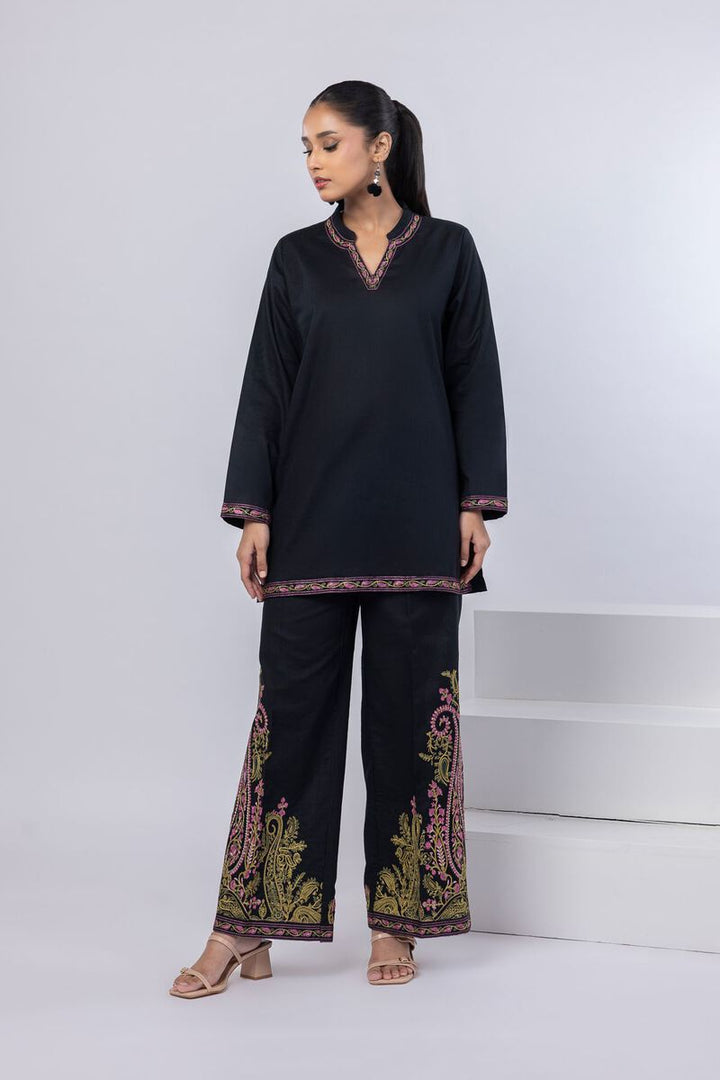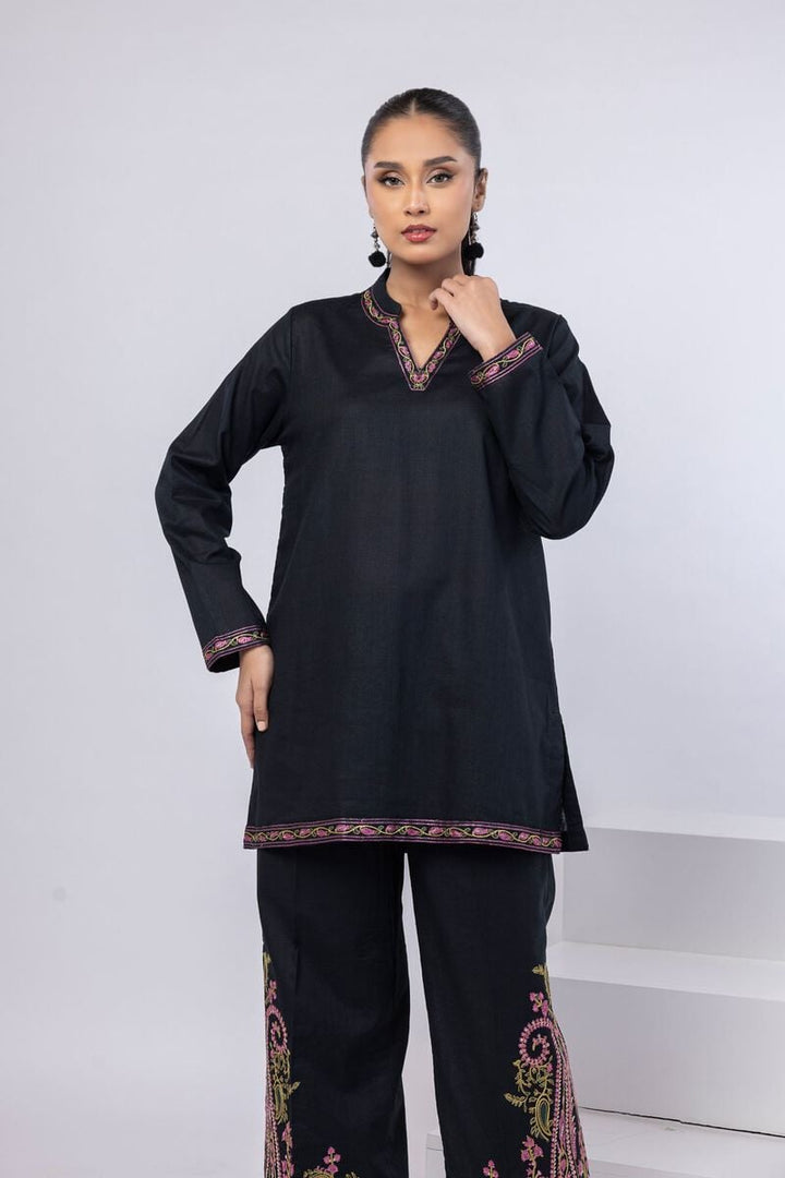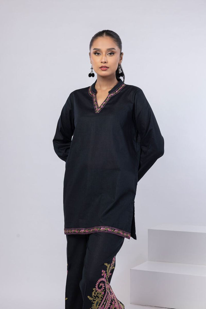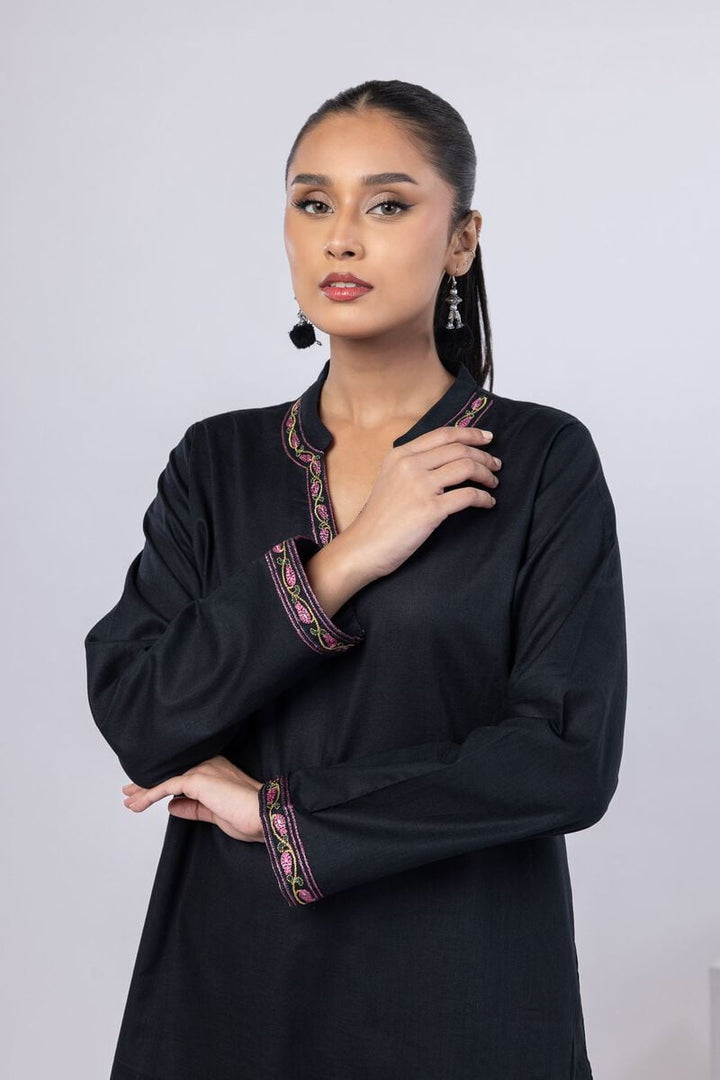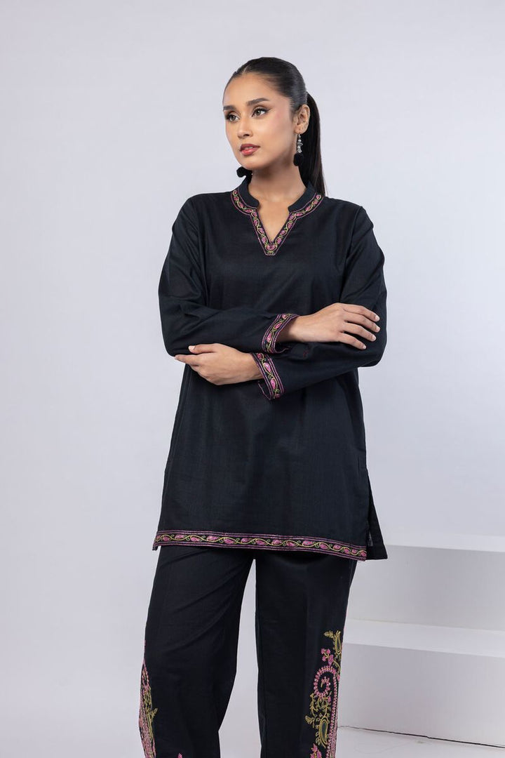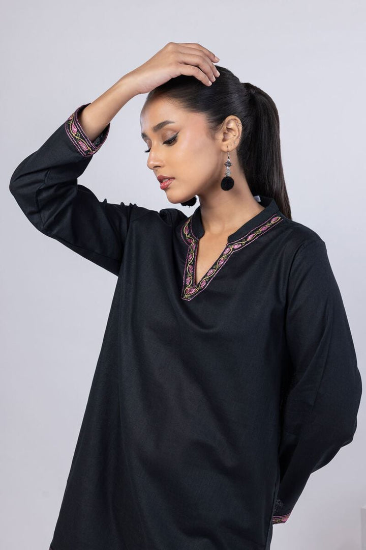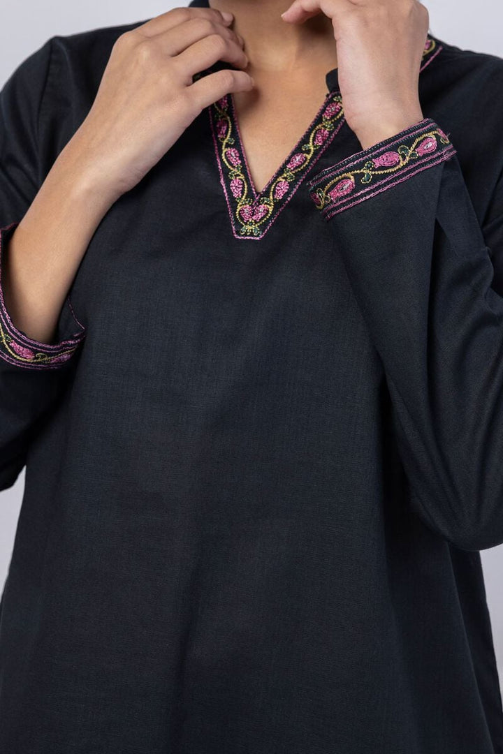 A short embroidered kurta featuring full sleeves and a band collar with a V-cut.