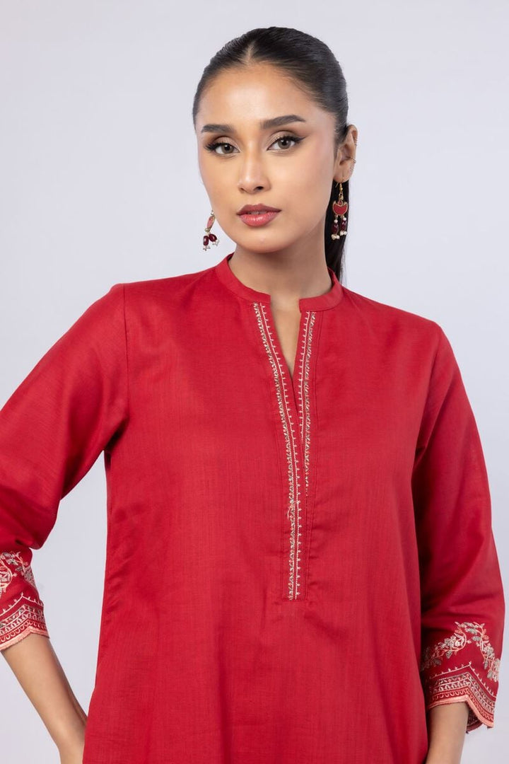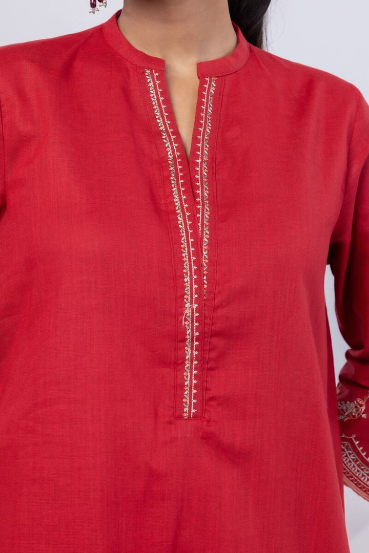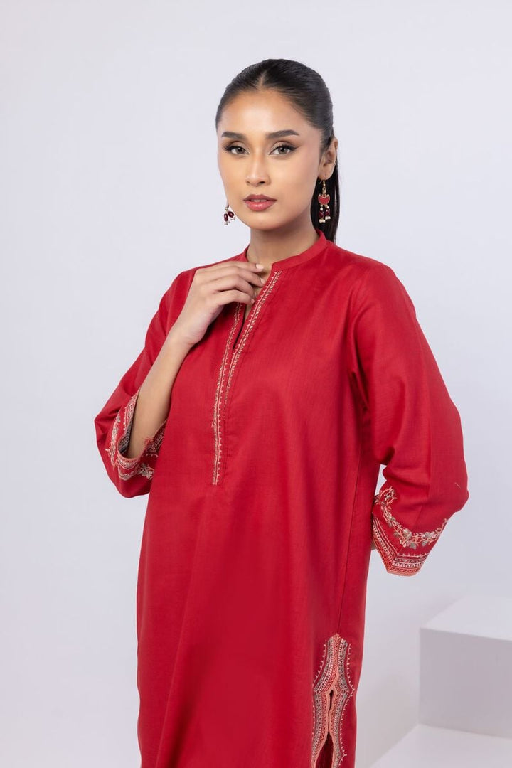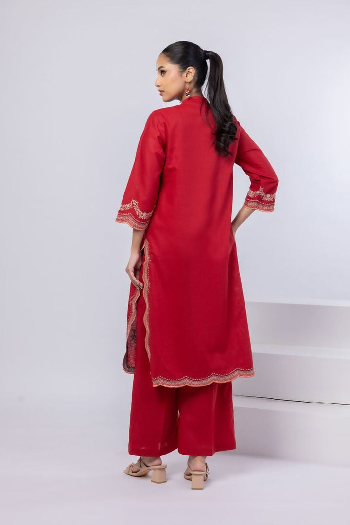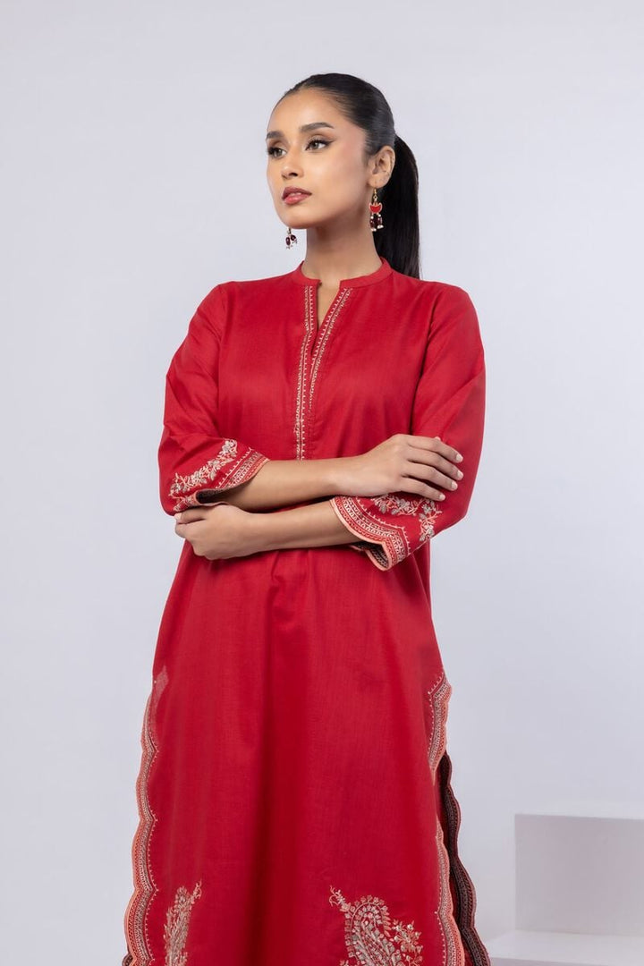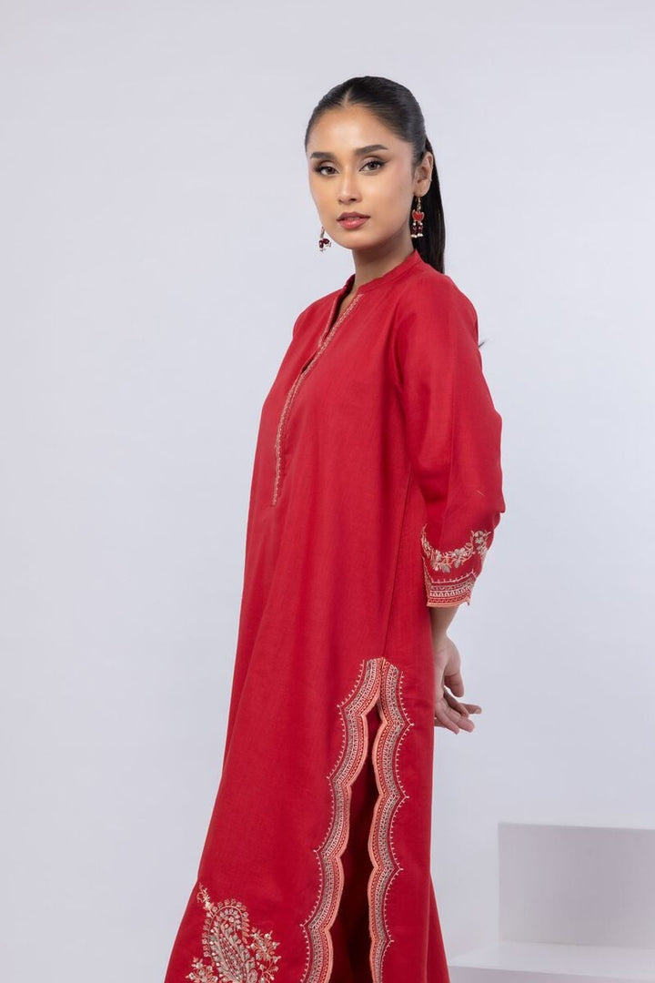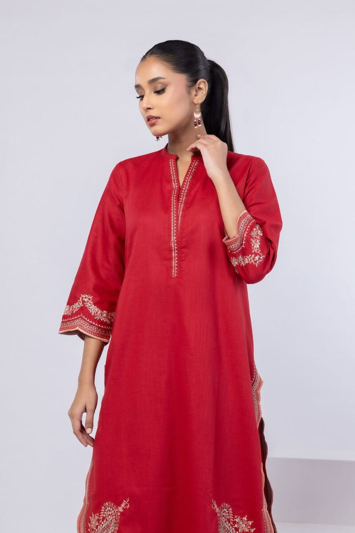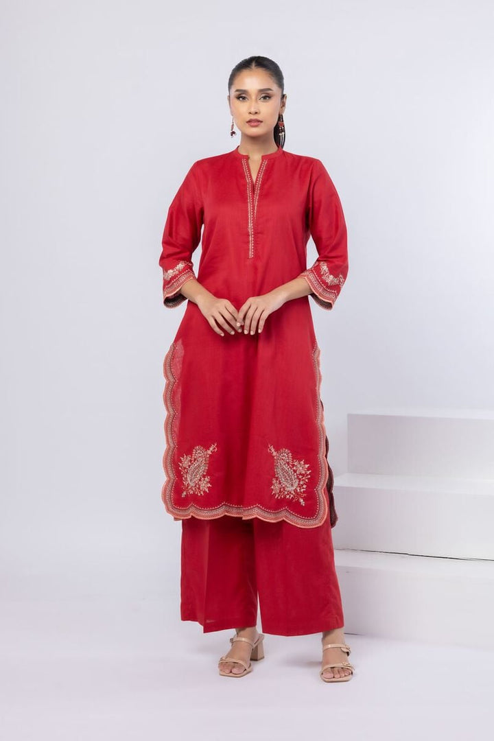 A long floral embroidered kurta featuring full sleeves, a band collar with a V-cut, and a scalloped hem.