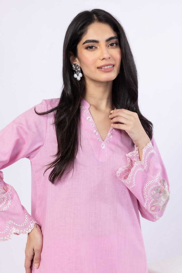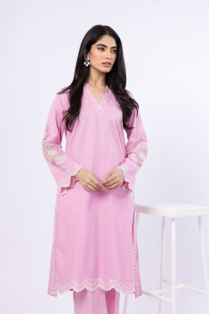 - Description: A long floral embroidered kurta featuring a band collar and a scalloped design on the hem and full sleeves.