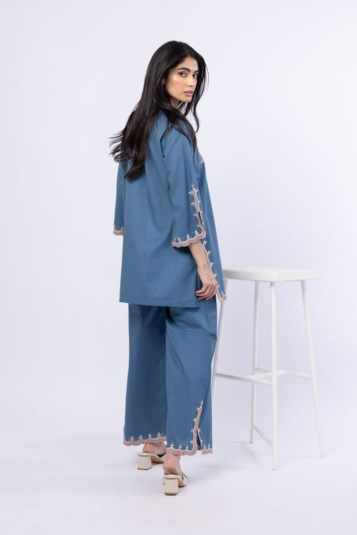 - Description: A short embroidered kurta featuring a scalloped hem and three-quarter sleeves with a slit.