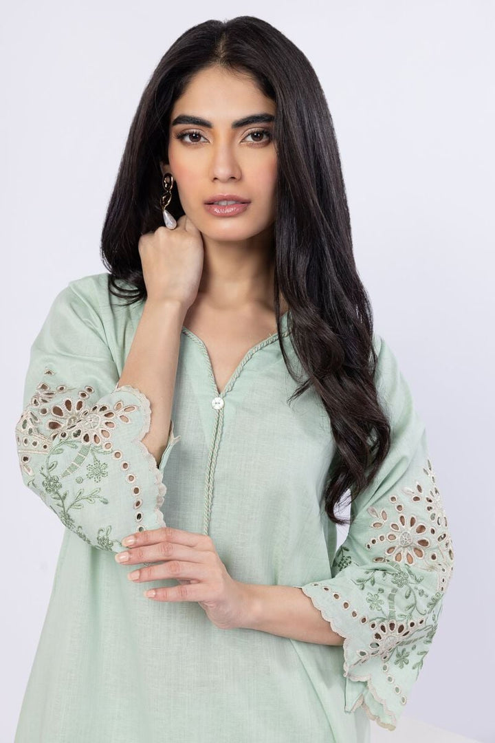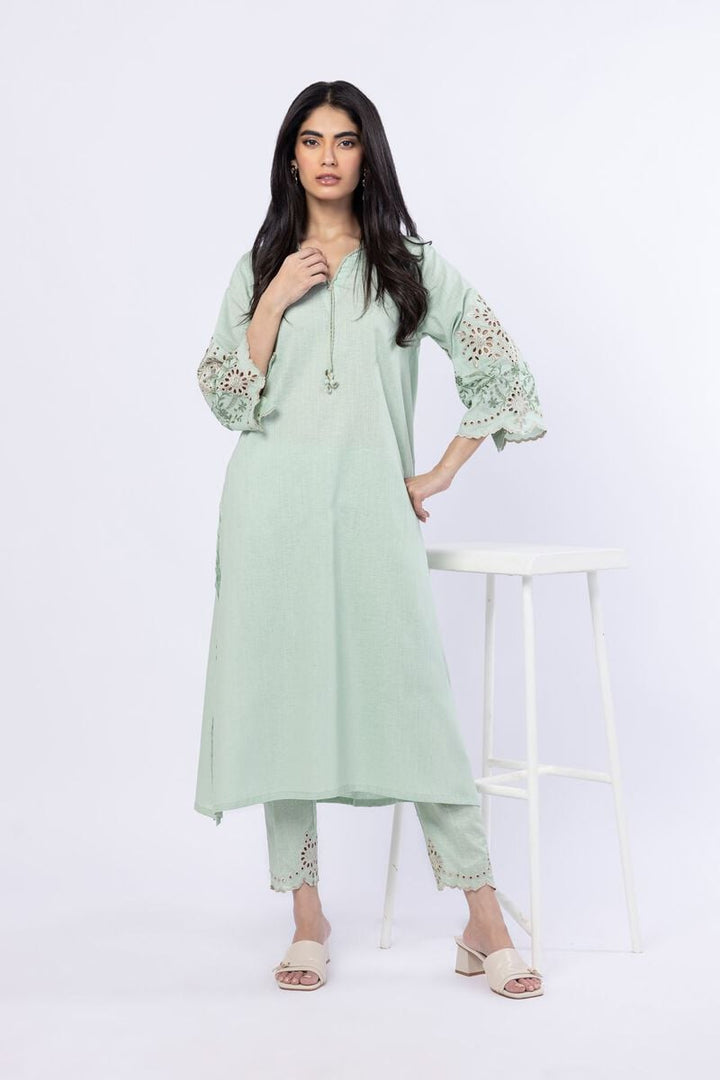 - Description: A long floral embroidered kurta featuring full sleeves with cutwork embroidery and a band collar with a V-cut.