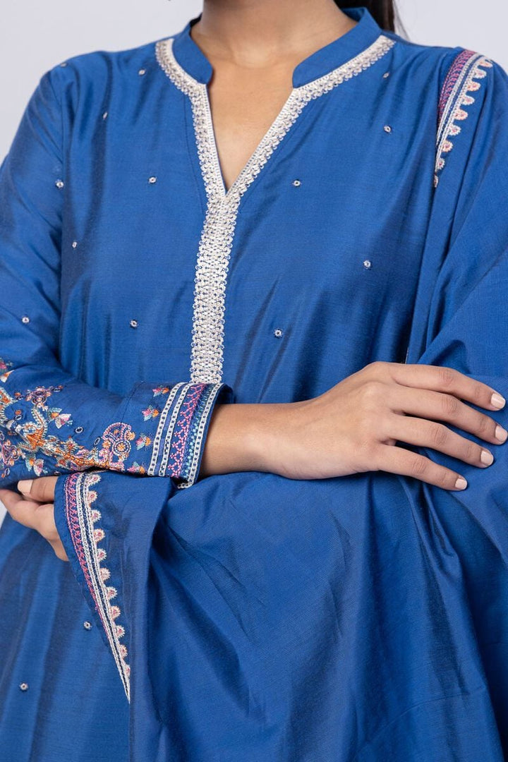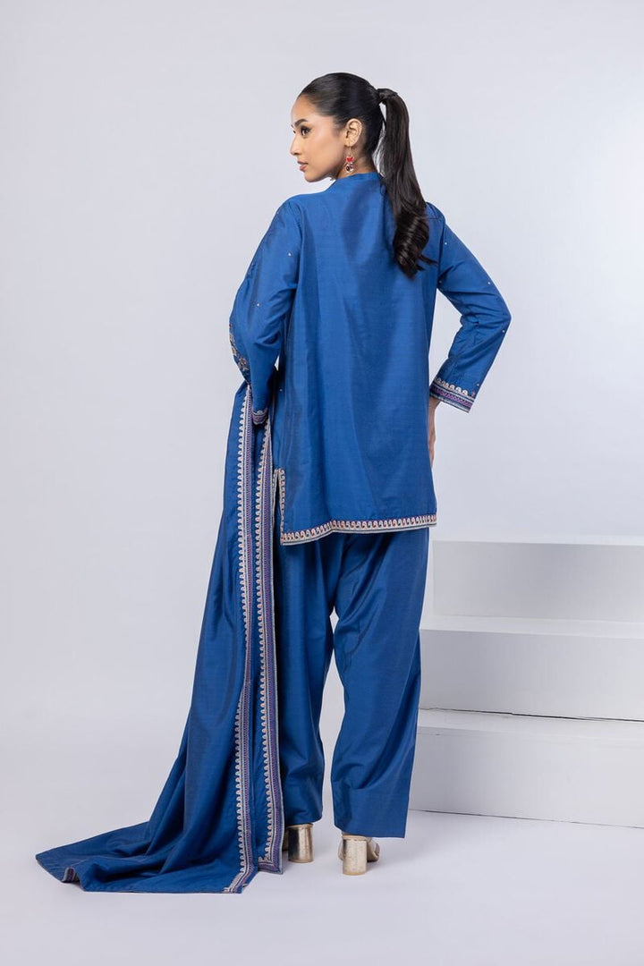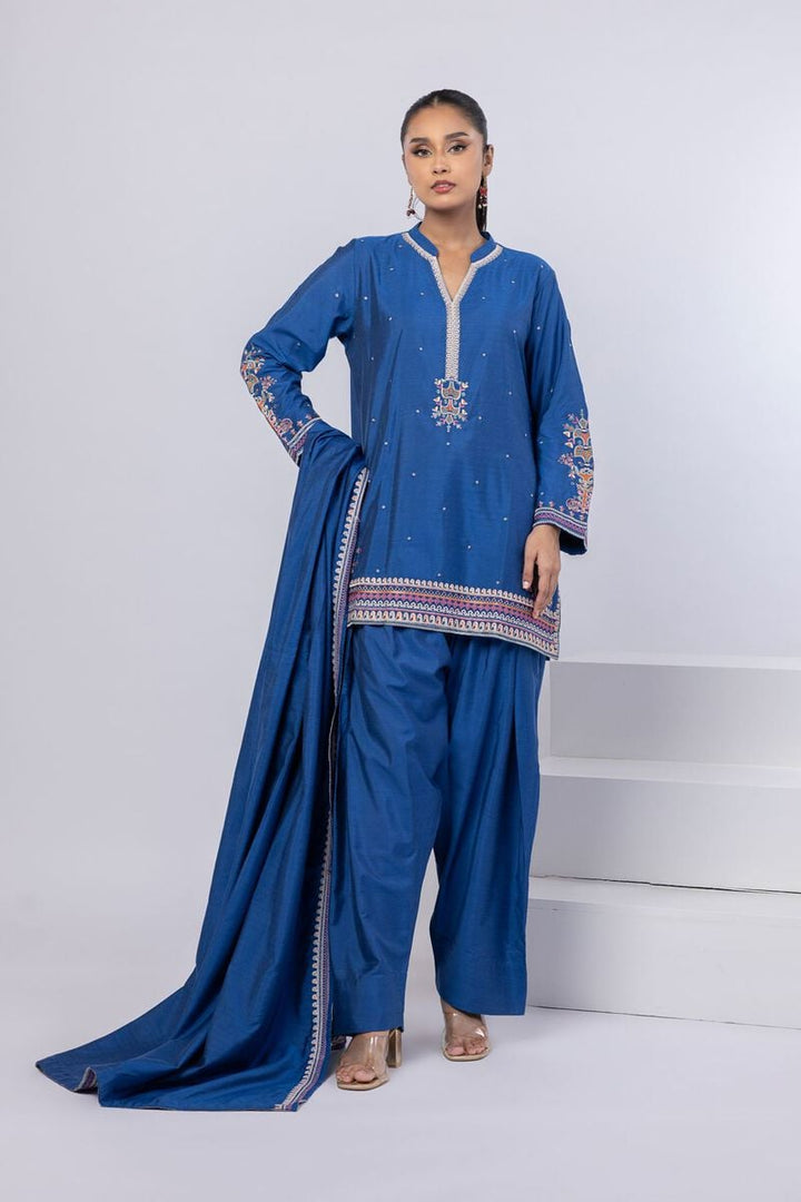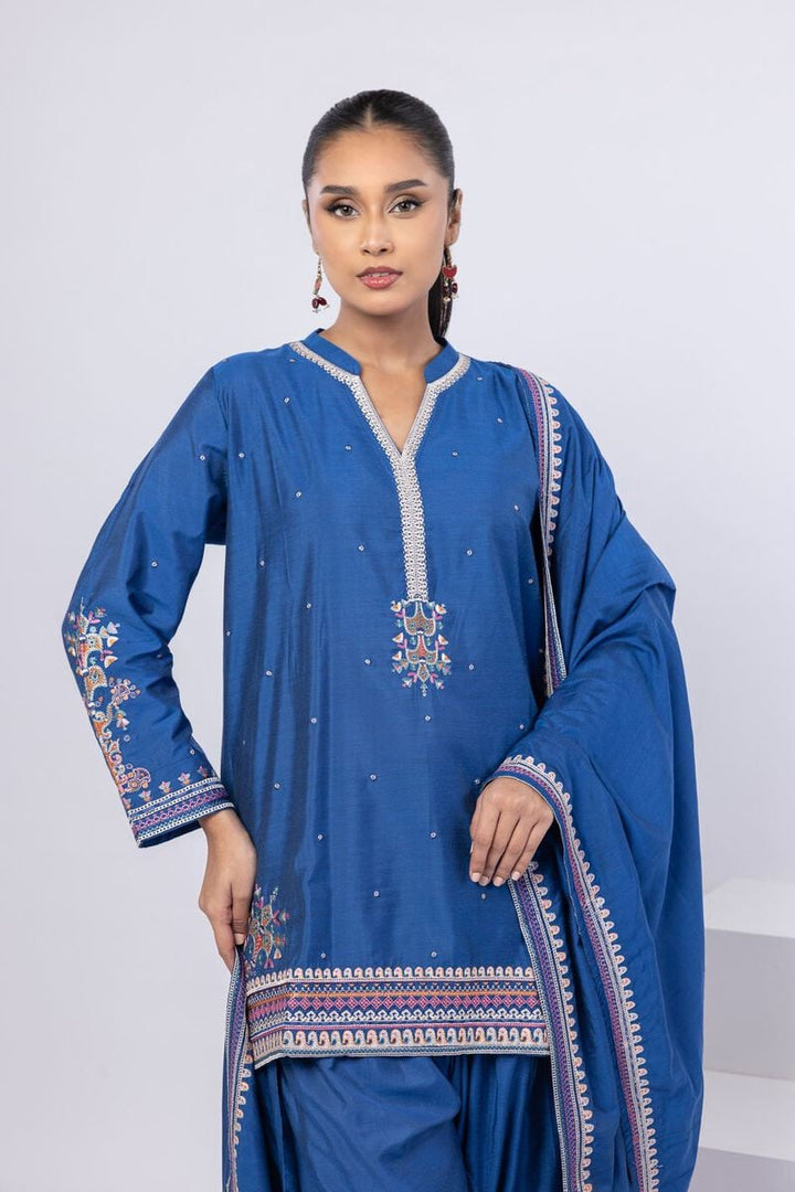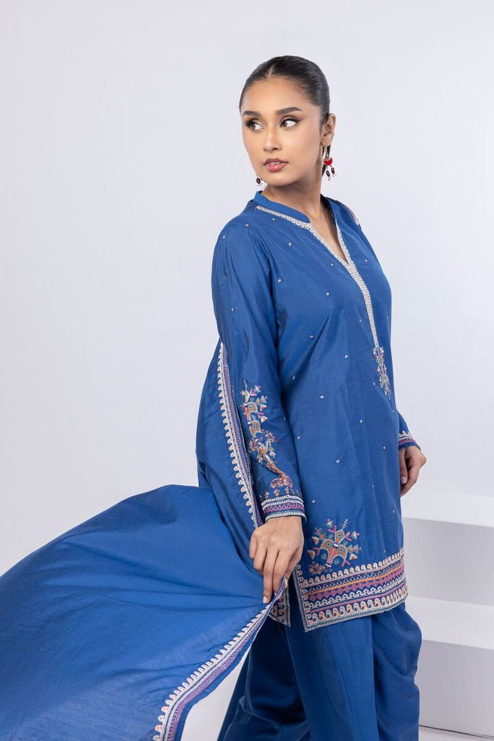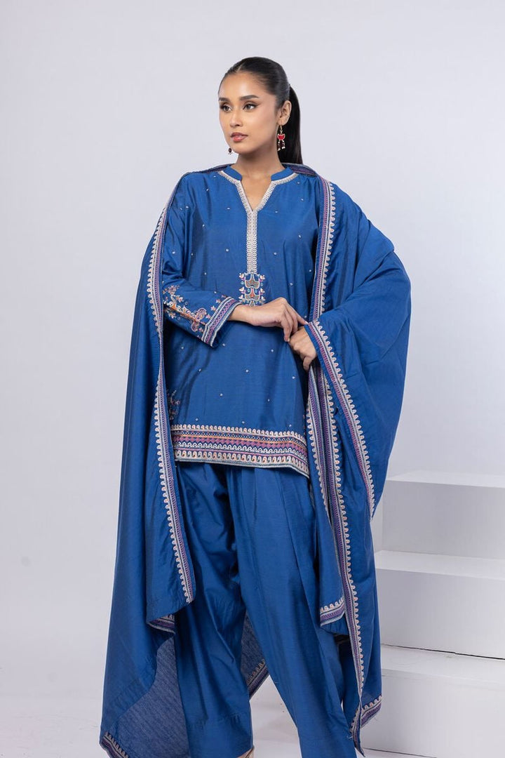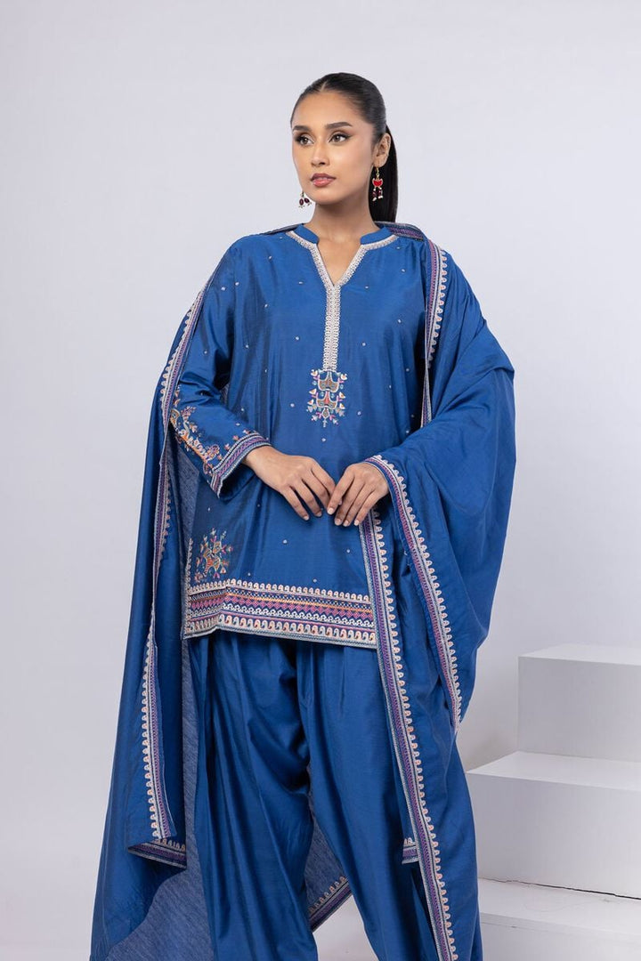 - Description: 3-piece outfit featuring a short embroidered kurta with full sleeves and a band collar with a V-cut, paired with a solid shalwar and a matching embroidered dupatta.