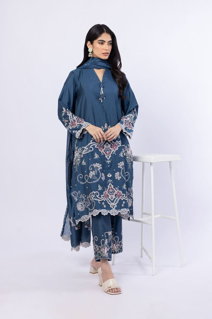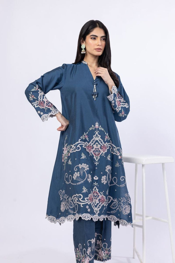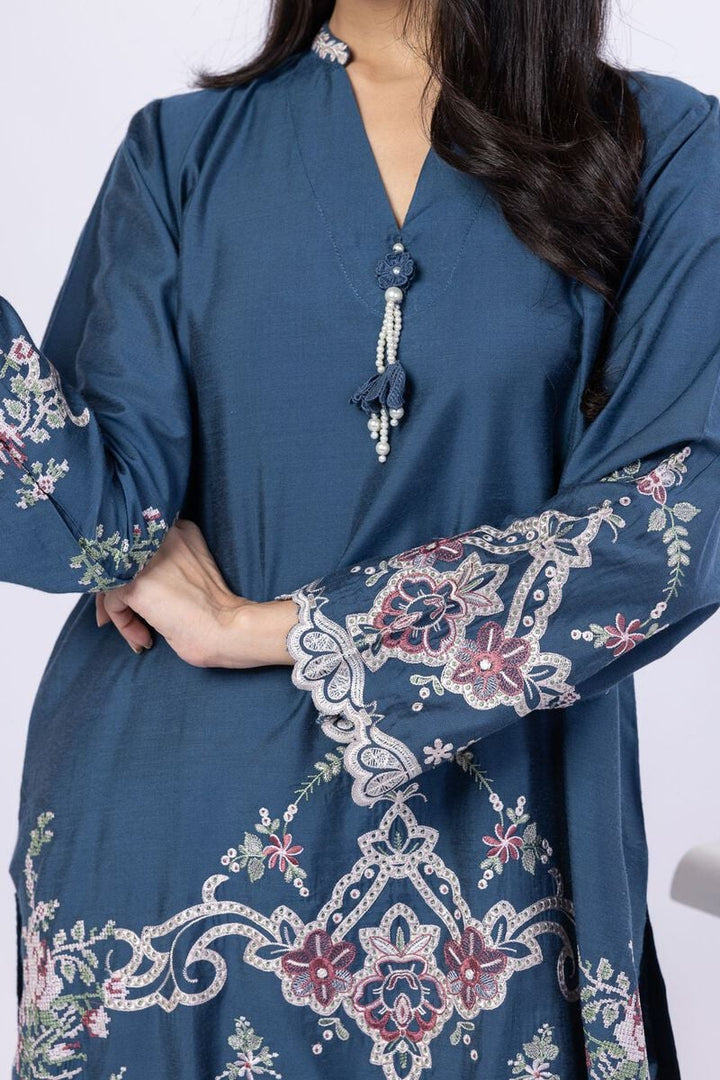 - Description: A long floral embroidered kurta featuring full sleeves with embroidery and a band collar with a V-cut.