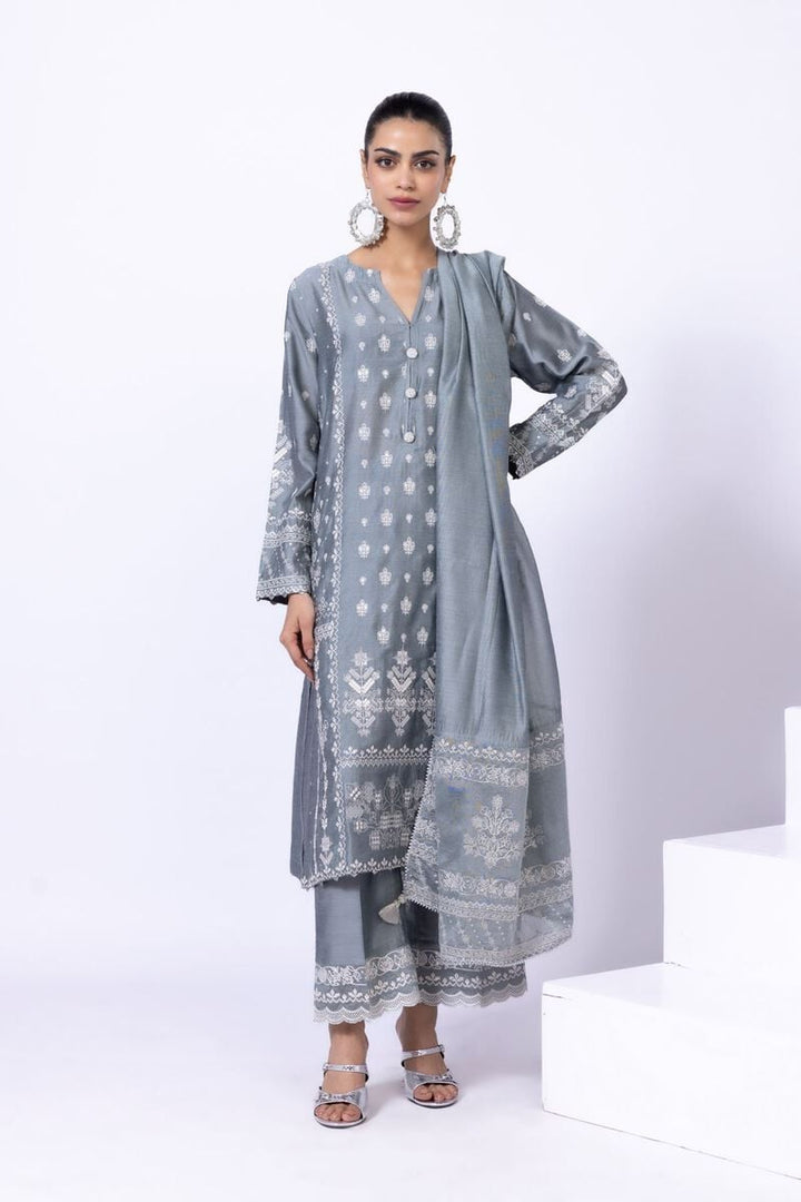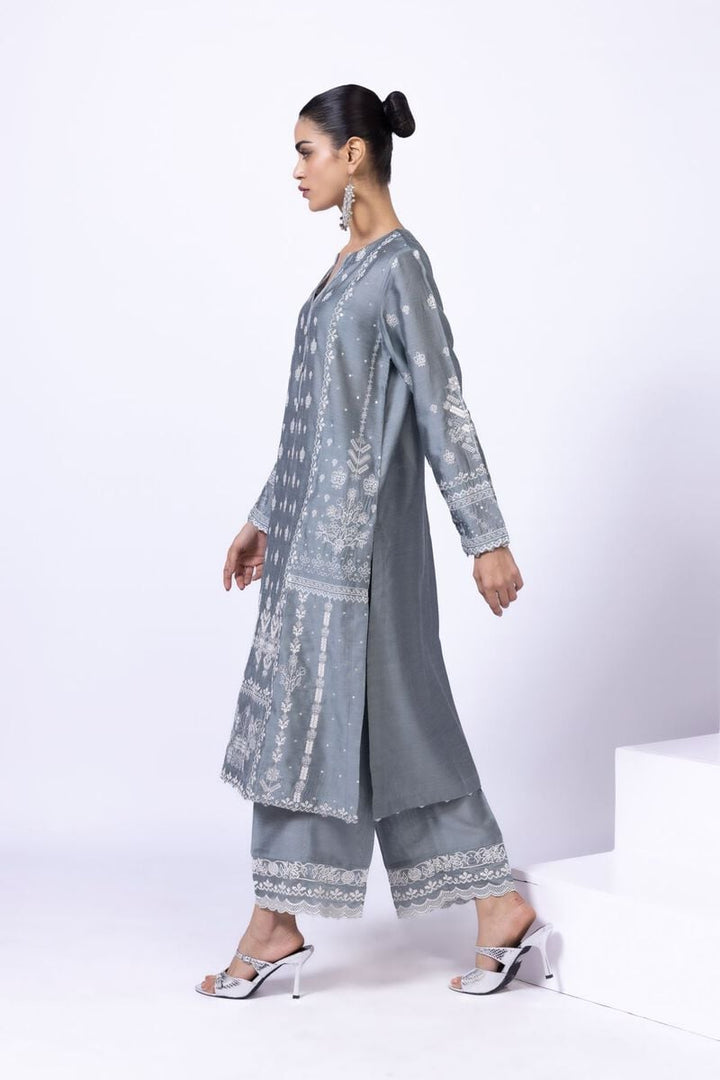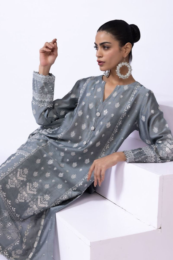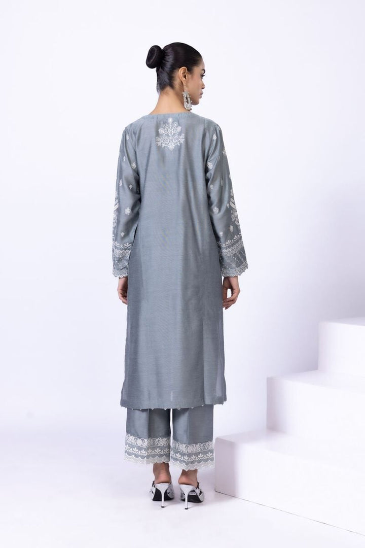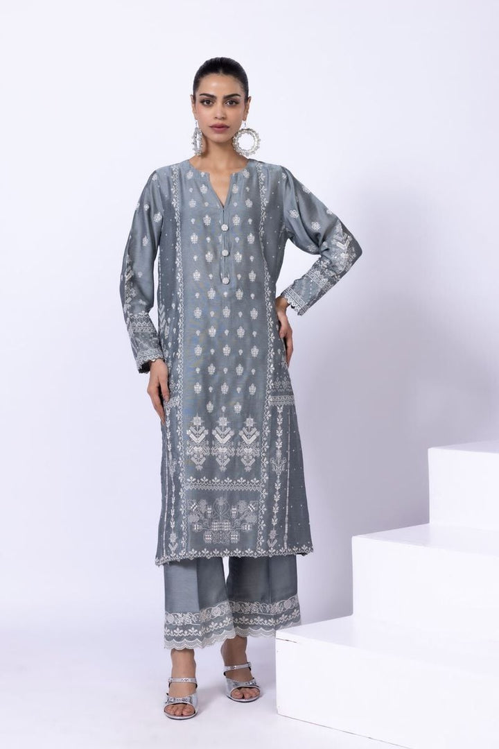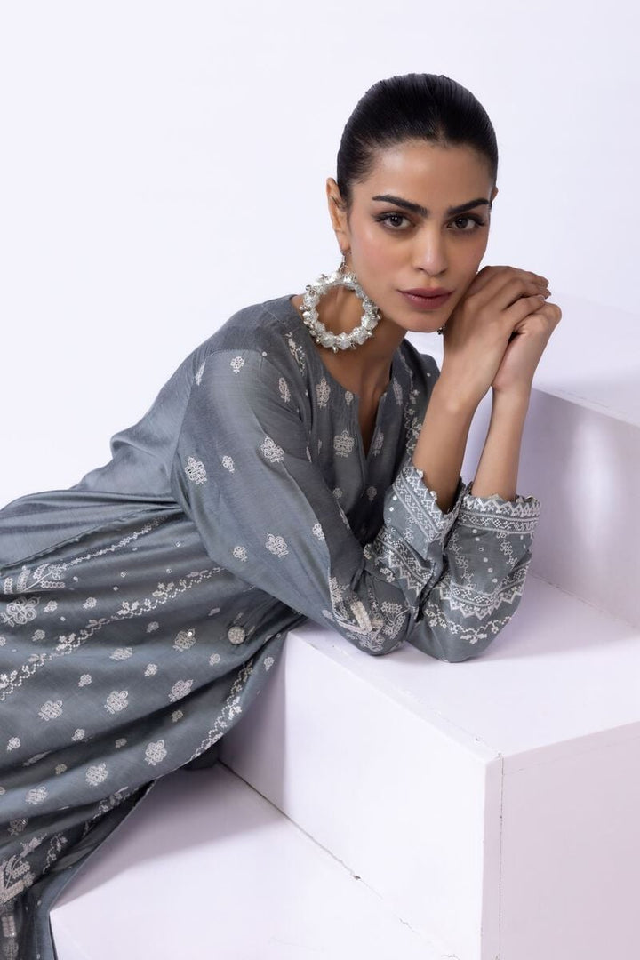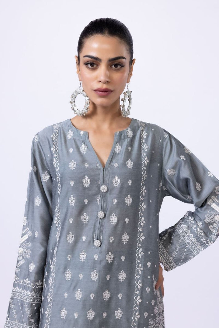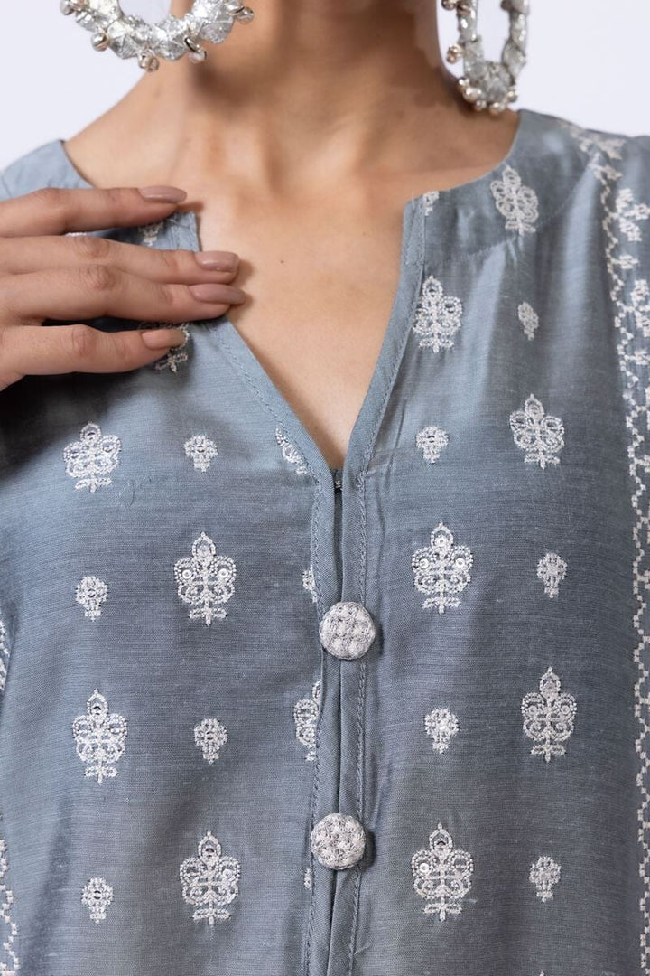 A long floral embroidered kurta featuring full sleeves and a round neckline with a V-cut.