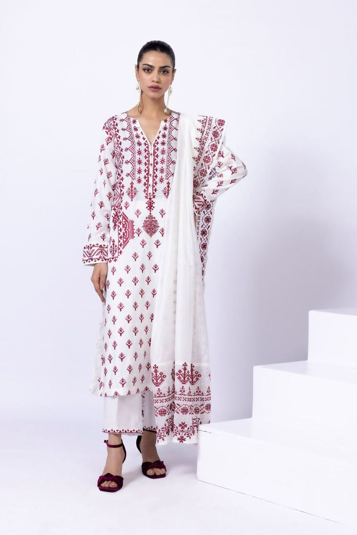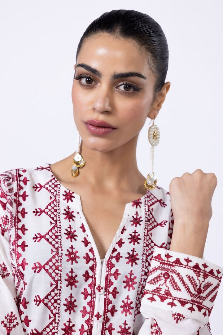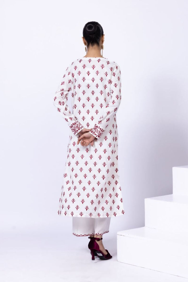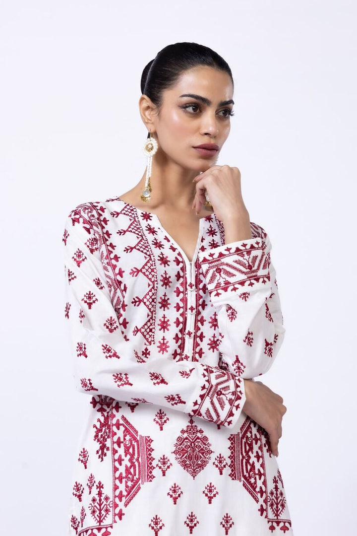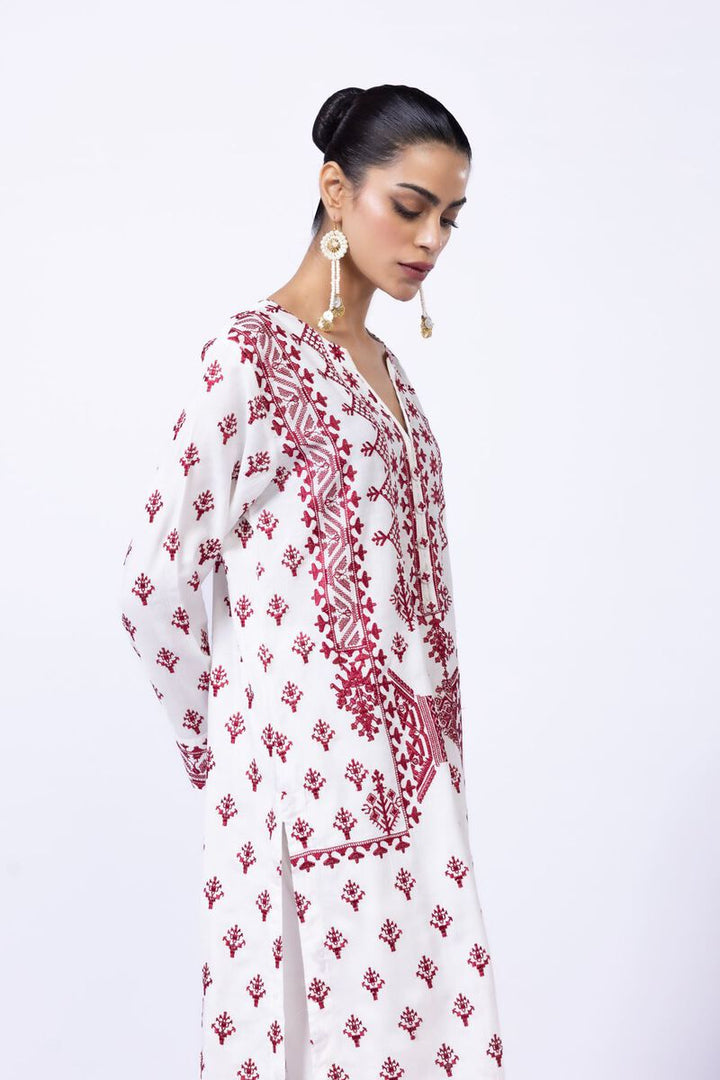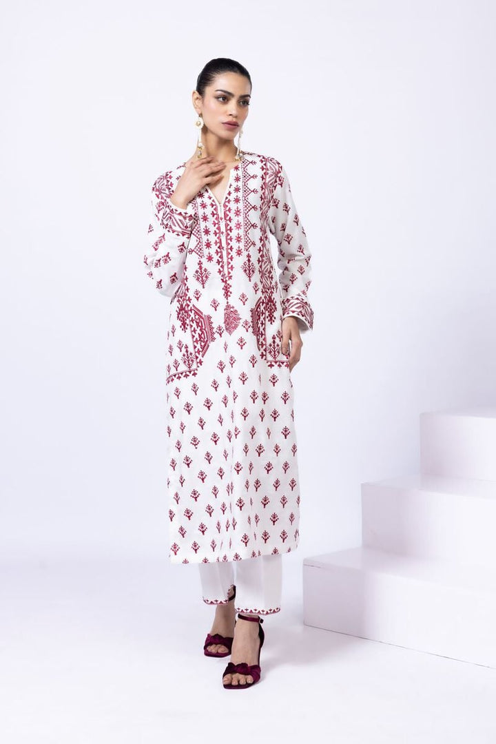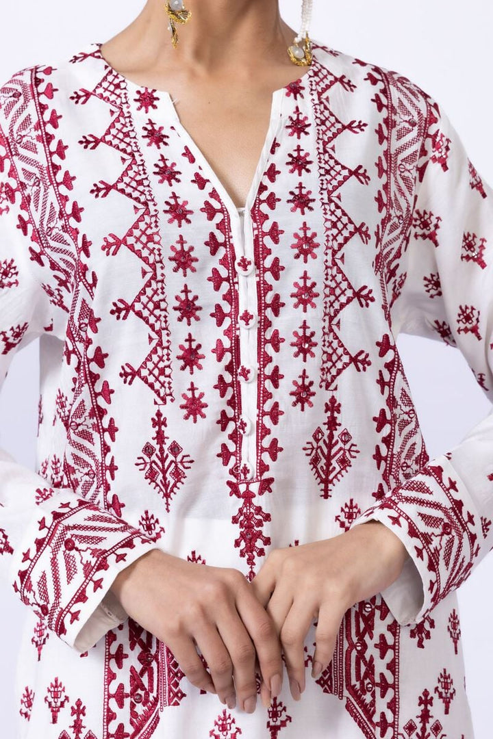 A long floral embroidered kurta featuring full sleeves and a round neckline with a V-cut.