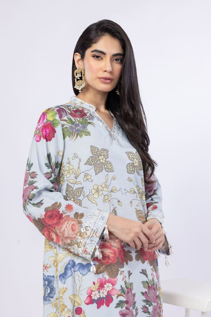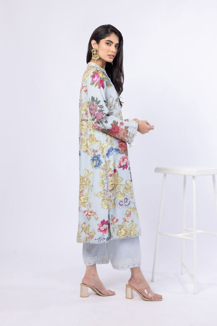 - Description: A long floral printed kurta featuring full embroidered sleeves, an embroidered band collar with mirror work detailing and lace on the hem.