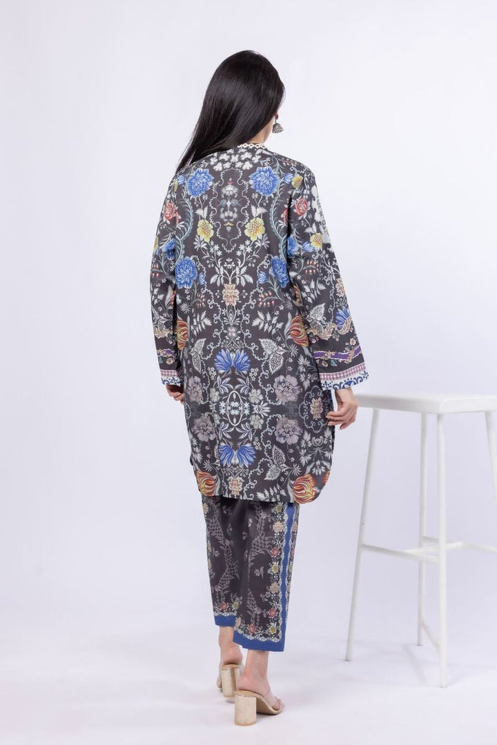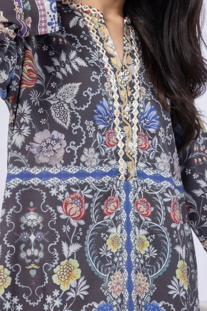 - Description: A short floral printed embroidered kurta featuring full sleeves and a round neckline with a V-cut.