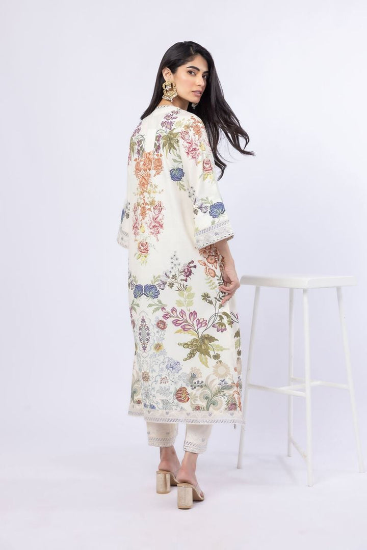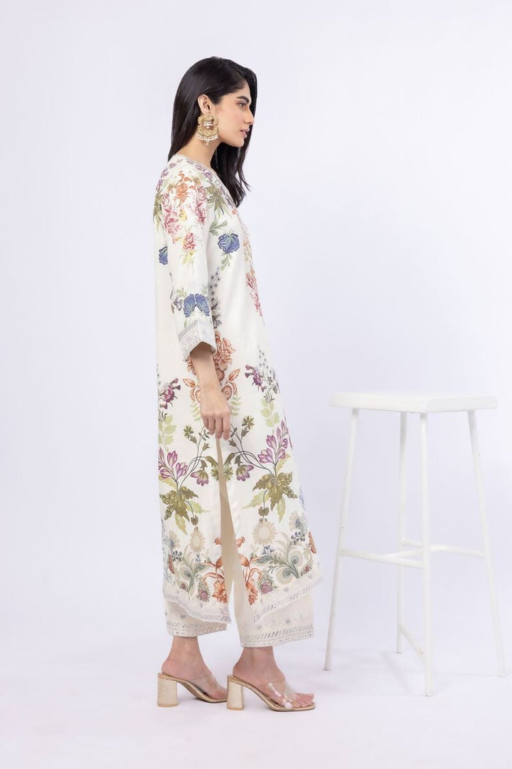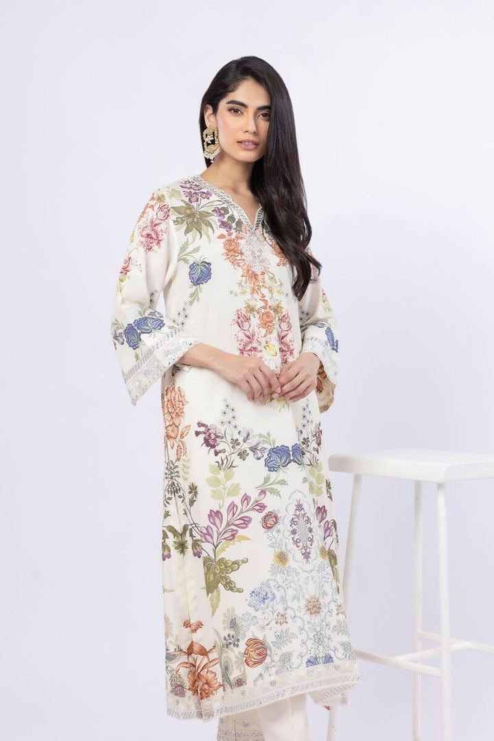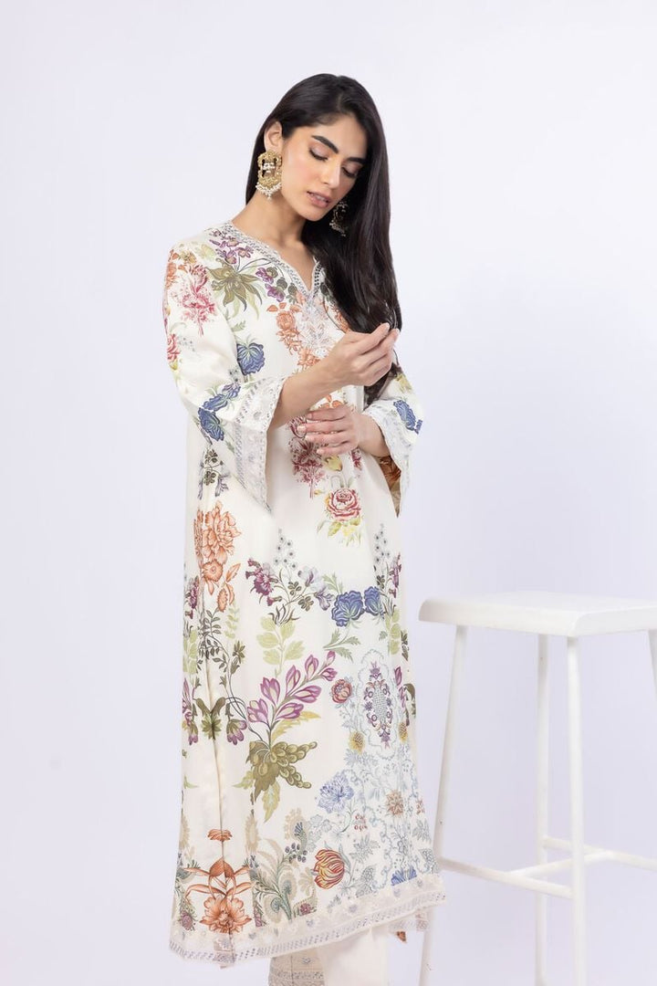 - Description: A long floral printed kurta featuring full embroidered sleeves, and a V-neckline with mirror work detailing and embroidery.
