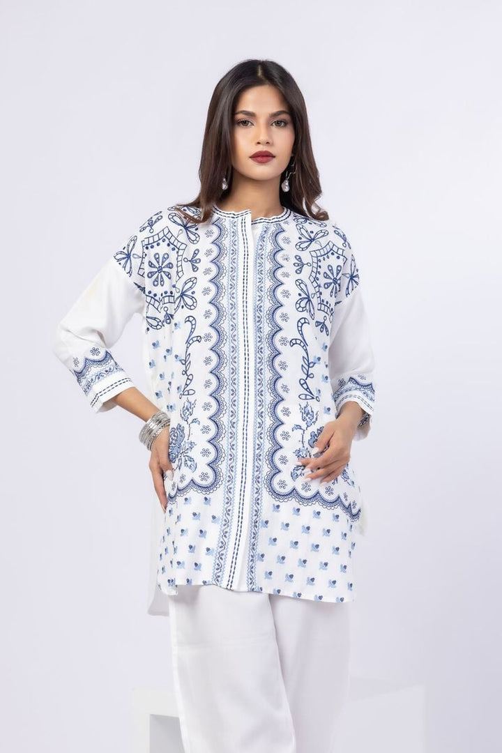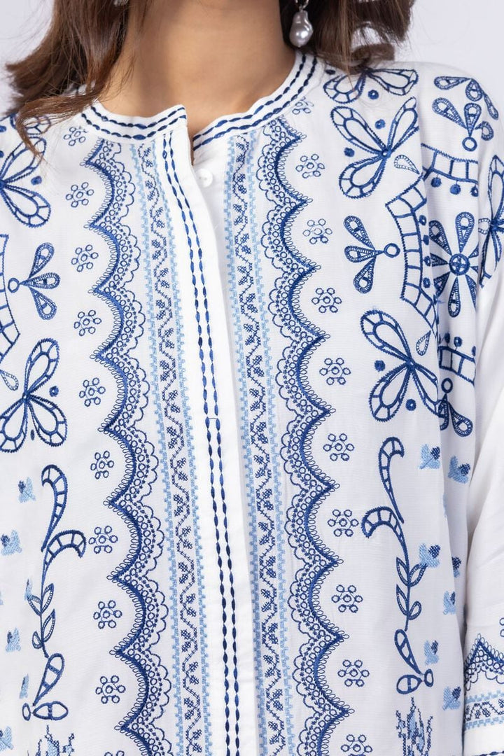 - Description: A solid embroidered kurta featuring three-quarter sleeves and a round neckline with a placket down the front.