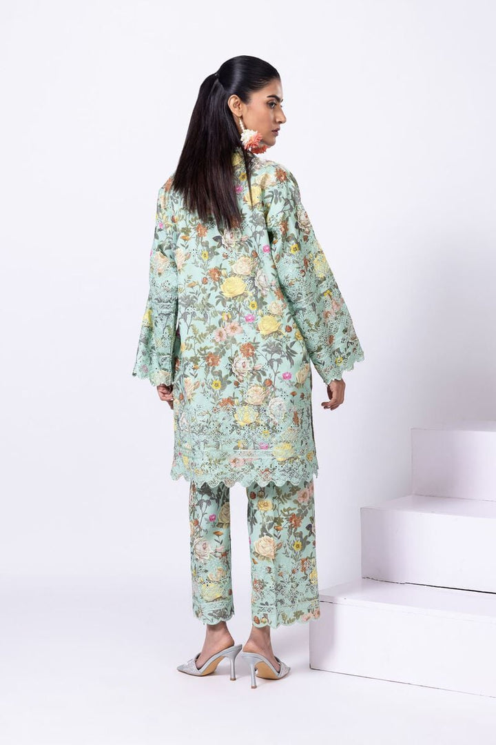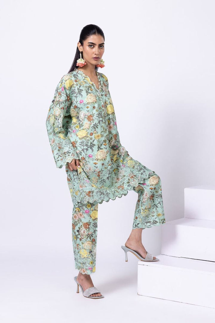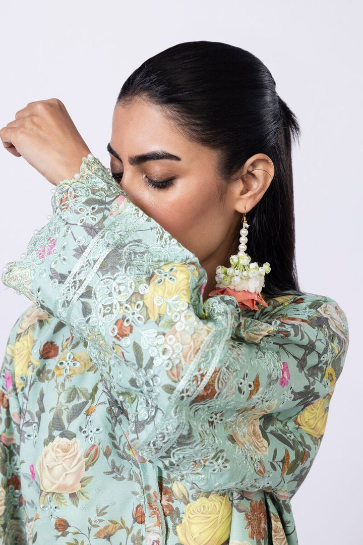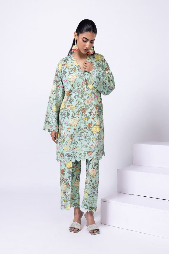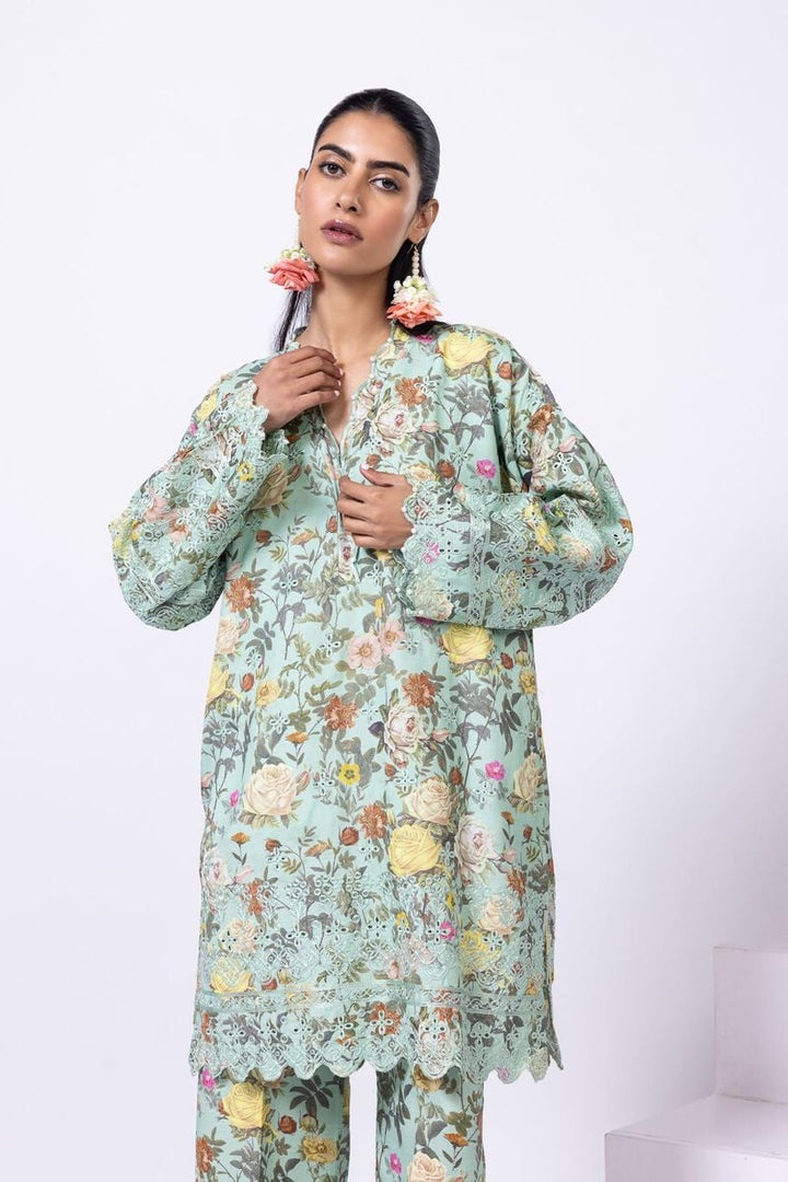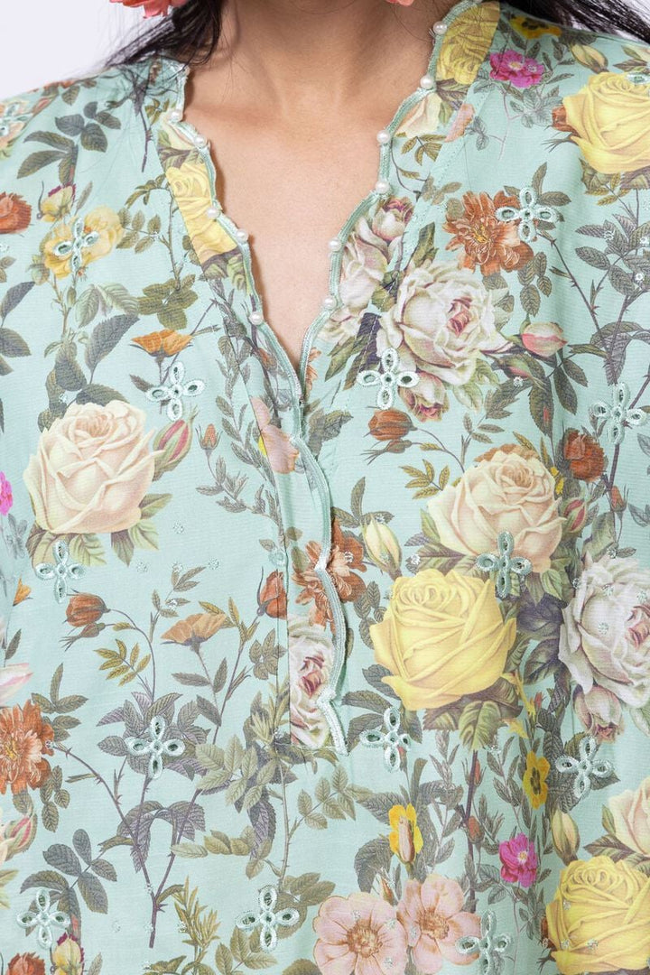 A short floral printed kurta with embroidered sleeves and a V-neckline.