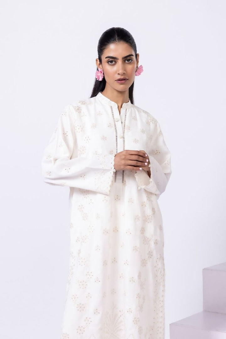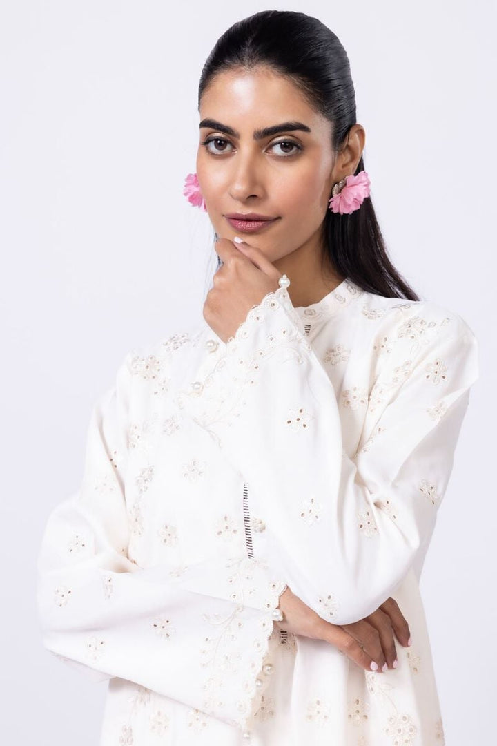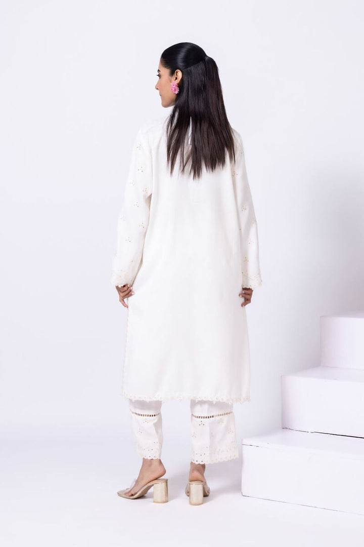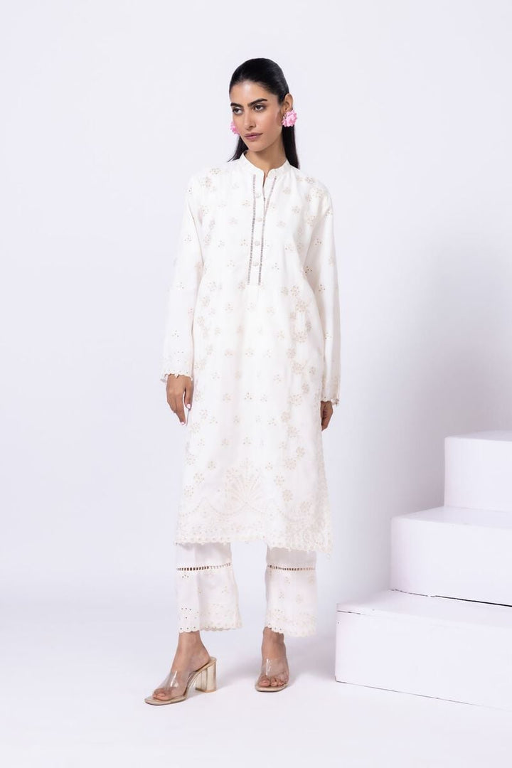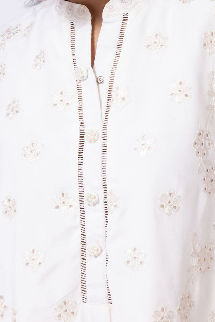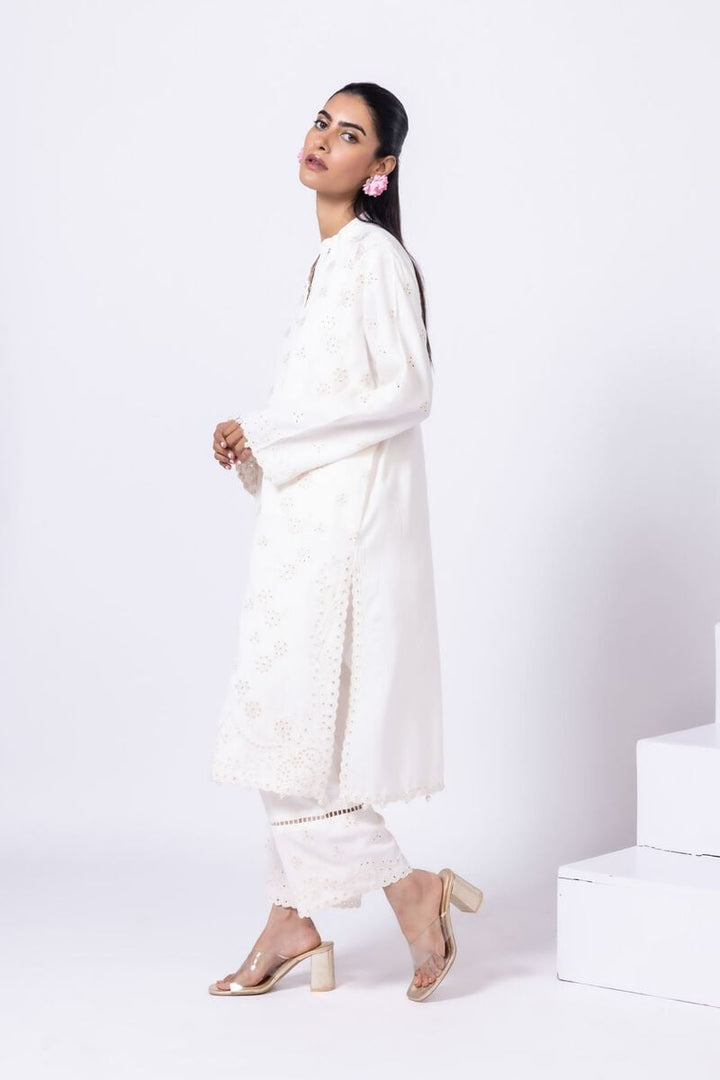 A long floral embroidered kurta featuring full scalloped sleeves with and a band collar with a V-cut.