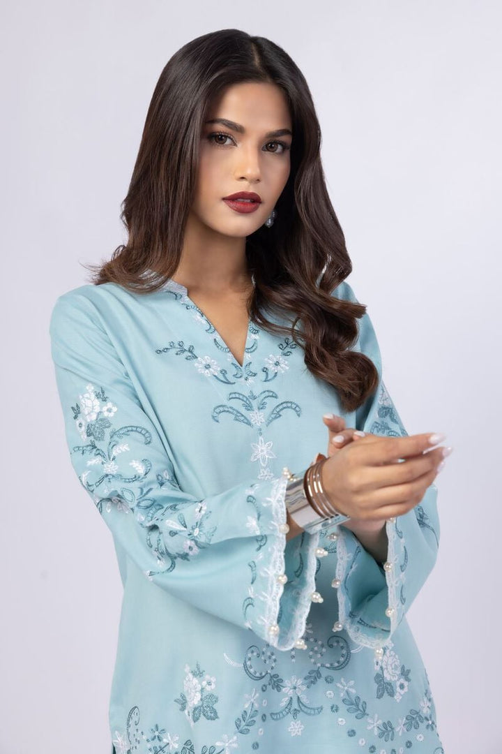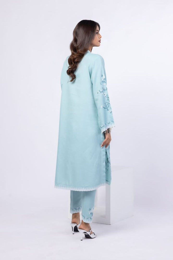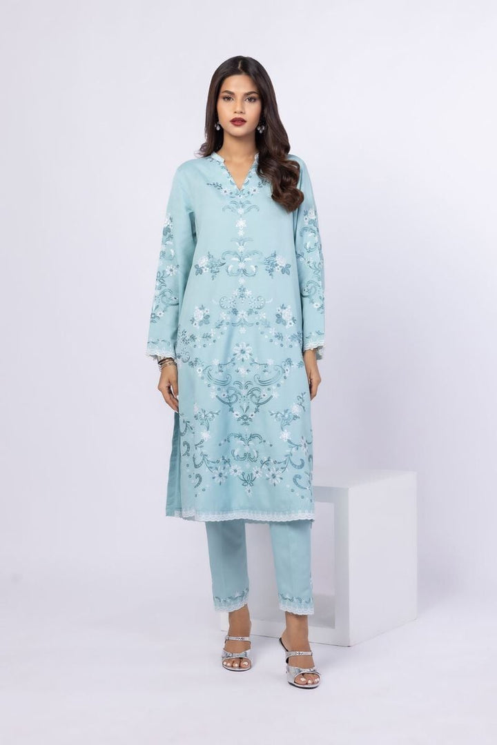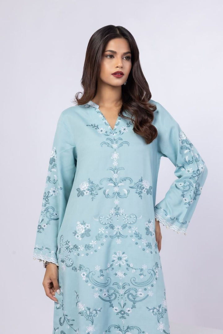 - Description: A long floral embroidered kurta featuring full sleeves with lace inserts and a band collar with a V-cut.