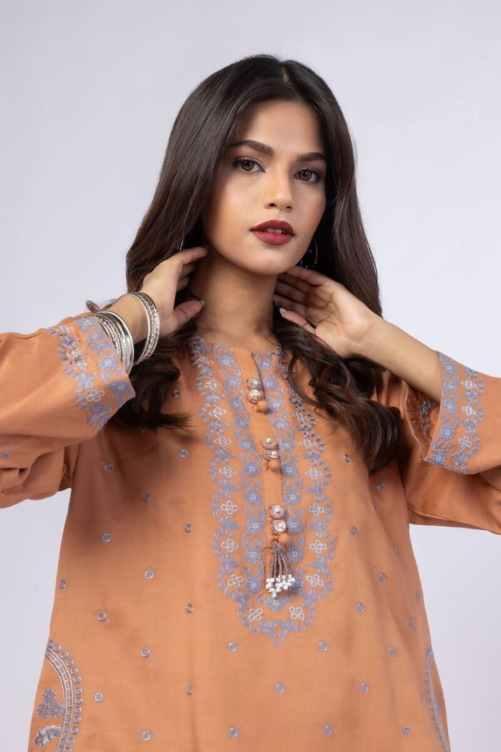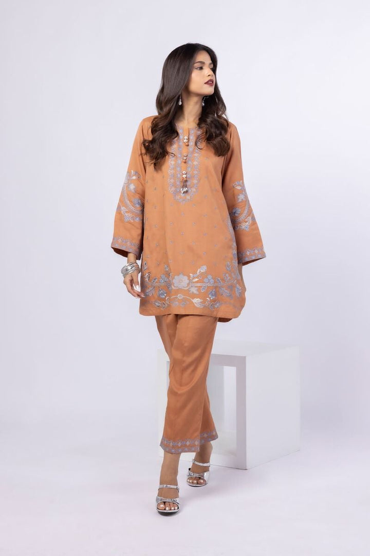 - Description: A short embroidered kurta featuring full sleeves, a round neckline and finishings on the front.