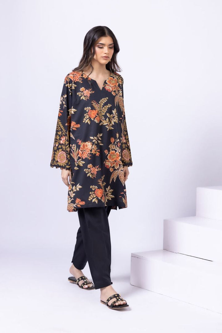 A short floral printed kurta featuring full sleeves and a round neck with a V-cut.