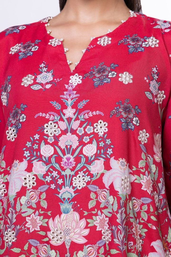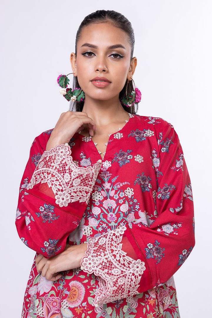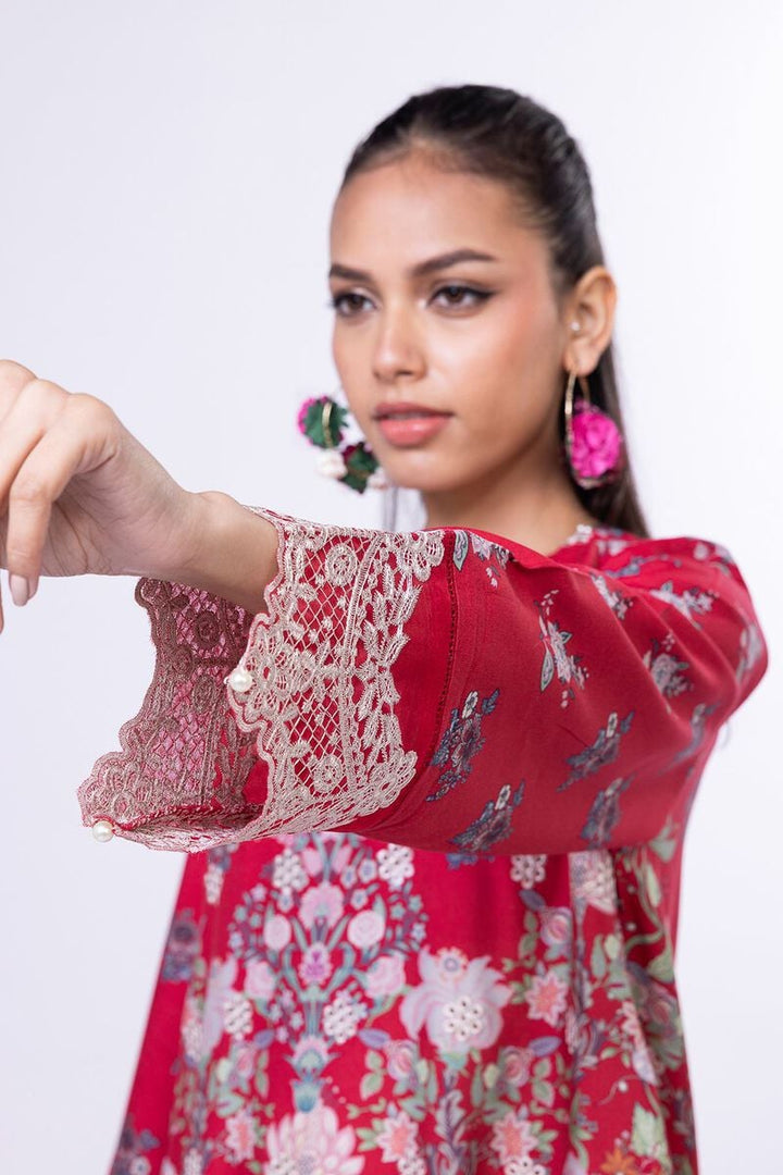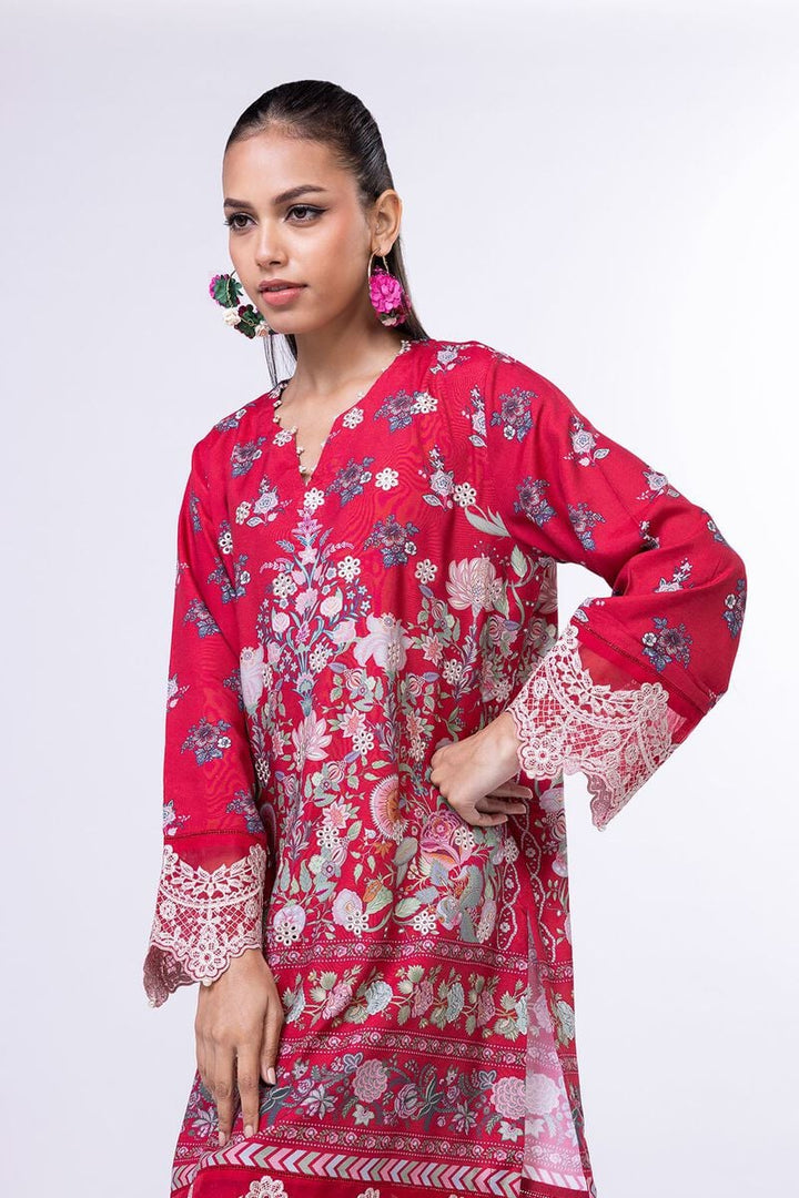 A printed kurta featuring an embroidered hem, full sleeves with lace inserts and a round neck with a V-cut.