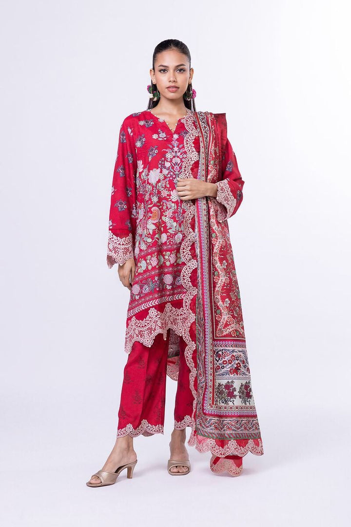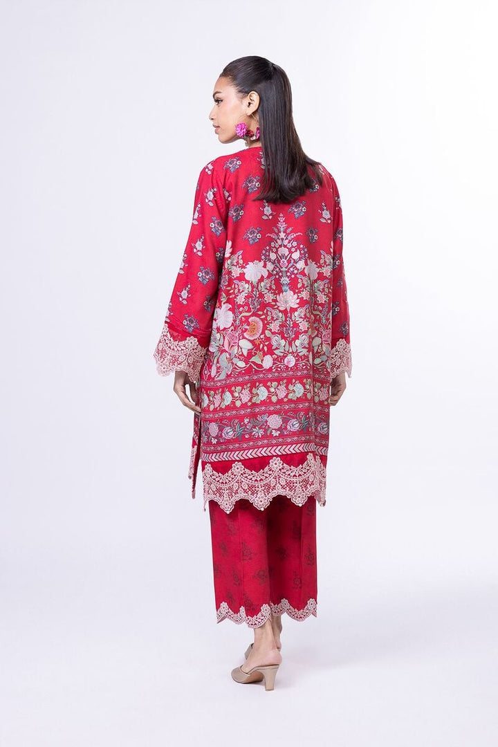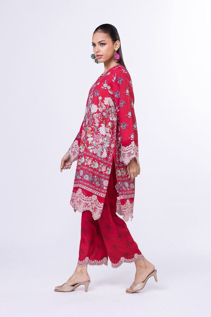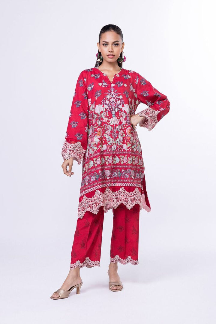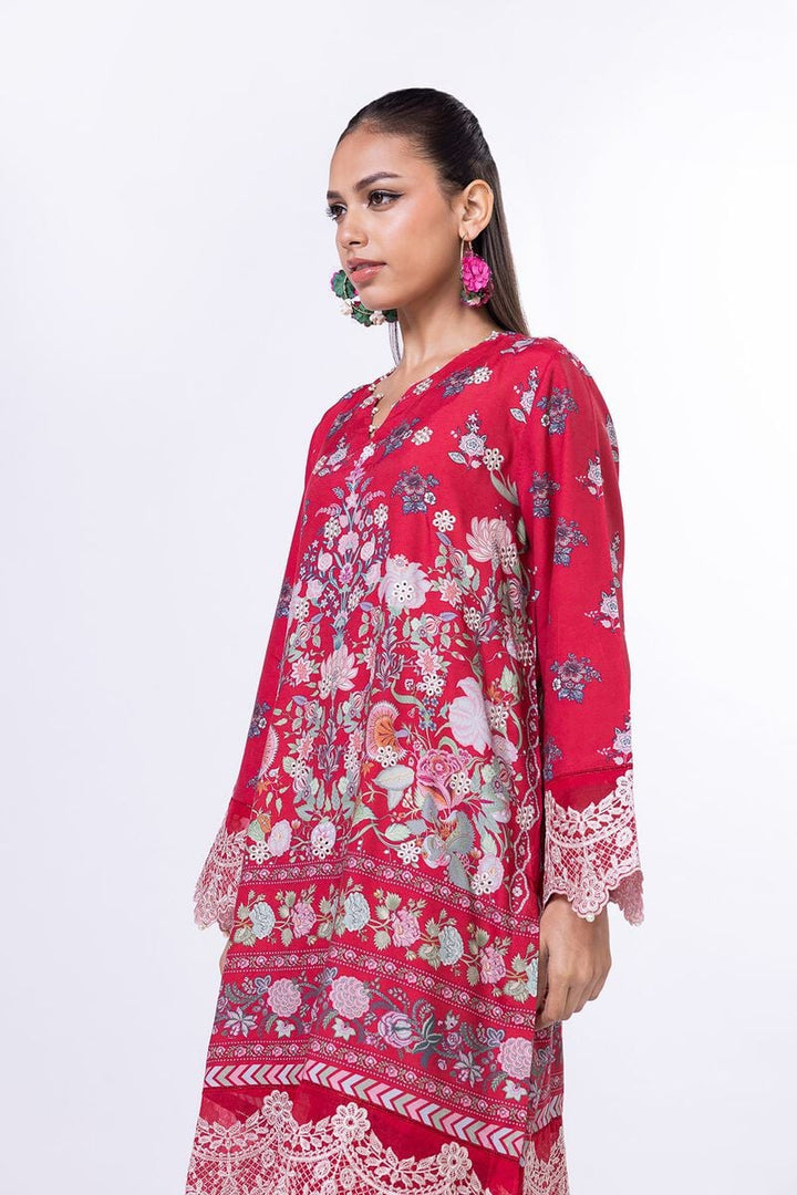 A printed kurta featuring an embroidered hem, full sleeves with lace inserts and a round neck with a V-cut.