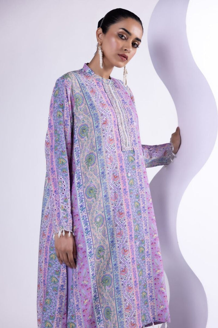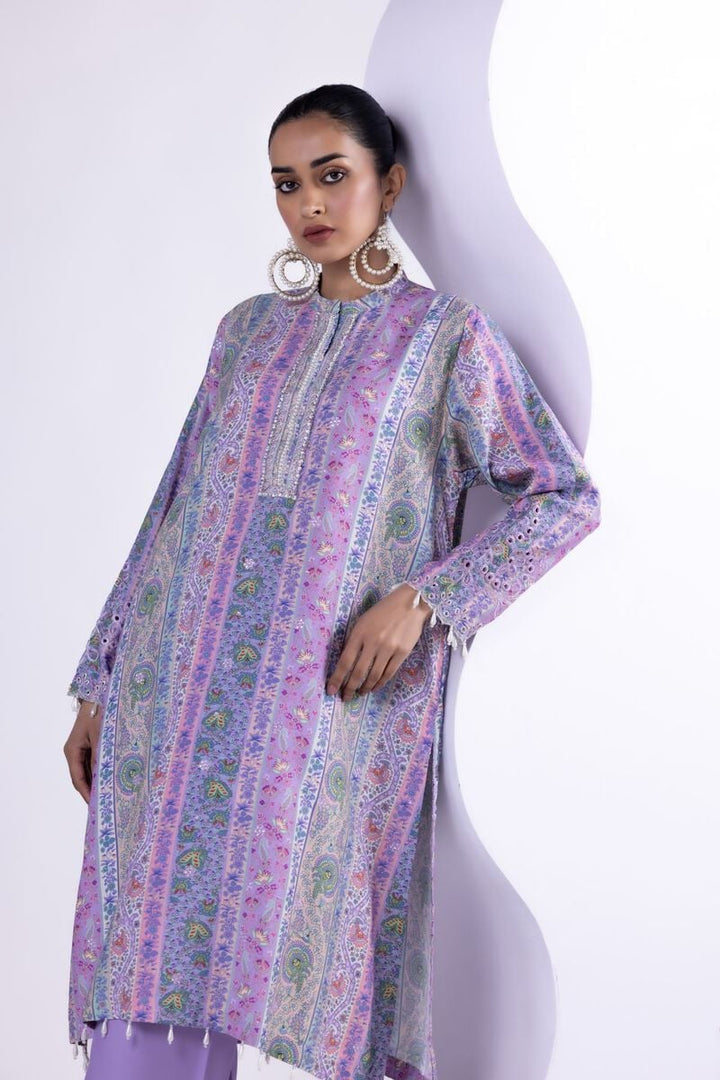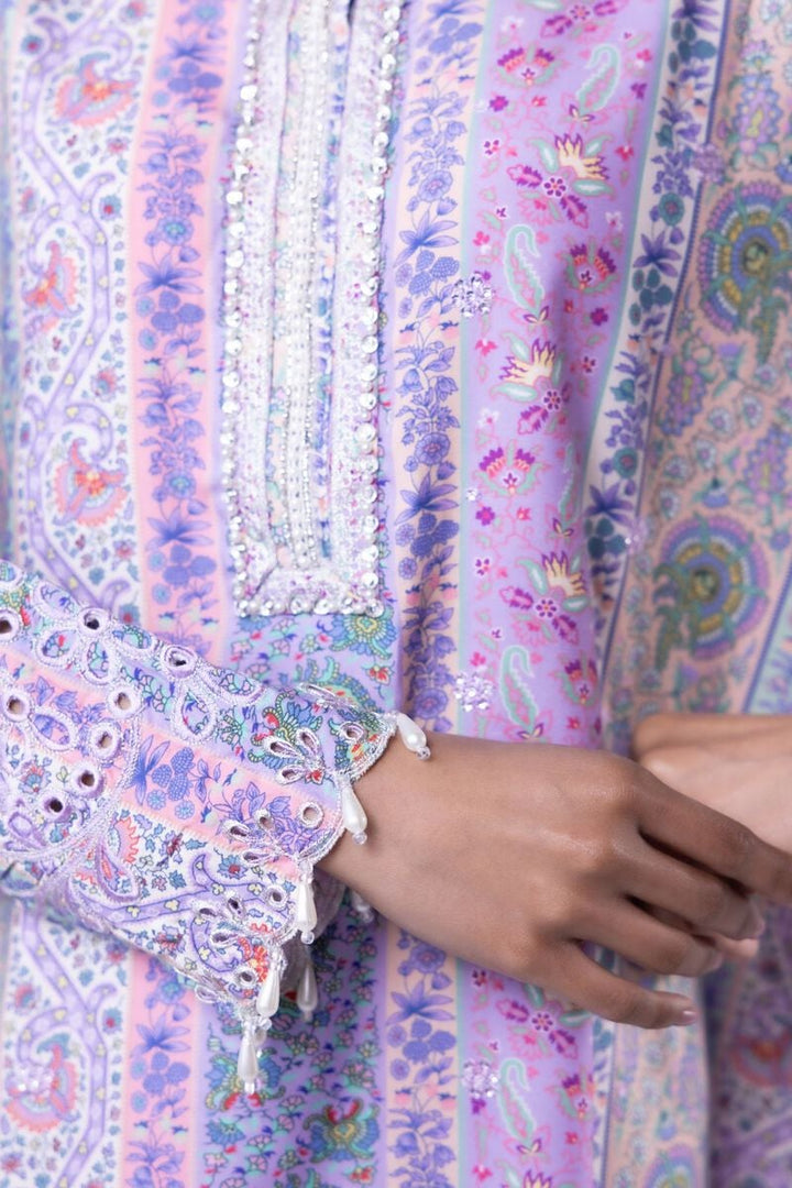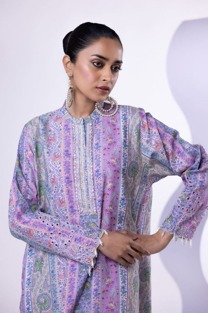 A floral print embroidered kurta featuring full sleeves and a round neckline.
