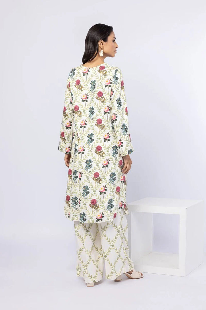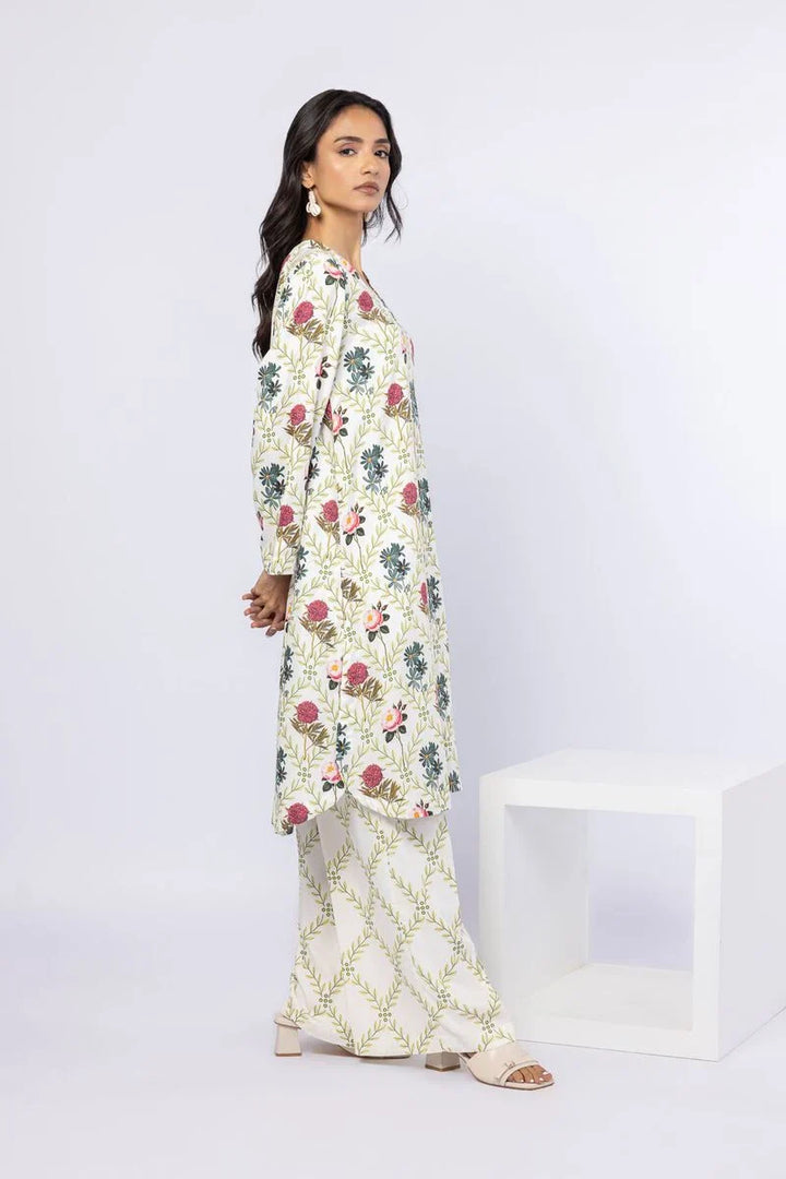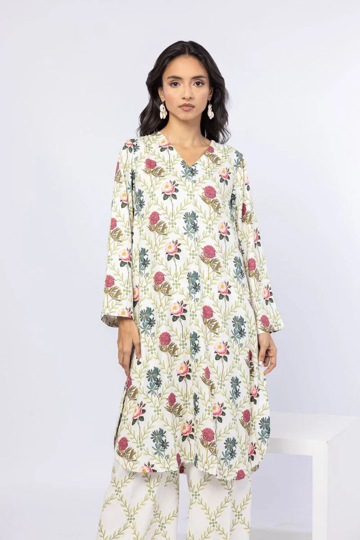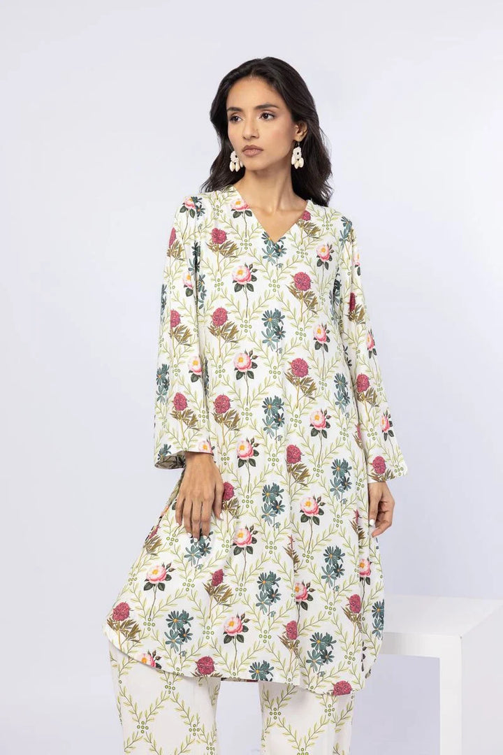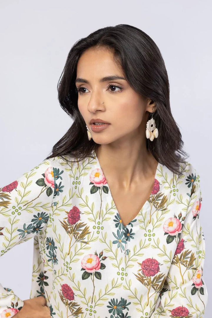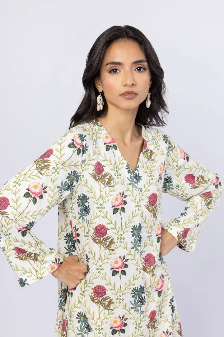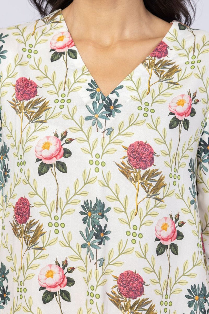 A long floral printed kurta featuring full sleeves, a neckline with a V-cut and a rounded hem.