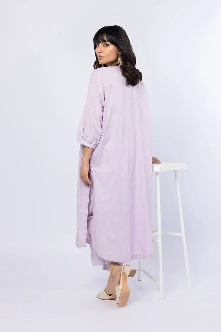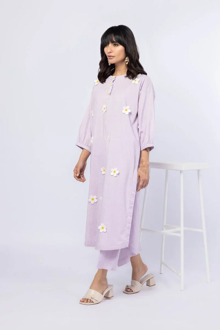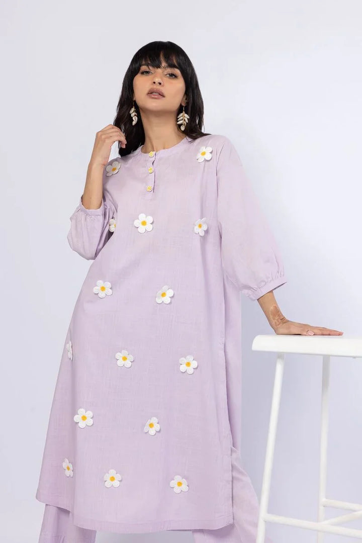 A long solid kurta featuring three-quarter puffed sleeves, a round neckline with buttons, and floral crochet detailing on the front.