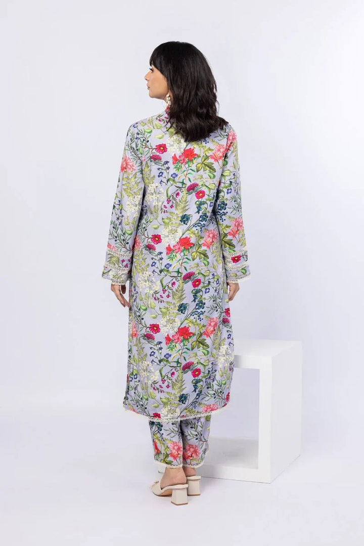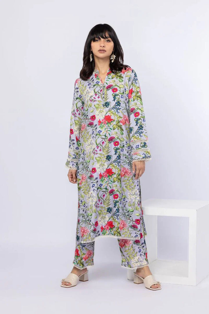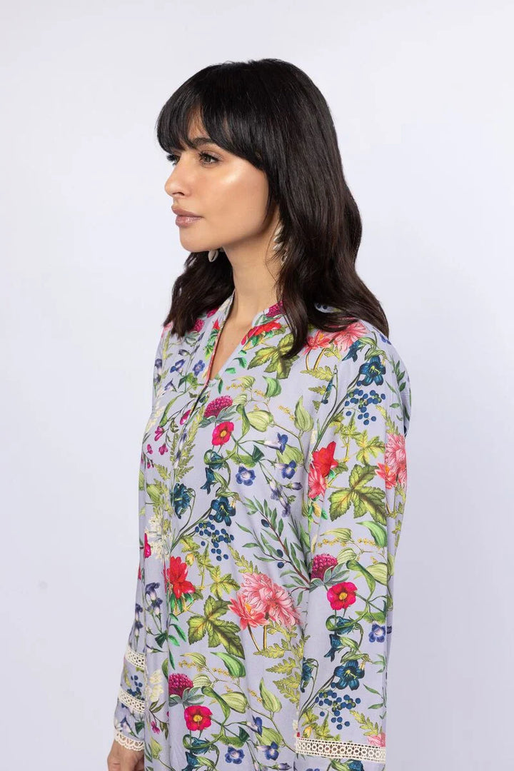 A long floral printed kurta featuring full sleeves with lace detailing and a band collar with a V-cut.