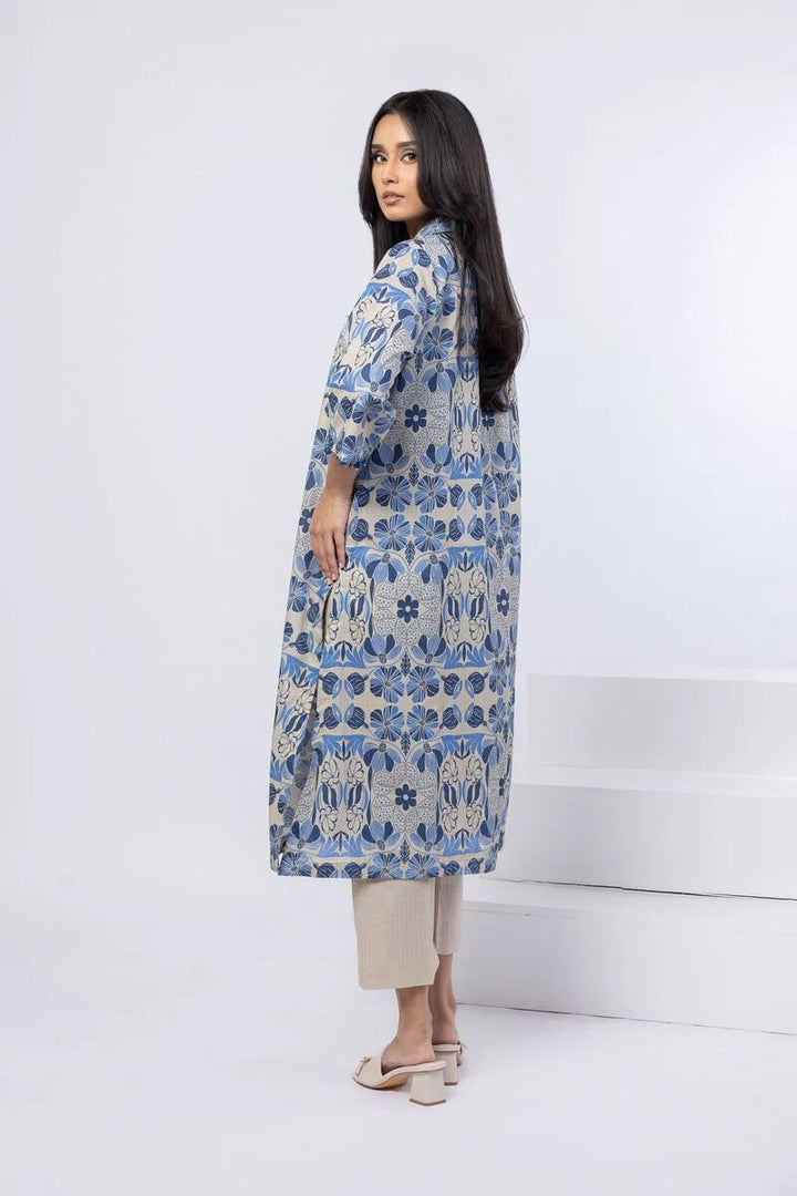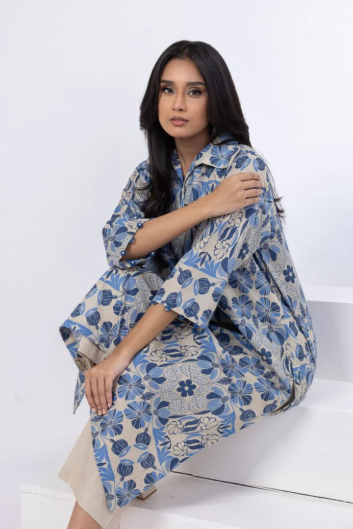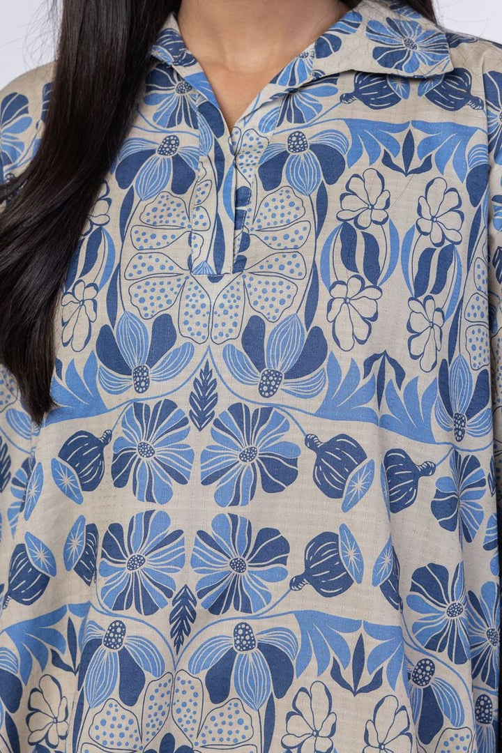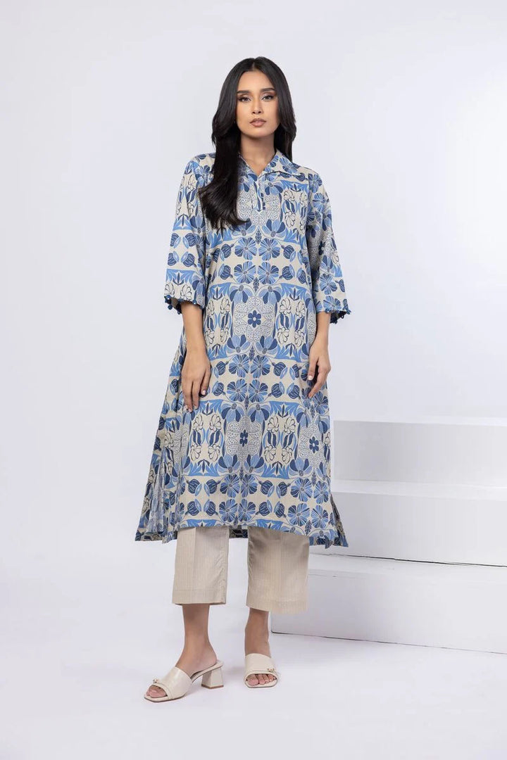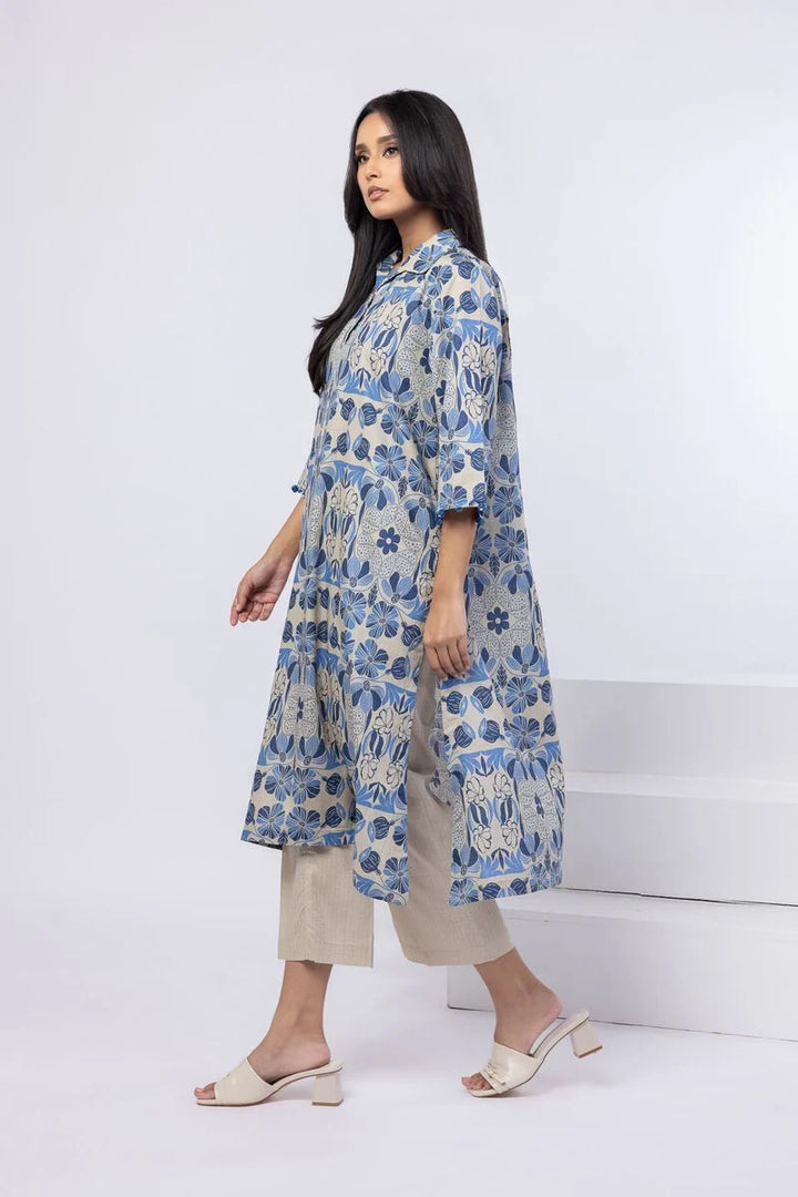 Description: A long floral printed kurta featuring short sleeves with bead detailing and a wing collar.