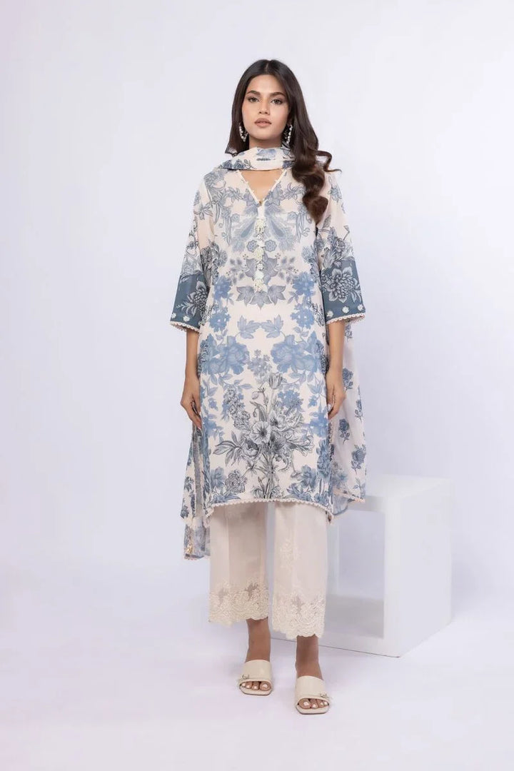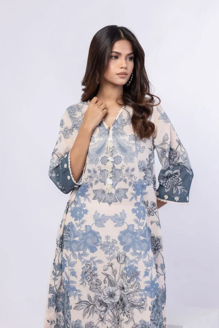 A long floral printed kurta featuring full sleeves with lace detailing, a neckline with a V-cut and embellishments on the front.