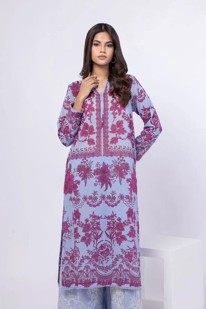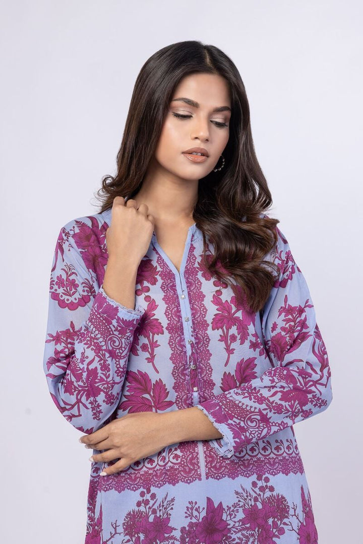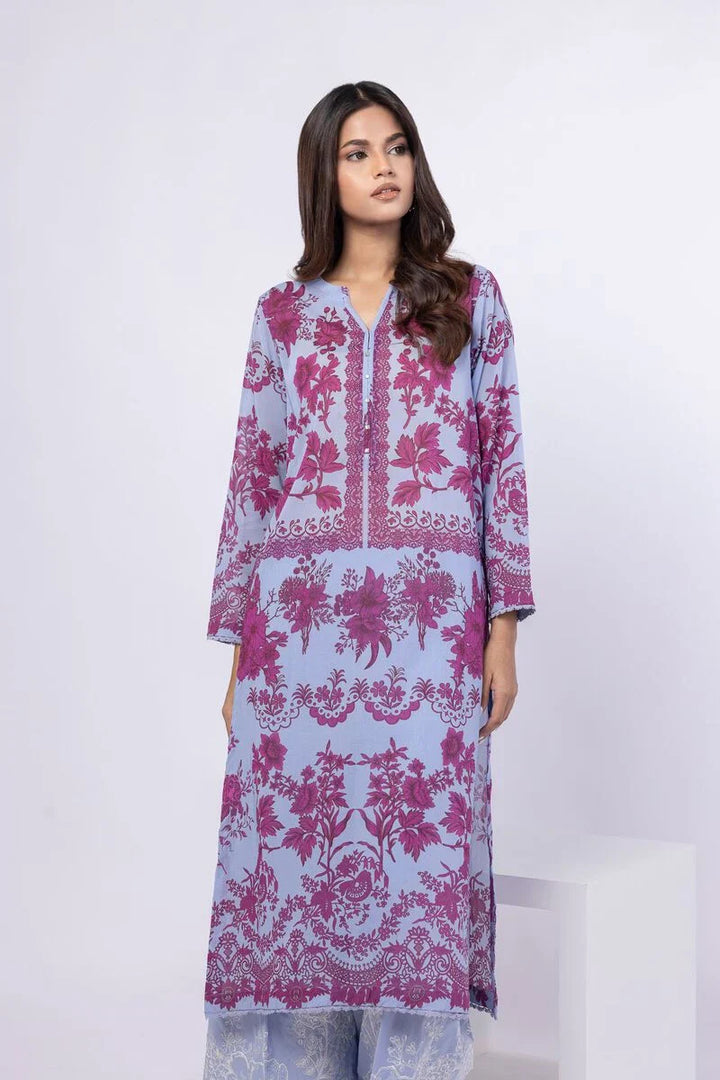 A long floral printed kurta featuring full sleeves, a band collar with a V-cut and lace detailing on the hem.