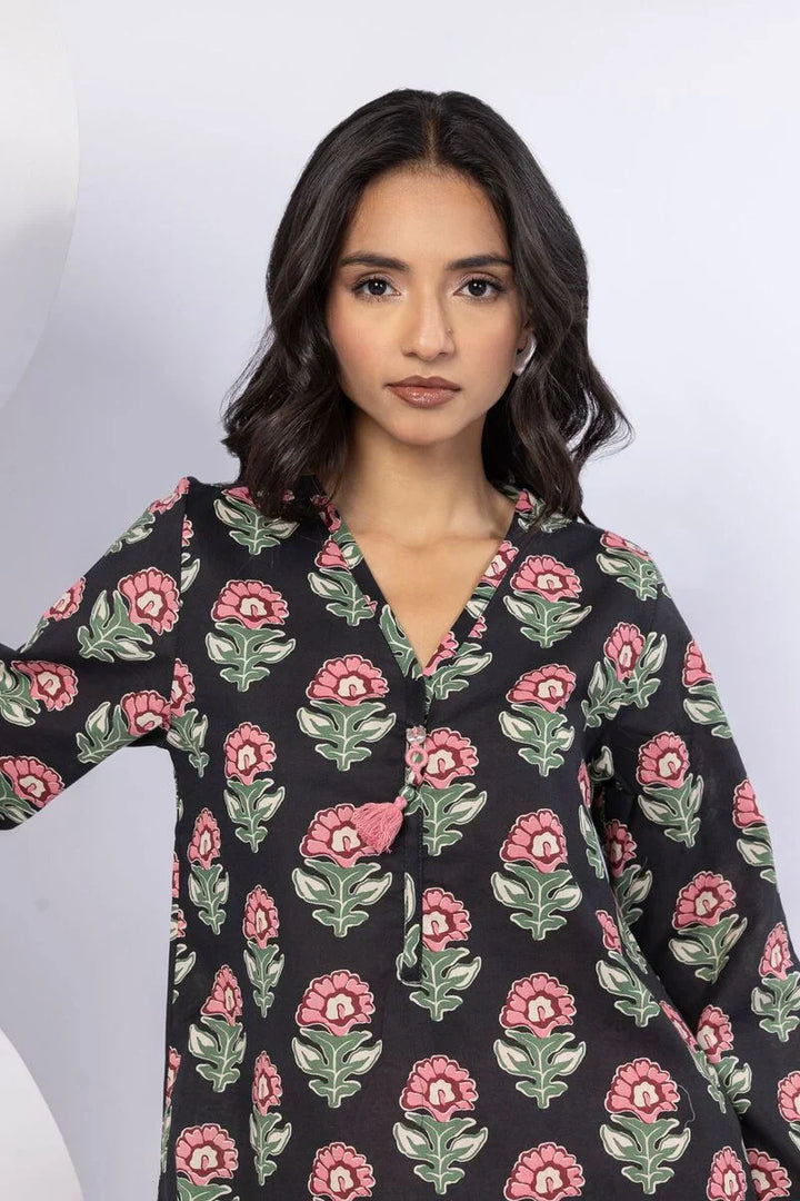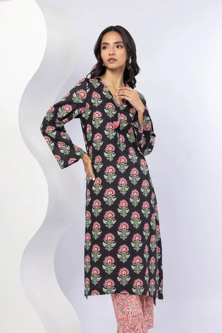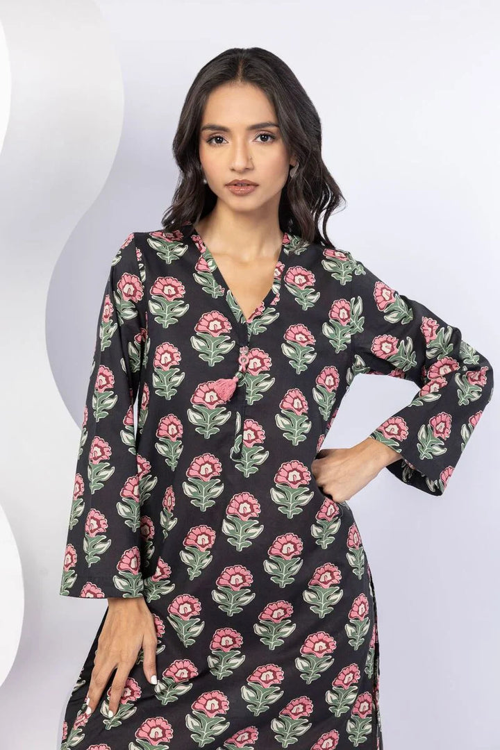 A long floral printed kurta featuring full sleeves, a band collar with a V-cut and lace detailing on the hem.